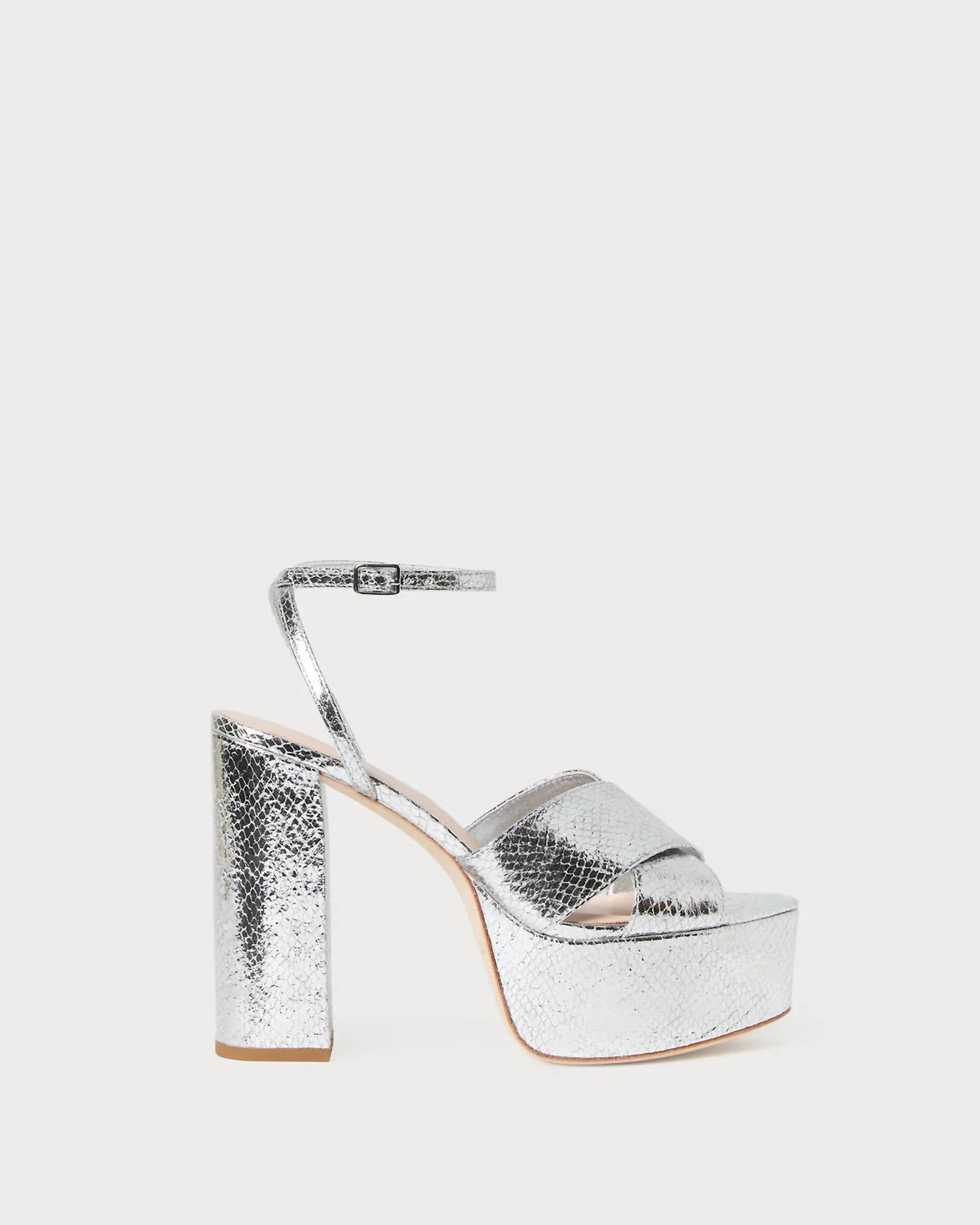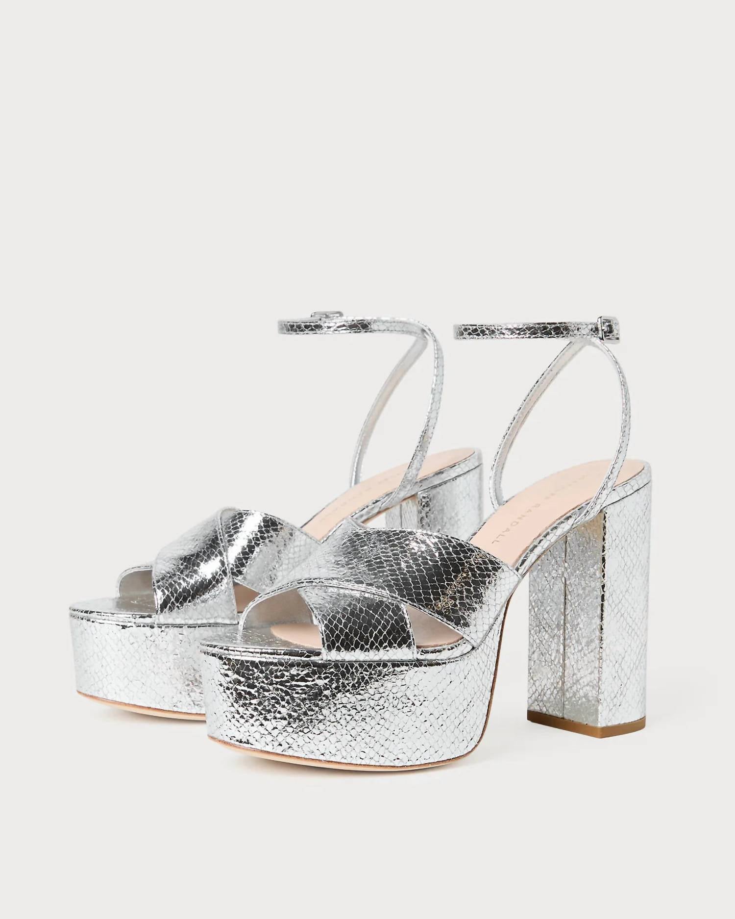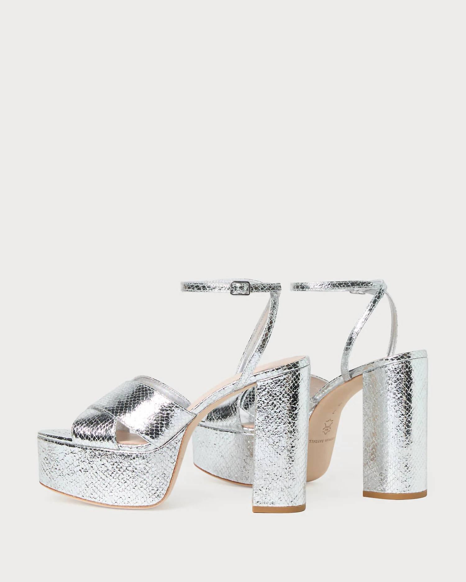This sandal will take you from brunch to dinner and everything in between. Introducing the Women's Loretta Snake Platform Sandal by Loeffler Randall, a striking addition to your footwear collection. Crafted from 100% goat leather upper and 100% bovine leather outsole, this sandal features a silver metallic snake-embossed design. With an open toe and a 4.75-inch heel accompanied by a 1.5-inch platform, it ensures both elegance and height for special occasions. The sandal includes an adjustable buckle ankle strap and a padded leather footbed with a gold-stamped logo. Care instructions suggest keeping it away from water and sunlight, while using a leather conditioner for maintenance.
