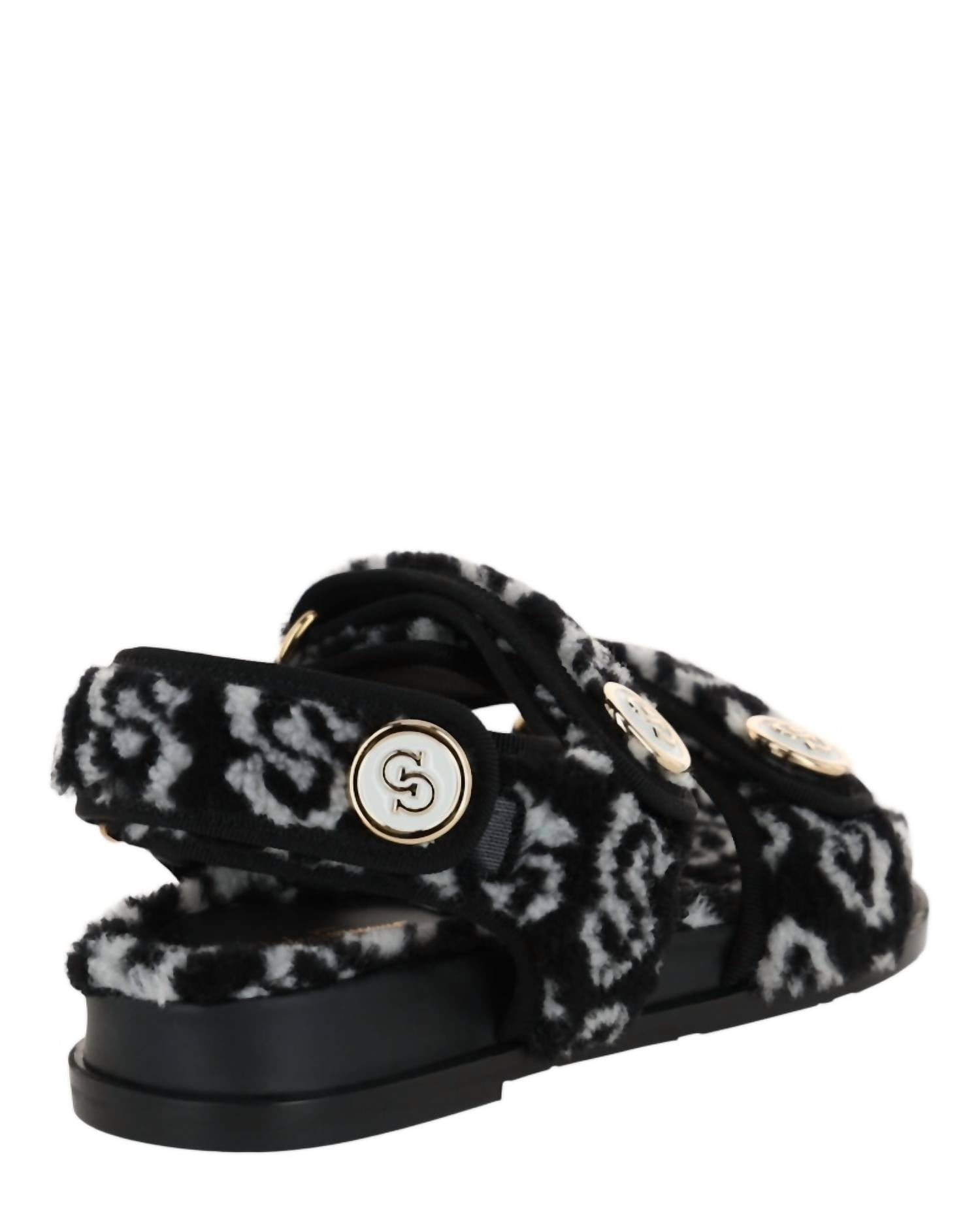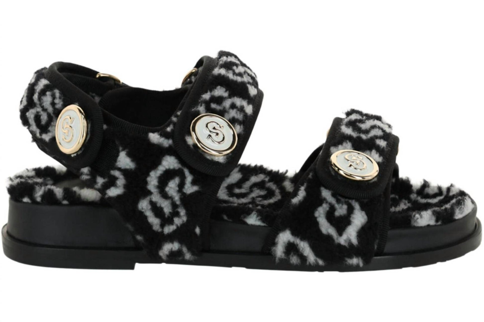 This sandal will take you from brunch to dinner and everything in between. Discover the Women's Keita Straps Sandals by Salvatore Ferragamo, an elegant choice for winter travels and New Year's Eve celebrations. These sandals feature dual hook-and-loop vamp straps adorned with glossy enamel and gancini buckles, complemented by a cozy genuine shearling fleece upper. Crafted in Italy, they boast a round toe and gold-tone hardware, set on a 1.5" flat heel with a 1" platform height for comfort. Composition includes a wool blend upper and a synthetic sole, making it both stylish and durable. Spot clean for maintenance.