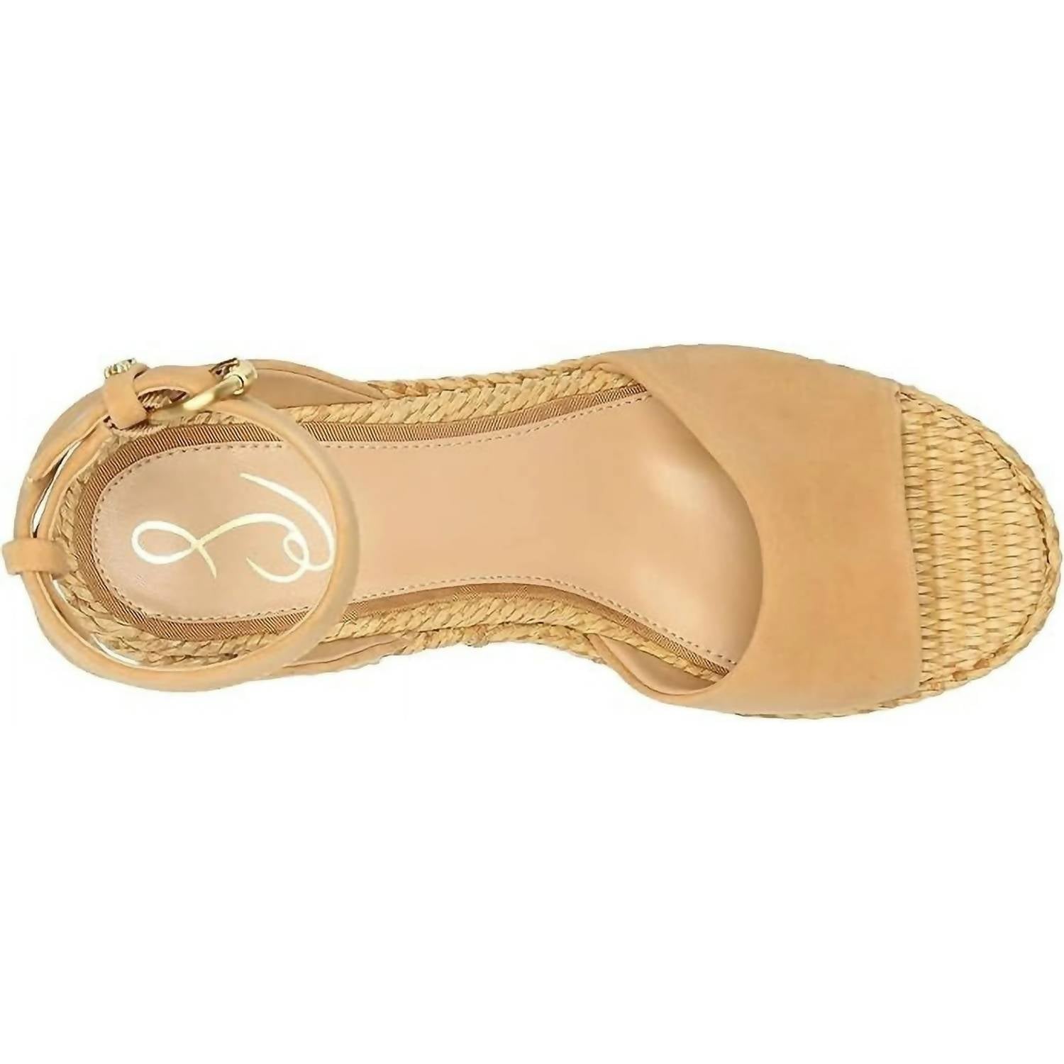 Flowy dresses, cropped pants, and even jumpsuits... this sandal works with them all! Step into elegance with the Women's Immie Wedge Platform Sandal by Sam Edelman, perfect for summer engagements. Featuring fine woven geometric platforms and a structured block heel, these sandals in Sand Dune are crafted from a combination of fabric and leather with a synthetic insole. The open toe design complements the sophisticated 4-inch heel height and 1.25-inch platform height. Whether it's boardroom-ready suiting or chic after-hours attire, these sandals are your go-to choice for stylish comfort.