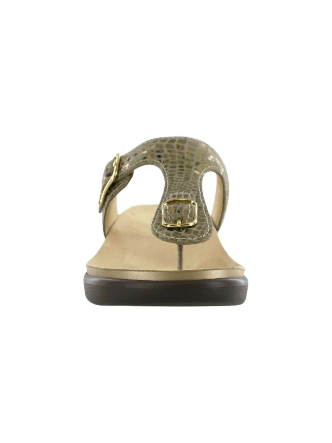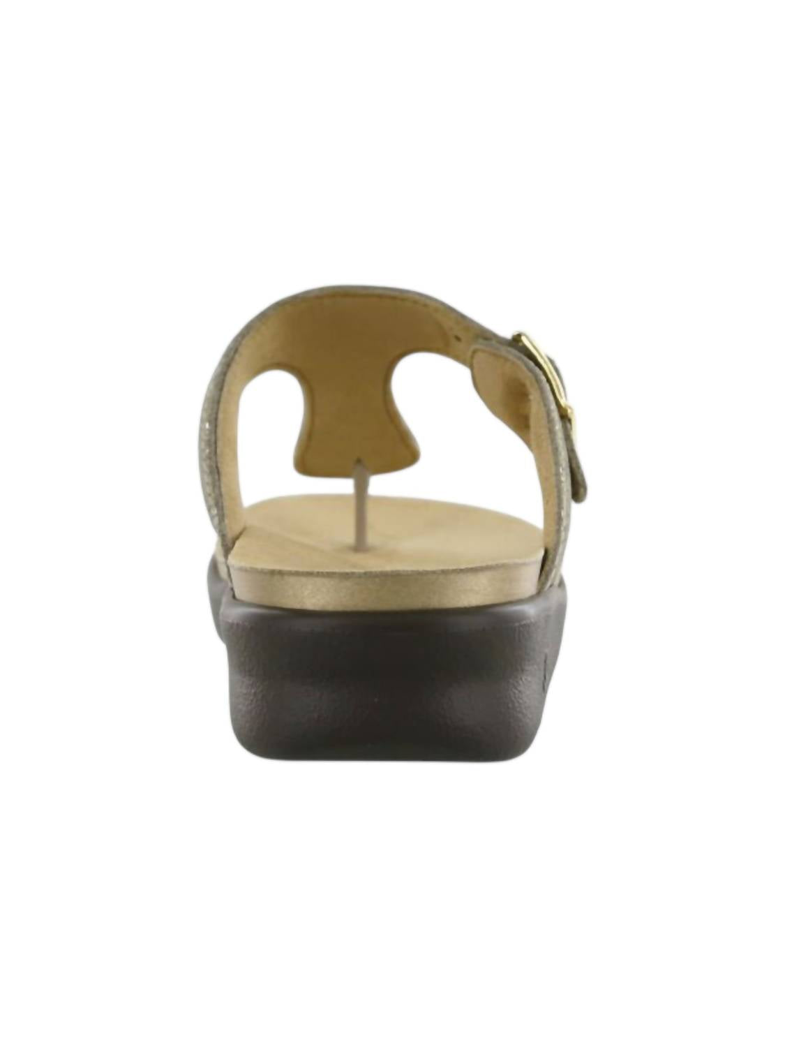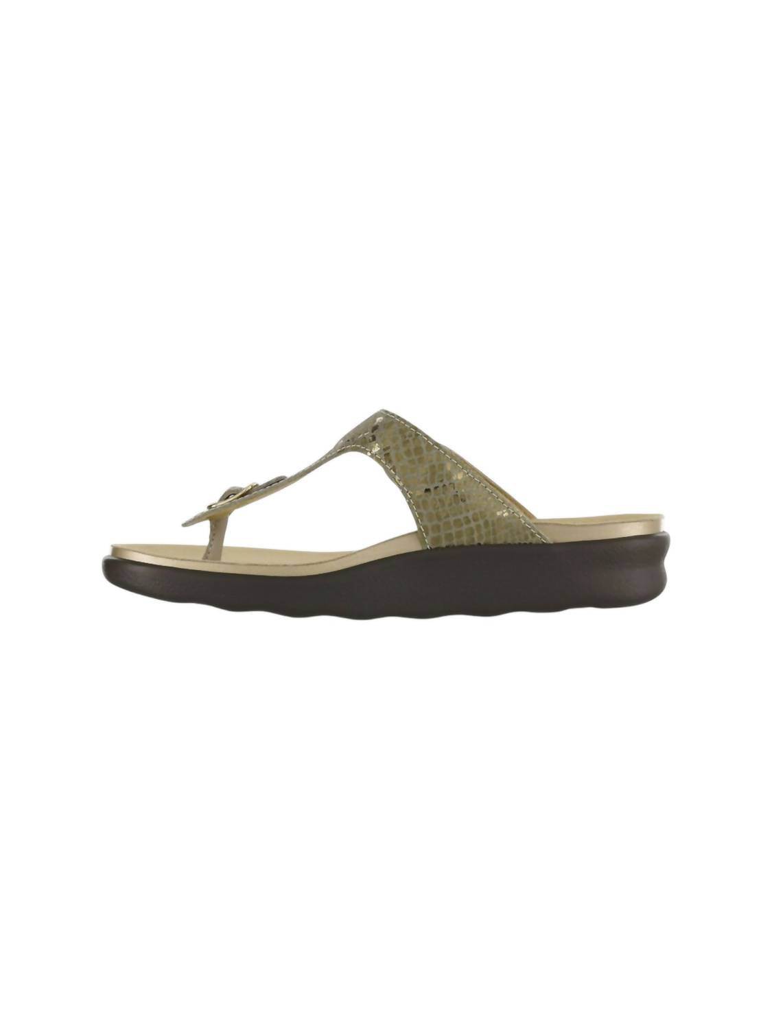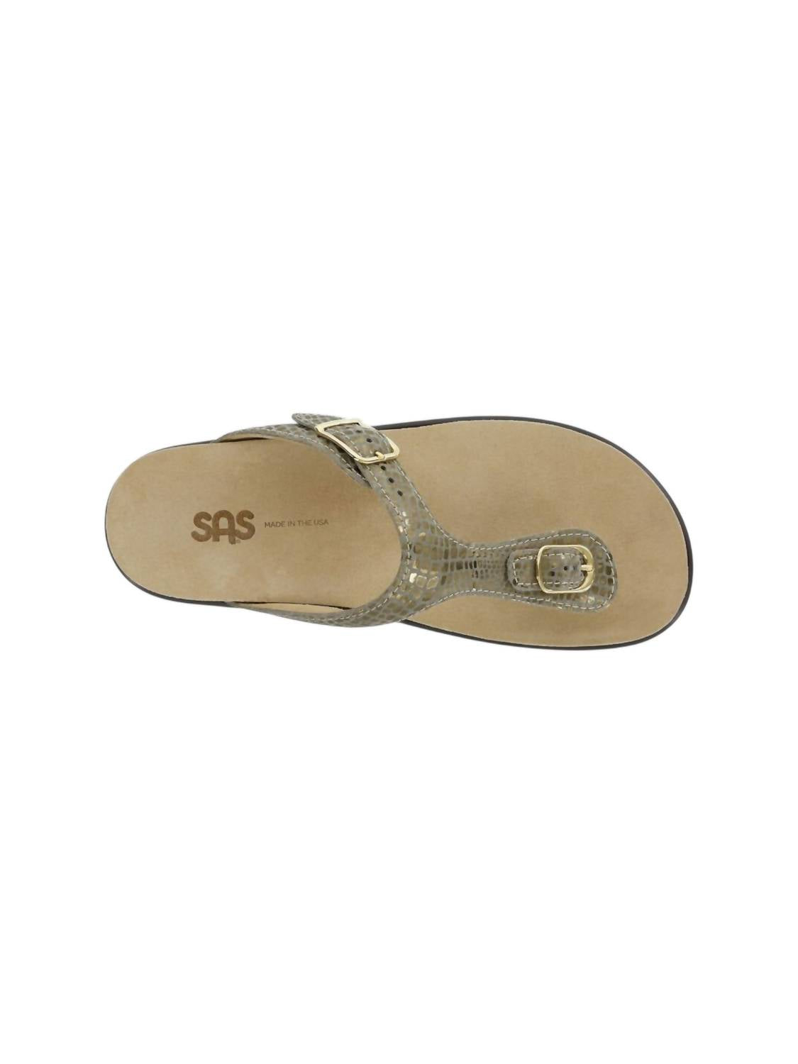 Flowy dresses, cropped pants, and even jumpsuits... this sandal works with them all! Discover the Women's Sanibel T-strap Slide Sandals by SAS, perfect for those seeking style and comfort. The genuine leather upper offers a range of colors and textures, while the adjustable buckle and toe-post ensure a customized fit. These sandals feature a contoured molded polyurethane insole with TRIPAD® Technology for superior support, as well as a cushioning outsole for lasting comfort. With a low heel height of 1.125", these slip-ons offer both stability and elegance for all-day wear.