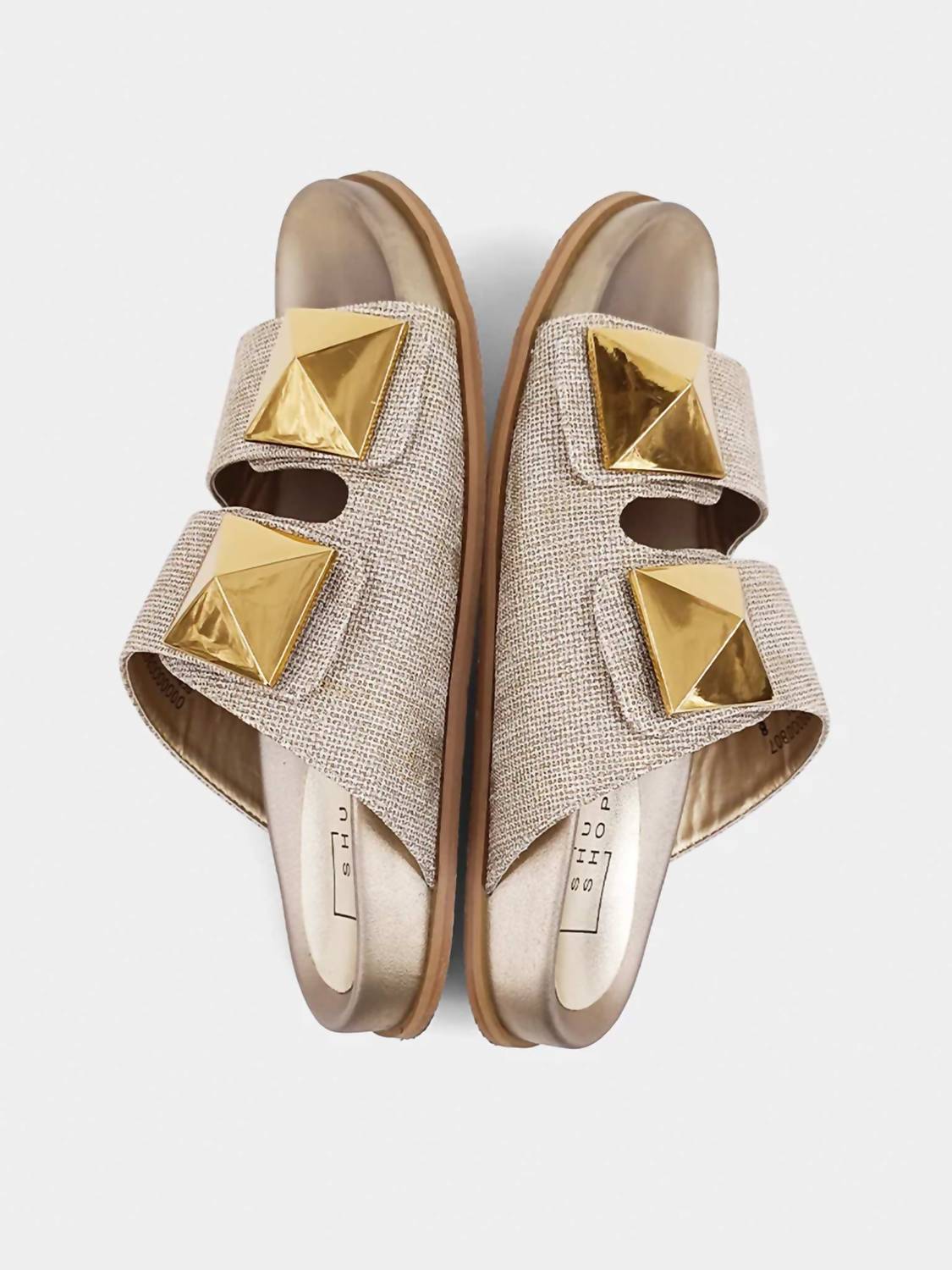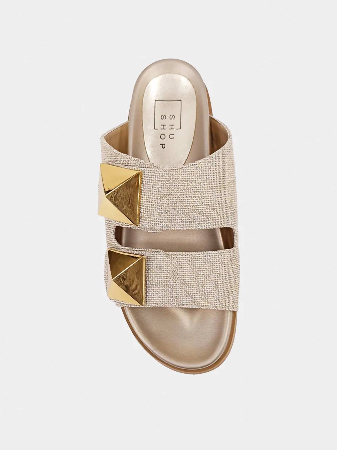 Classicly cute and all-day-wearable. We love this sandal. Introducing the Women's Bernarda Woven Slide by SHU SHOP, a stylish gold sandal perfect for the summer season. Featuring an open toe and flat heel with a slip-on design, these sandals are crafted from faux leather with a chic woven texture. The molded footbed ensures ultimate comfort, while oversized metallic gold studs add a bold touch. Ideal for travel and minimalist trends, these medium-width slides seamlessly enhance any warm-weather wardrobe.