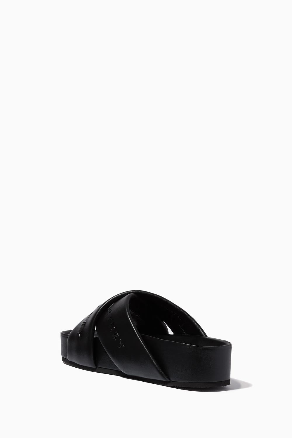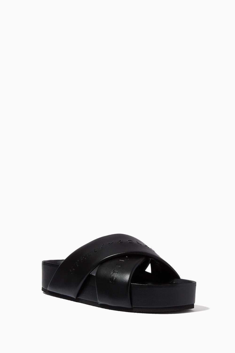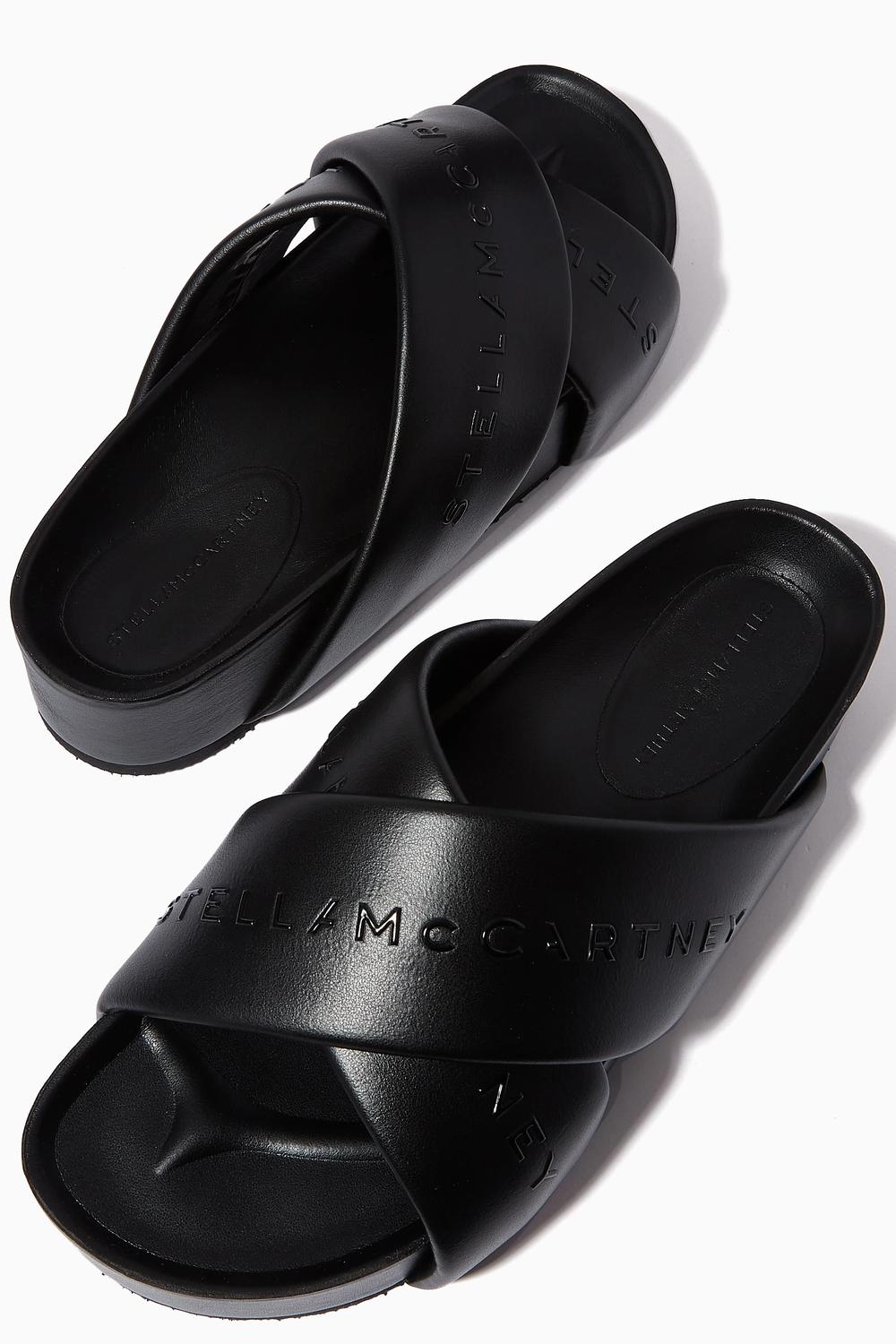Classicly cute and all-day-wearable. We love this sandal. Step into modern elegance with Stella McCartney's Women's Signature Eco Alter Mat Slides in classic black. Featuring crossover straps and a micro-injected logo, these sandals boast a 1.6" platform heel made from solvent-free Alter Mat. Crafted from 100% Polyurethane and Rubber, they are designed in Italy with a bio-based lining for a sustainable touch. Ideal for spring travel, these slides offer a minimalist style with their open toe and microporous outsole.