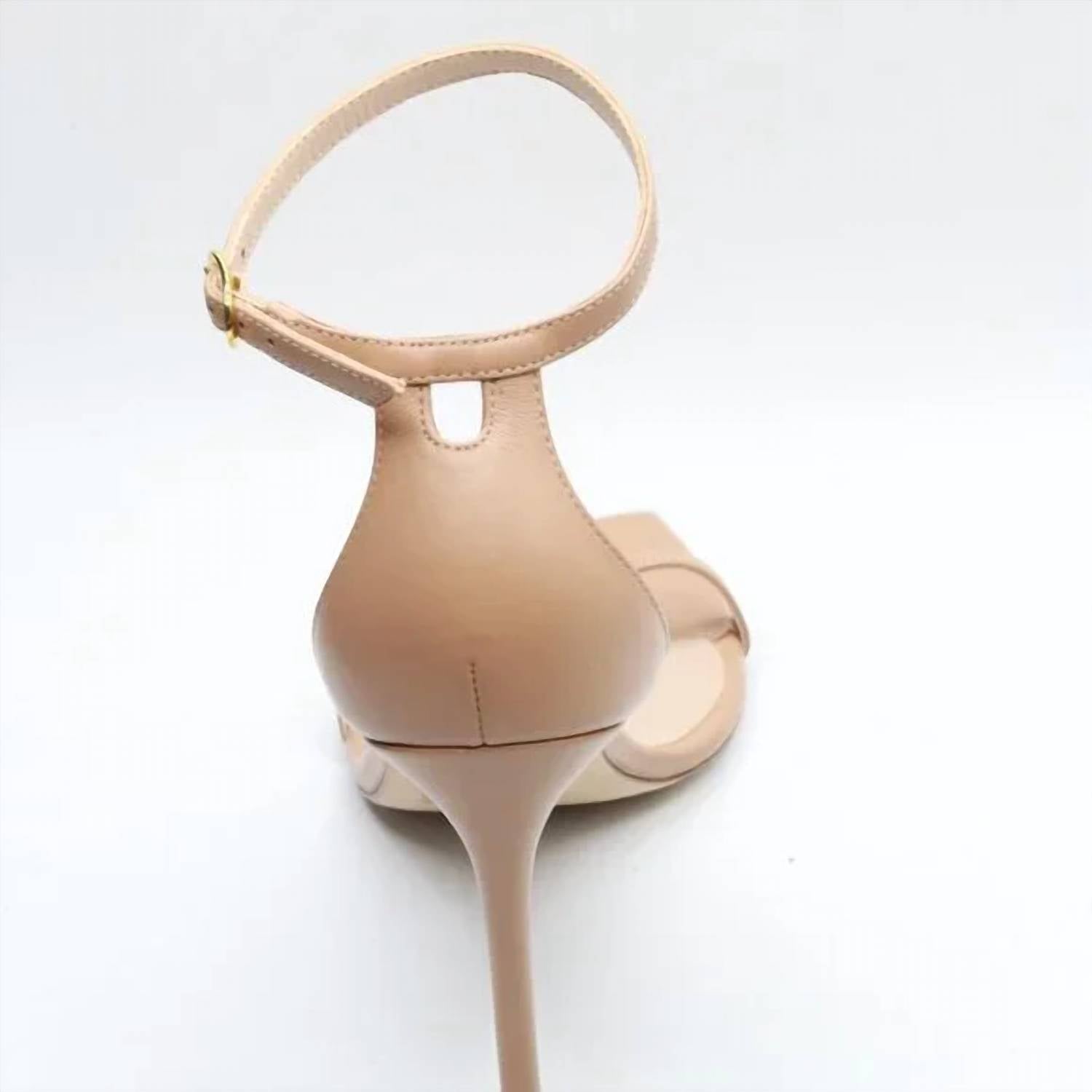 This sandal will take you from brunch to dinner and everything in between. This elegant tan sandal offers a sophisticated and high-impact silhouette, meticulously crafted from premium smooth leather to provide a sleek, architectural aesthetic. The minimalist design is defined by a refined 100 mm stiletto heel and a slender ankle strap that ensures a secure, customizable fit. Engineered with a contemporary curved profile, the sandal balances a bold, elevated lift with a polished appearance suitable for formal events and high-profile occasions. This versatile pair serves as a foundational wardrobe staple, combining precision craftsmanship with a timeless, neutral palette to effortlessly elevate any ensemble with a touch of modern glamour.