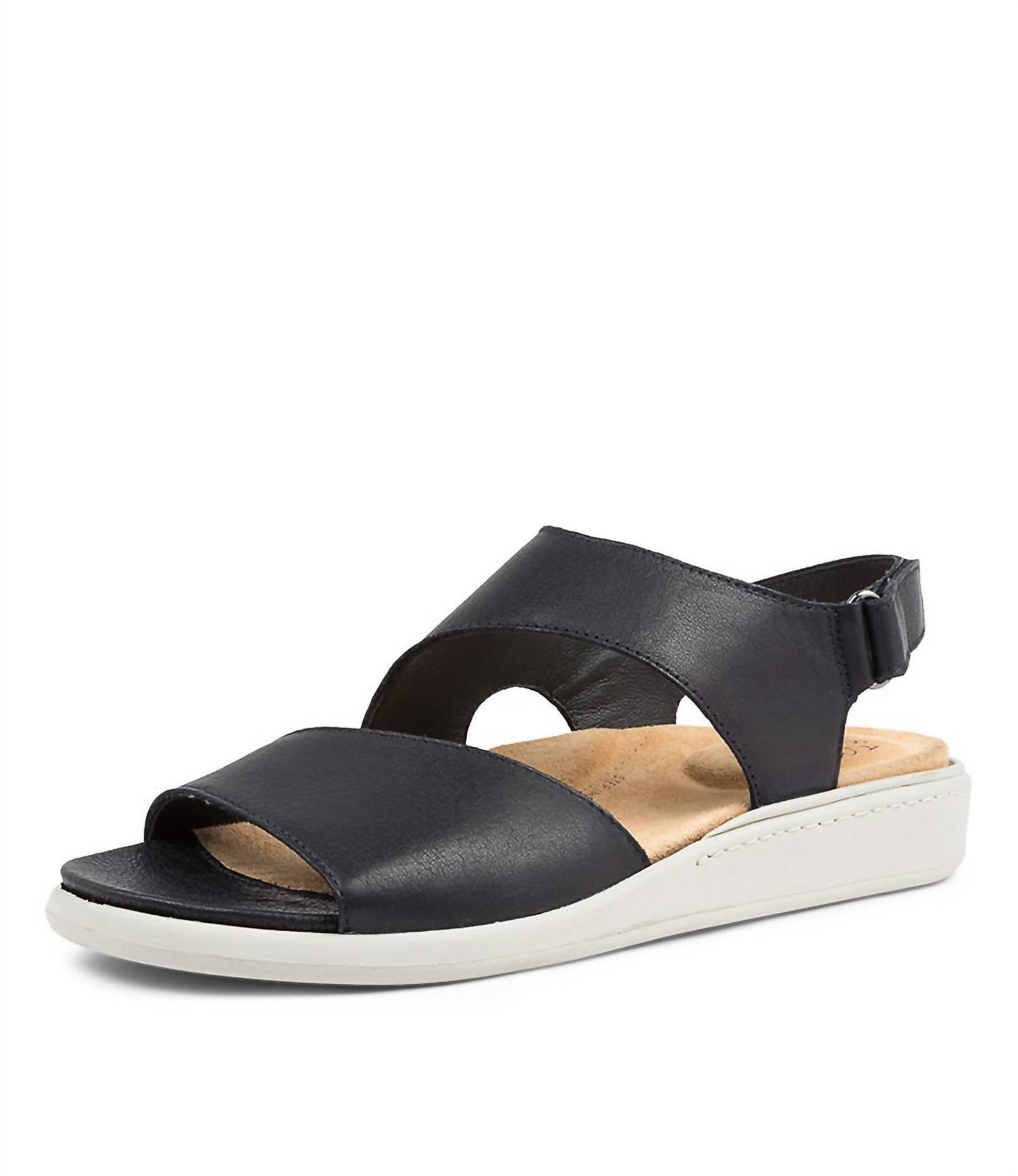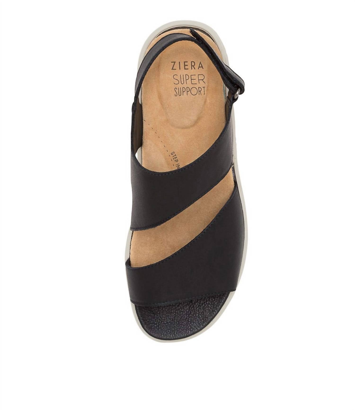 Classicly cute and all-day-wearable. We love this sandal. Introducing the Women's Igor Sandal by Ziera, crafted from premium navy leather with an open toe design for a stylish summer look. This sandal features a low heel with a slip-resistant sole, perfect for beach days and other casual outings. The Super Support footbed is removable, offering the flexibility to use your own orthotics, while the TPU stabilizing cradle provides additional support from heel to arch. The sandal is designed in a standard W width to comfortably fit most women, with Velcro straps ensuring an adjustable fit.