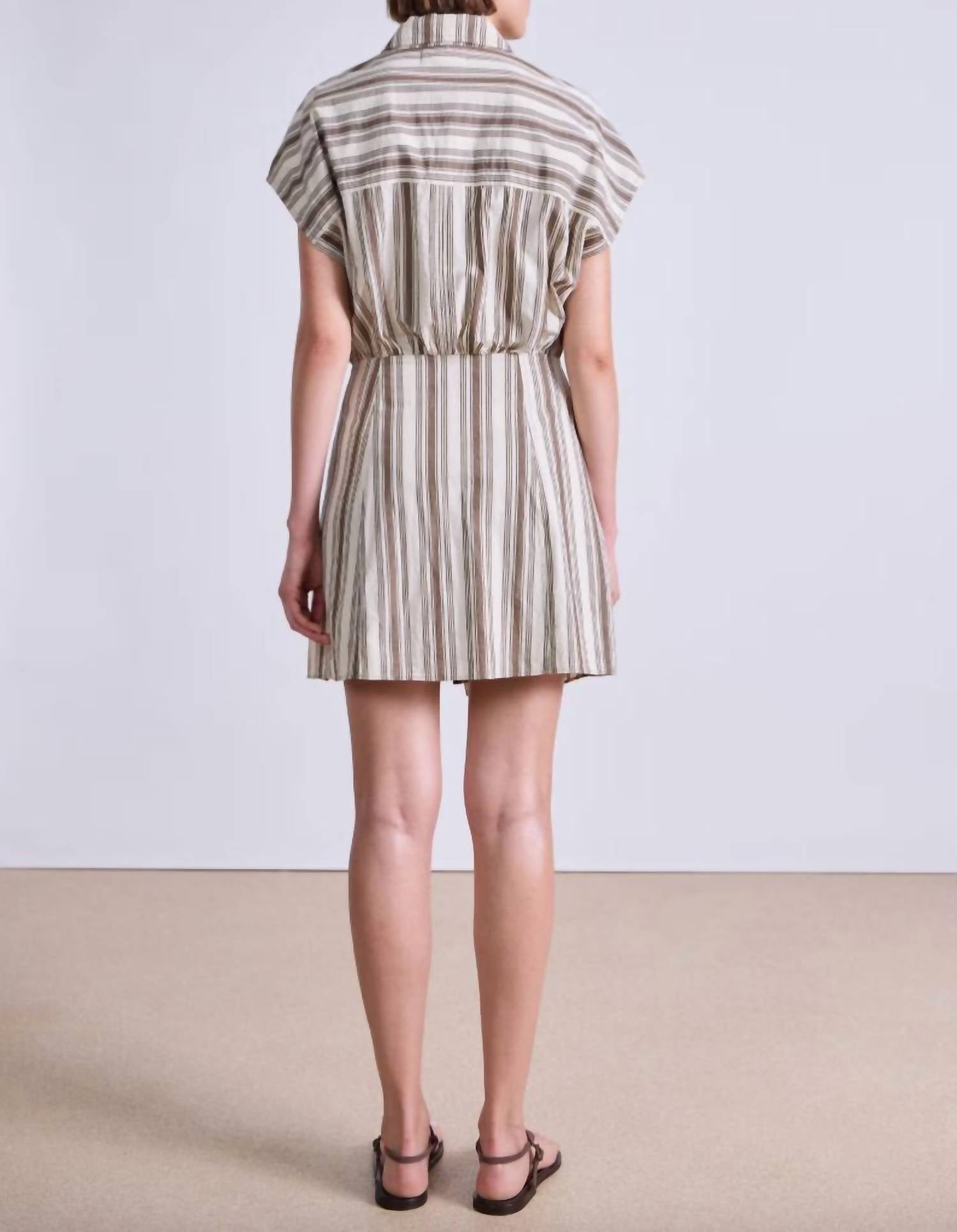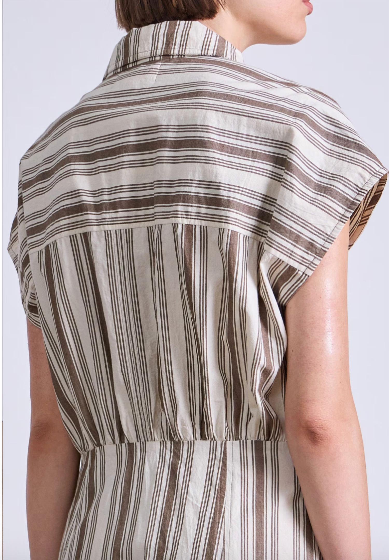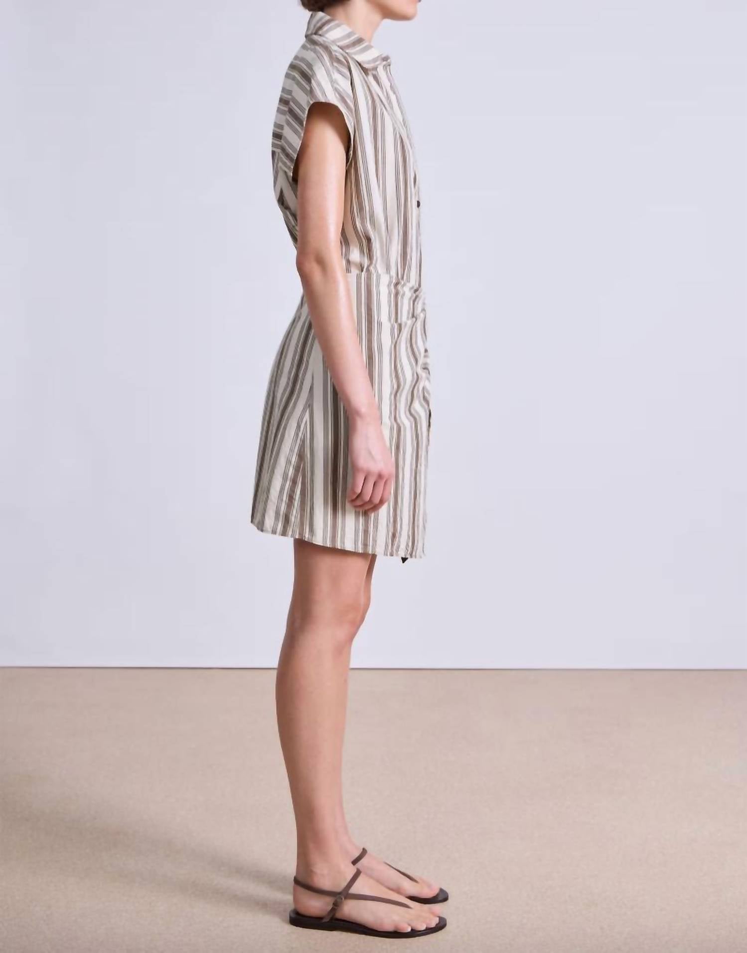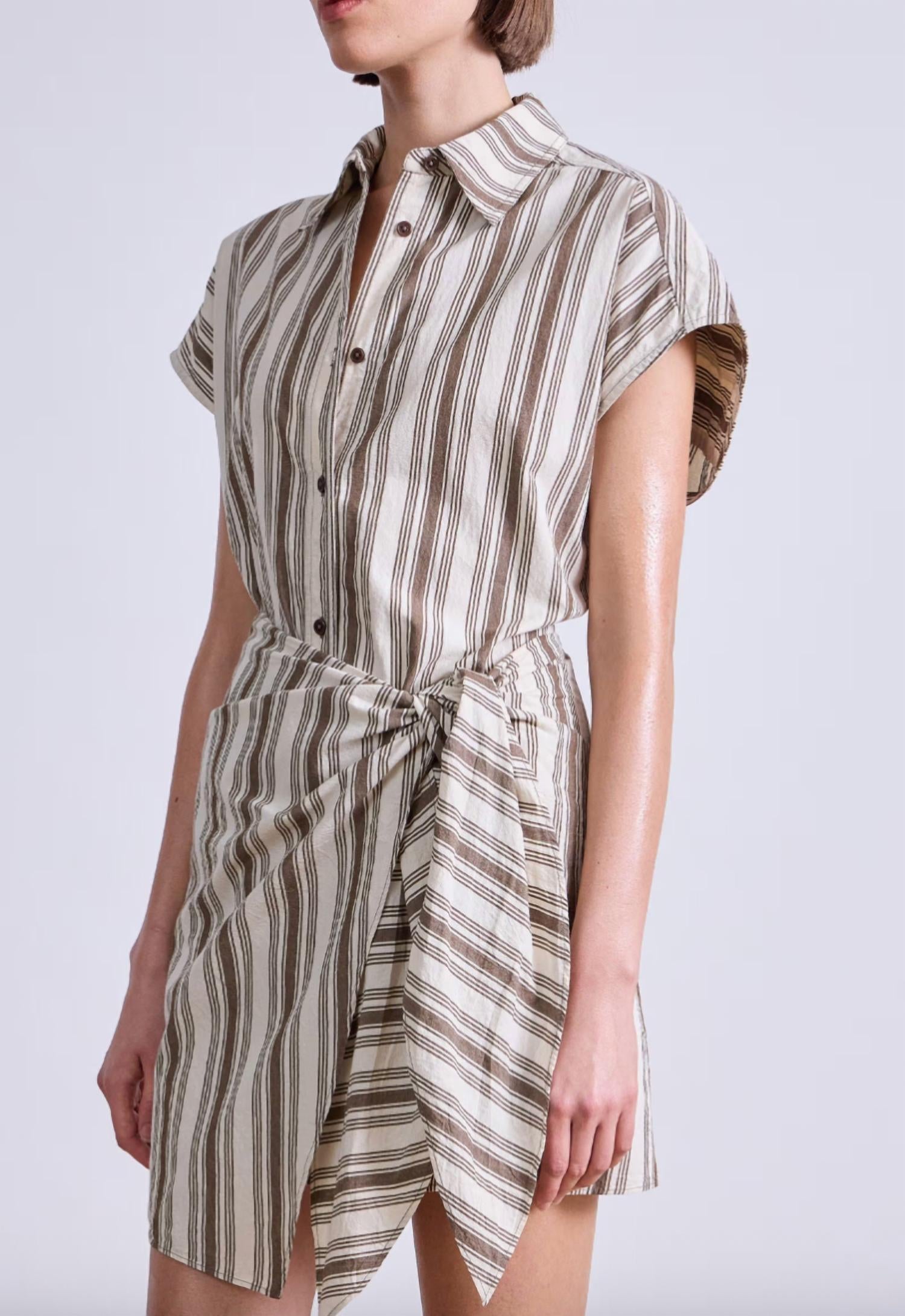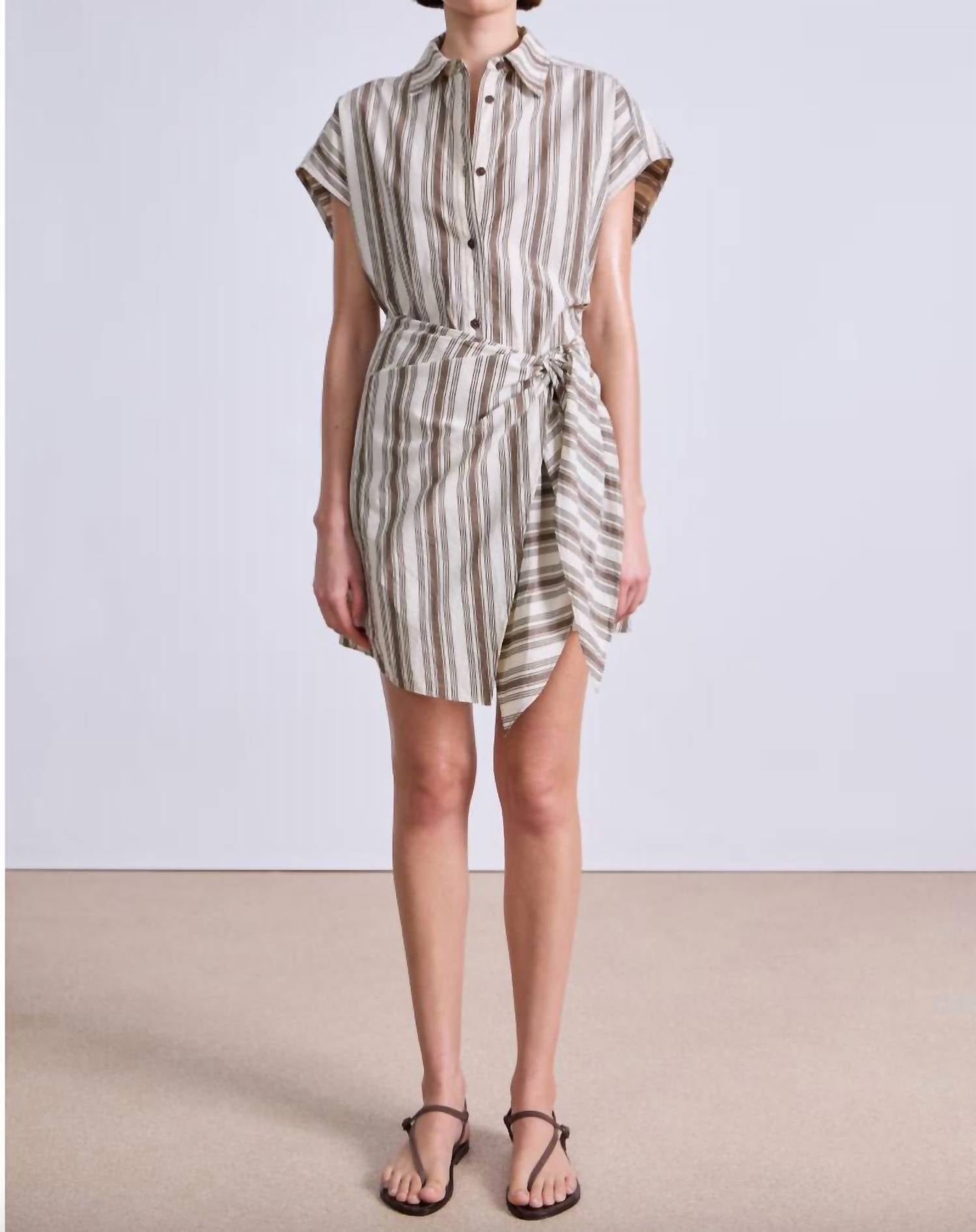 You need this piece for your next tropical vacation! Discover the San Vito Sarong by APIECE APART, a beach-ready coverup featuring Wide Stripes in Coffee and Cream for a boho chic look. Crafted from 100% organic cotton, this mini-length piece is made in India and boasts an asymmetrical drape with a front slit, complete with a wrap tie closure. Designed for summer fun, it measures 33 3/4" in length from a size 4 and fits true to size. Care instructions recommend hand washing cold and laying flat to dry, or opting for dry cleaning. The model is 5'10" and wearing size 4.