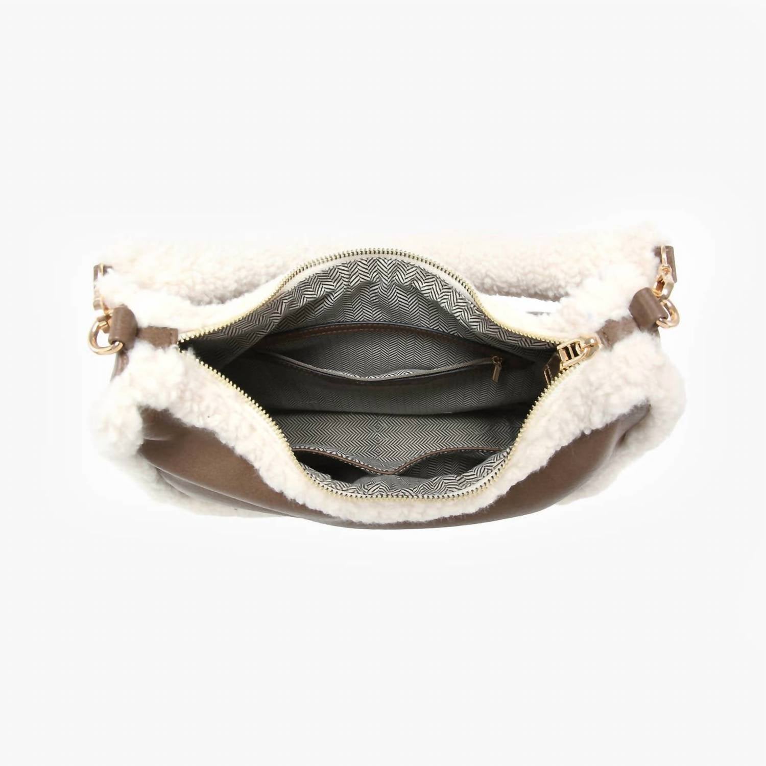 The carry-all satchel of the season. Elevate your accessory game with the Reece Vegan Leather Sherpa Satchel Bag by Jen & Co., a perfect blend of style and functionality in brown and white. This chic satchel boasts a luxurious sherpa trim with a matching handle for added warmth, along with an adjustable and detachable crossbody strap for versatile carrying. Its interior is thoughtfully designed with slip and zip pockets, as well as a back zipper pocket, to keep your belongings neatly organized. Made from durable vegan leather, its dimensions are 13"L x 4"W x 10"H.