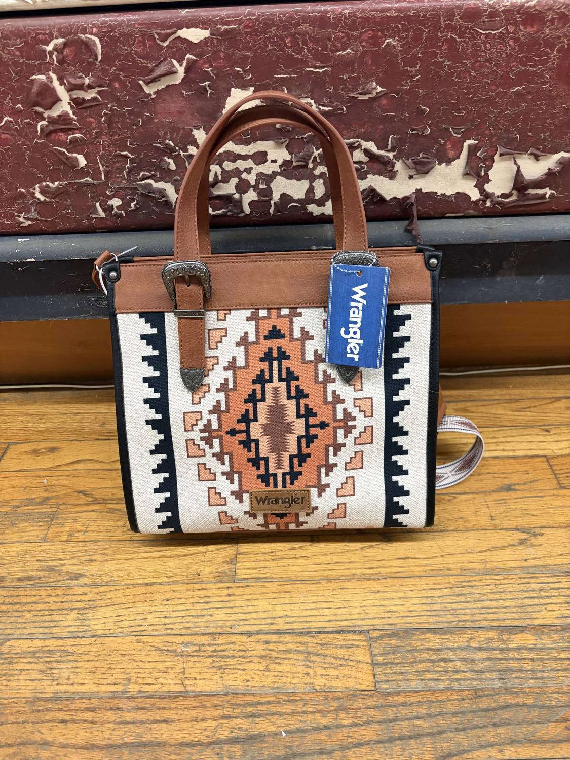 The carry-all satchel of the season. This item is a Wrangler brand Aztec-style tote bag, often produced in collaboration with Montana West, featuring canvas construction with PU leather trim and a top zipper closure.
