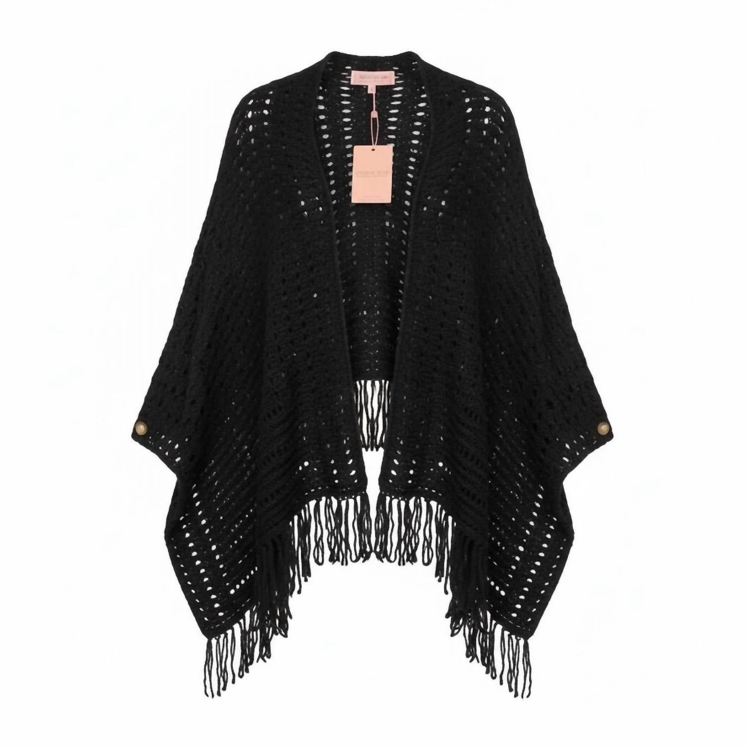Both classic and versatile with the endless ways you can wear it. Embrace elegance with the Fringe Shawl by Scandal Italy, a sophisticated layering piece designed in Italy. This black shawl seamlessly transitions from a flowing wrap to a fitted cardigan, complete with a graceful fringe. It features pull-on styling with button closures along the sleeves and an open front design. The fabric composition is 57% acrylic, 29% polyamide, 7% viscose, and 7% wool, offering a refined blend of warmth and style.