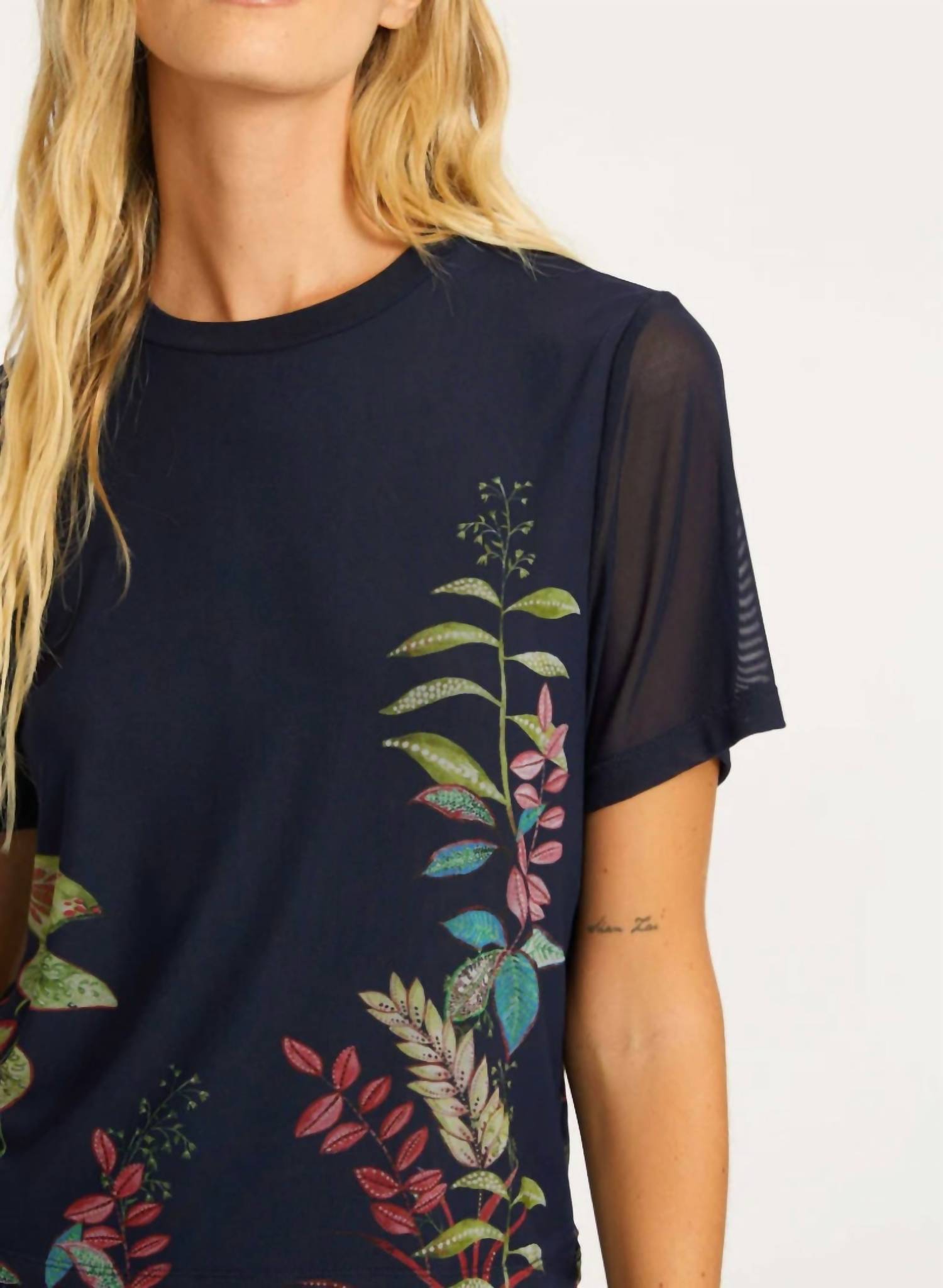 This classic, short sleeve tee will be your go-to staple this season and beyond. Introducing the Tyra Short Sleeve Top by CABALLERO, a chic option for your spring wardrobe in elegant Navy Blue with a floral print. Crafted from breathable nylon, it features a classic crewneck and a cropped length, perfect for a relaxed or tucked-in style. Its short sleeves and pull-on closure ensure ease and versatility, whether paired with high-waisted jeans or a skirt. Easy care with machine washable instructions, making it an ideal addition to your collection.