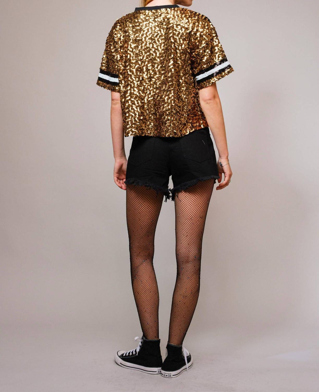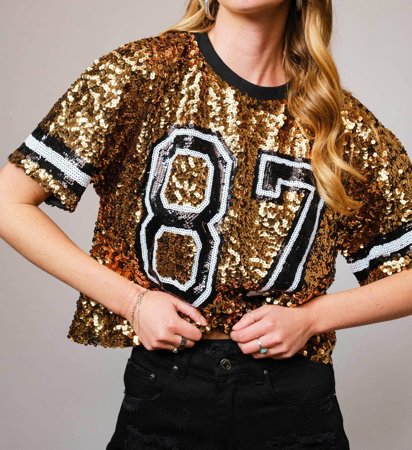 Look no further, you just found your perfect tee! Shine on game day with the Blue B Sequin Game Day Crop Varsity Top in a stunning gold hue. This top boasts short sleeves and a crewneck cut, perfect for a stylish yet comfortable fit. Crafted entirely from 100% polyester, it features a pull-on closure for ease. Ideal for spring streetwear, this graphic-patterned piece is as eye-catching as it is effortless.