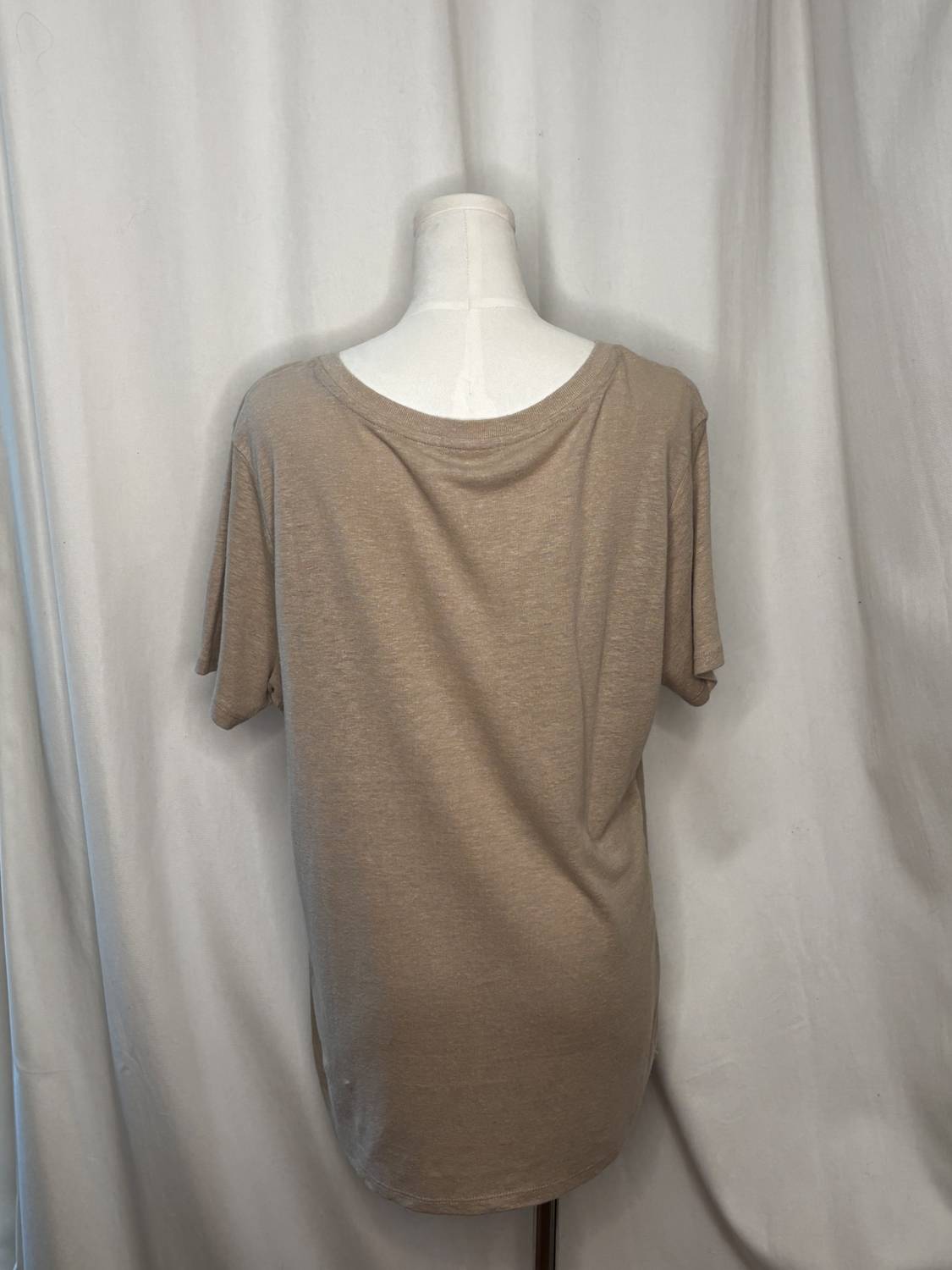 This classic, short sleeve tee will be your go-to staple this season and beyond. Short-sleeved linen blend knit. Flowing, effortless fit. Hip length.