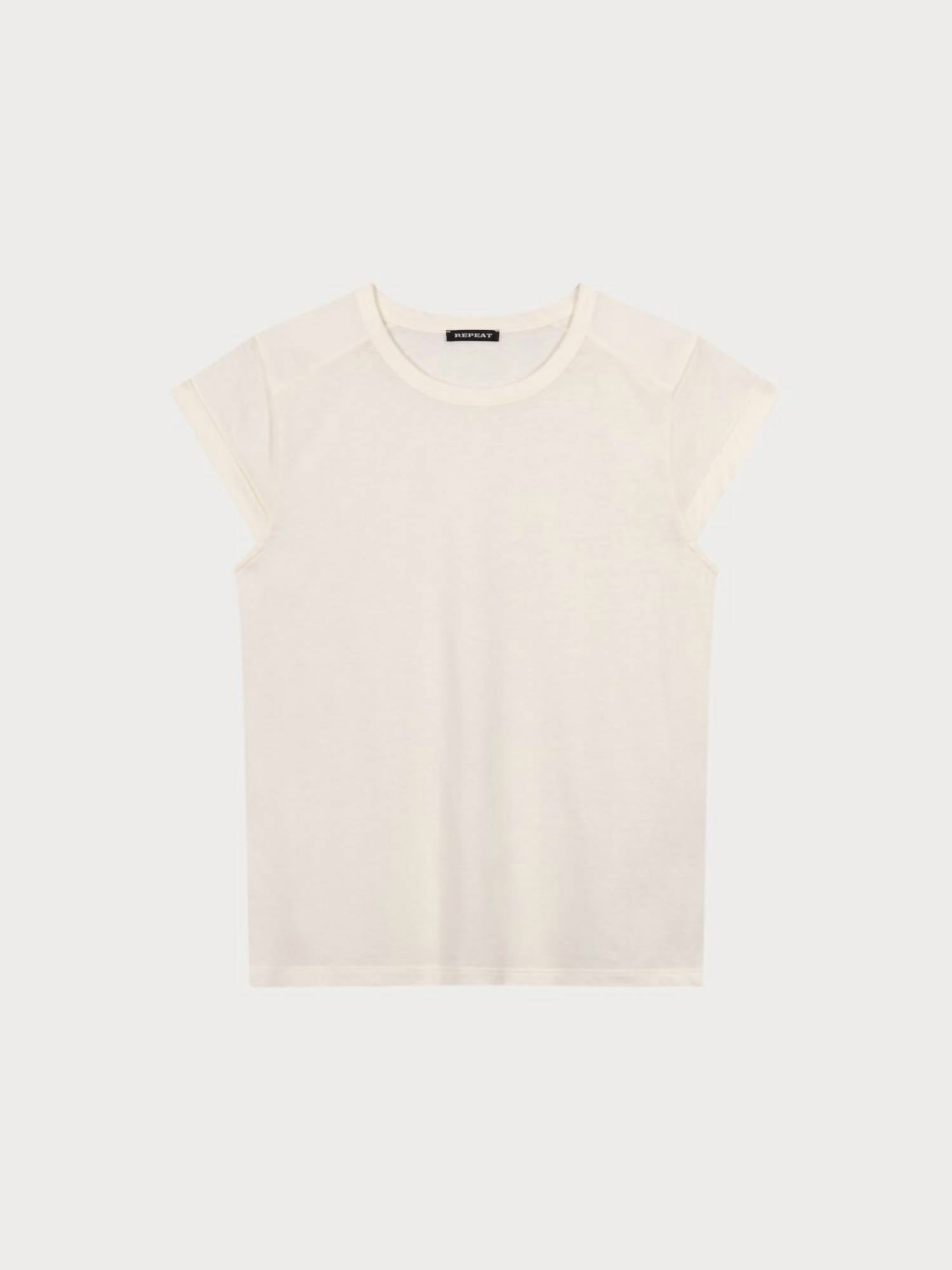 Look no further, you just found your perfect tee! Introduce understated elegance to your wardrobe with the Lyocell-cotton Blend Cap Sleeve Tee by REPEAT Cashmere. This cream-colored top showcases cap sleeves and is crafted from a high-quality 67% lyocell, 33% cotton blend with a luxurious shoulder insert in silk. Designed with a classic crewneck and a pull-on closure, it offers a casual fit perfect for summer and minimalist fashion trends. Care instructions suggest hand washing, with dry cleaning as a possible alternative.