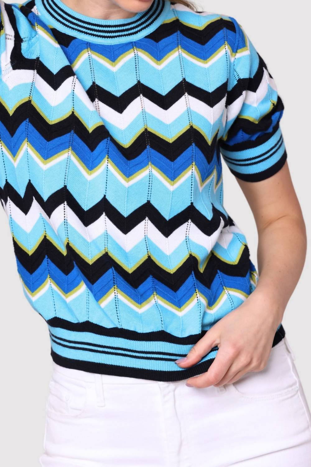 The short sleeve tee you'll want in every color. The Chevron Pointelle Crew by Minnie Rose is a striking short-sleeve tee in a captivating blue multi pattern, perfect for a maximalist summer style. Crafted from a luxuriously soft 95% cotton and 5% cashmere blend, this women’s tee features a timeless crewneck and rib trim, offering both comfort and chic appeal. With a pull-on closure, it is as easy to wear as it is stylish. Care for this piece with a machine wash or opt for dry cleaning to maintain its softness.