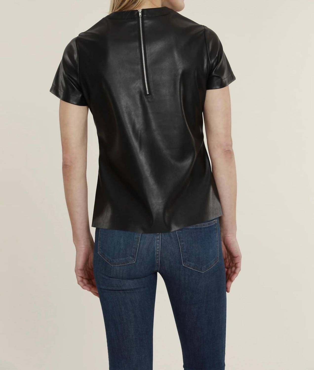 Elevate your wardrobe with the Faux Leather Shirt, offering a perfect blend of classic style and urban edge. Featuring short sleeves and a crewneck, this tee is crafted from 100% polyurethane faux leather, ensuring both durability and fashion-forward appeal. It features a convenient zip closure at the back for effortless wear. This imported piece is true to size and requires dry cleaning, making it a chic yet low-maintenance addition to any closet.