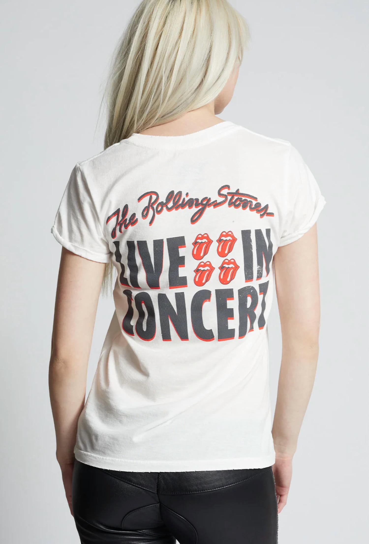 What is better than listening to The Rolling Stones? Seeing them live in concert! This bold graphic tee features authentic concert graphics on the front and back. Made with soft cotton fabric, a ribbed crew neckline, rolled sleeves, distressed hems, and a slim fit. The design of this style is fitted. For a more standard fit, choose a size up. Color: white. The Rolling Stones live in concert-fitted t-shirts—100% cotton.