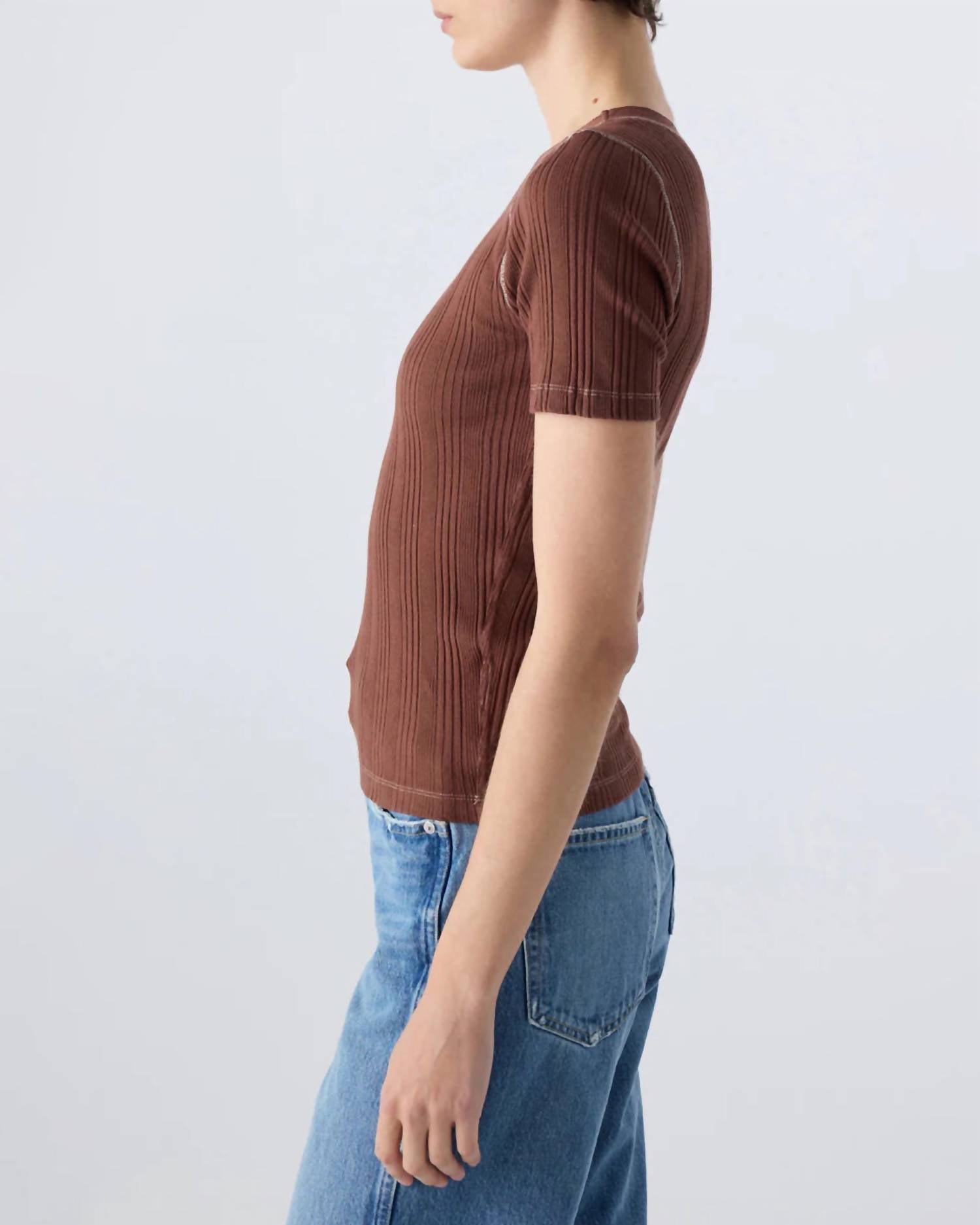 The short sleeve tee you'll want in every color. Introducing the AMO Cherish Short Sleeve Tee, an essential piece for effortless styling in a rich Cocoa hue. Made from a soft ribbed cotton blend with 94% Cotton and 6% Elastane, this tee offers a flattering fitted silhouette with subtle contrast stitching. Crafted in Portugal, its pull-on style and scoopneck make it ideal for layering. Care instructions recommend machine washing cold for maintaining its minimalist charm, perfect for travel and spring occasions.
