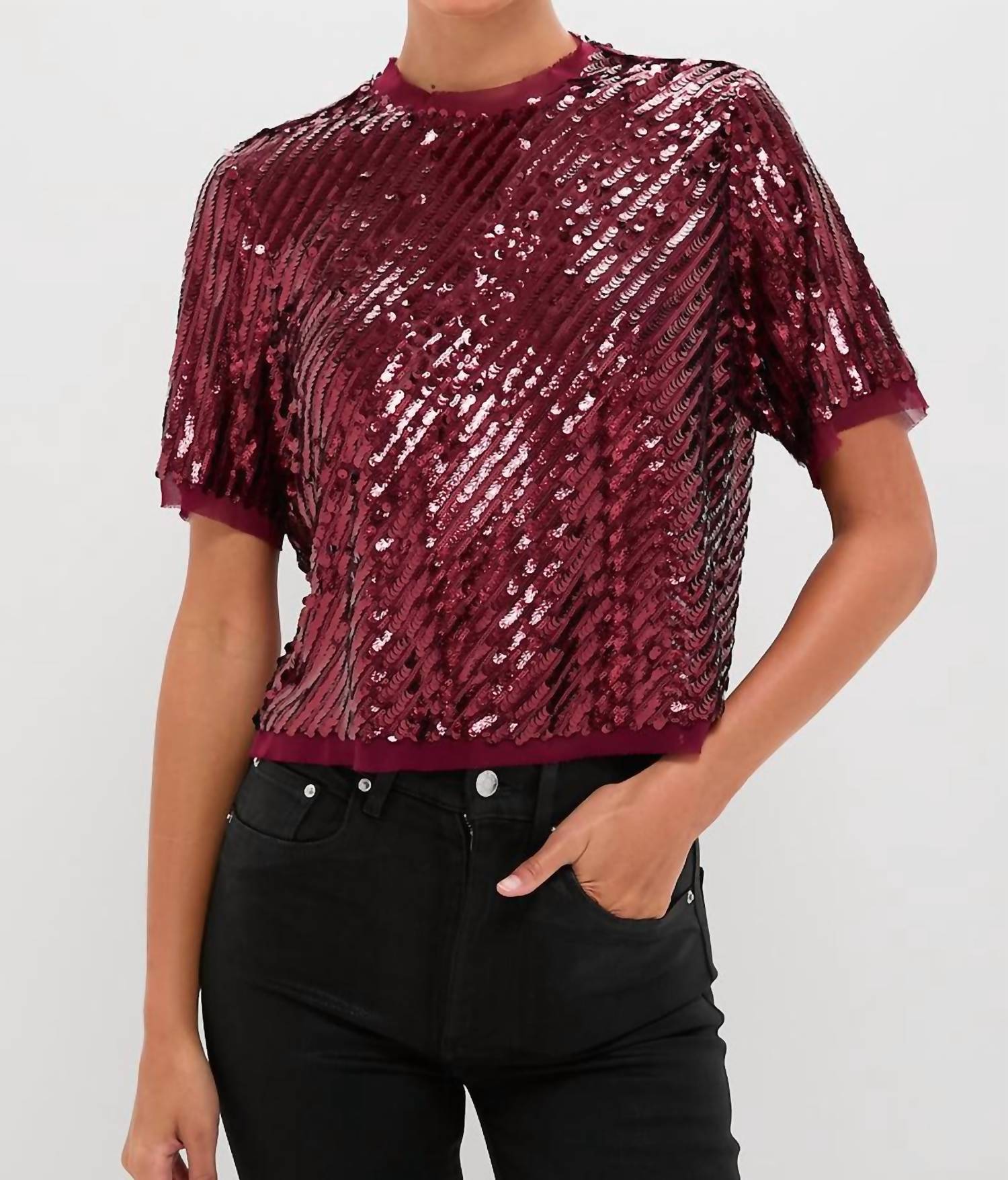 Look no further, you just found your perfect tee! Introducing the Pixie Top by Hunter Bell, a radiant addition in Mulberry Sequin designed for captivating elegance. This short sleeve tee features a crewneck and exquisite chiffon trim, complementing the allover sequin design for a luxurious textured look. Made from 100% Polyester with 100% Chiffon trim, this top closes with a back zip for easy wear. Care: Dry clean only.