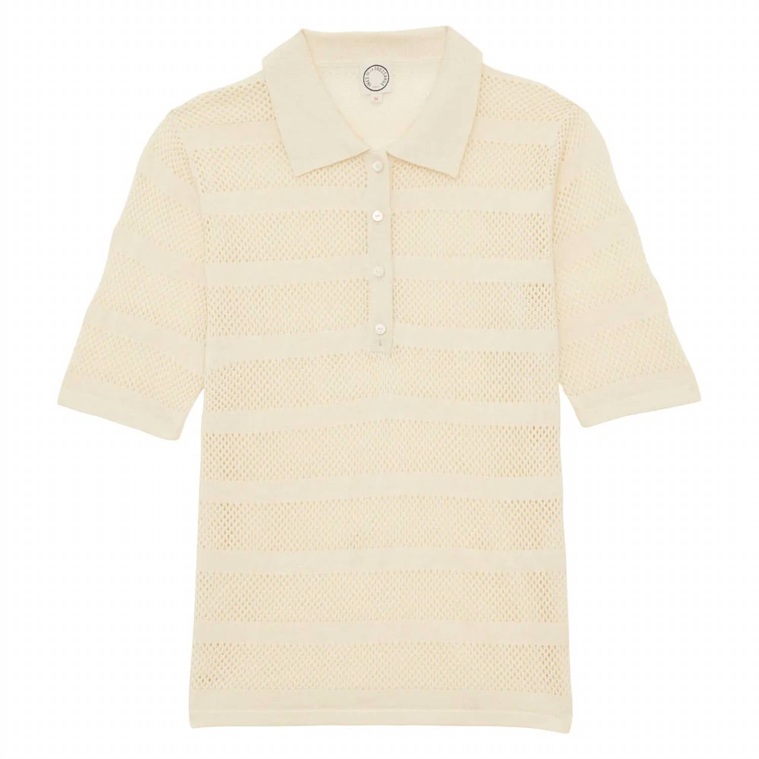 Discover the Simon Top by Ines de la Fressange, an elegant addition to your summer wardrobe in a chic Linen Ecru hue. This piece, crafted from 100% linen, features short sleeves and a stylish polo neck. It boasts a straight cut and a short front button placket for a refined yet relaxed look. Perfect for traveling, this minimalist and patterned top is designed with no pockets for a sleek silhouette.