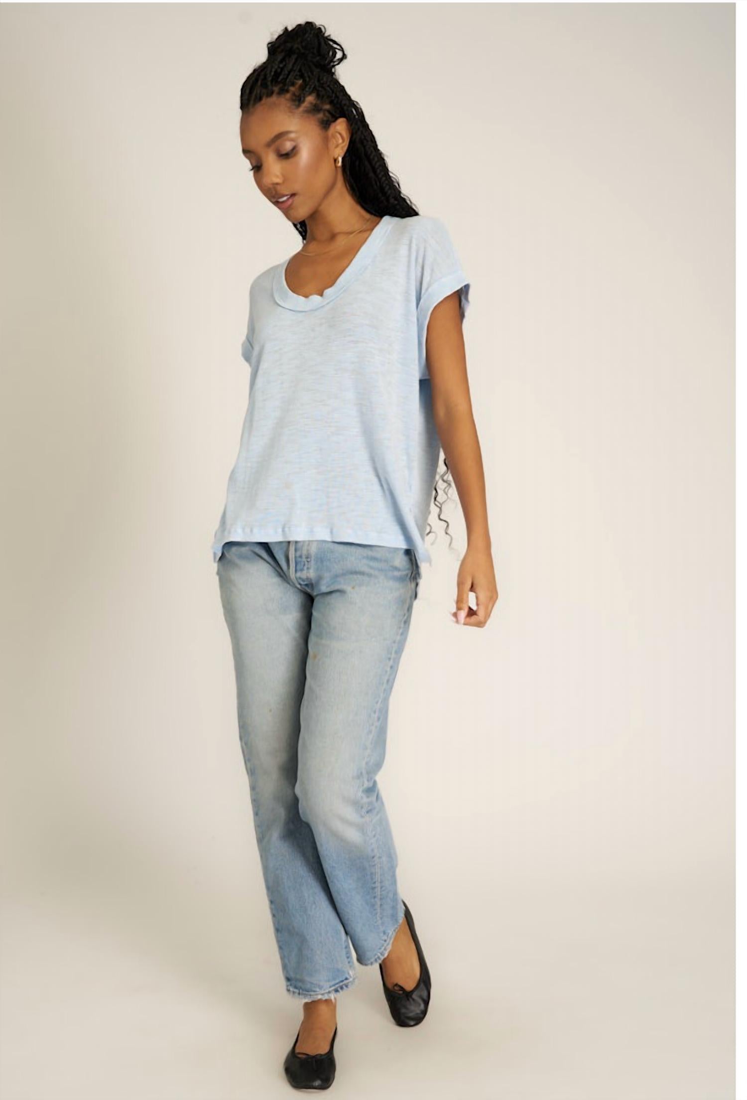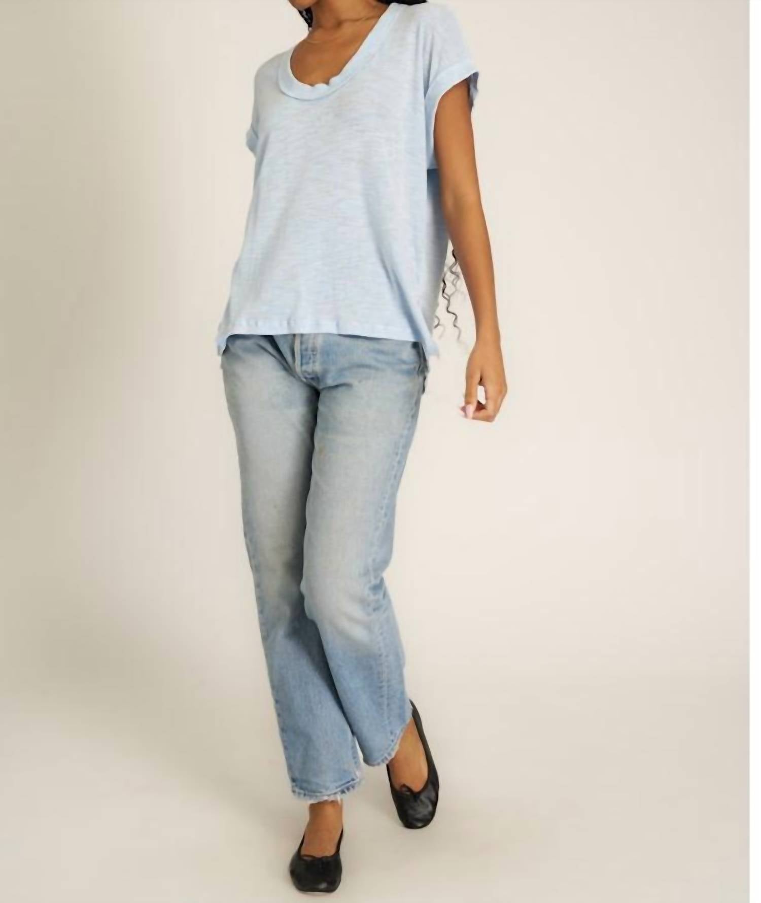 Look no further, you just found your perfect tee! Introducing the Too Deep Washed Scoop Neck Tee by PROJECT SOCIAL T, a minimalist essential in subtle Blue Dusk. This women's tee showcases a scoop neckline and short sleeves, perfect for a chic summer look. Made for easy, pull-on wear, it combines effortless style with comfort, ideal for vacations and casual outings. Care instructions include machine wash and tumble dry.