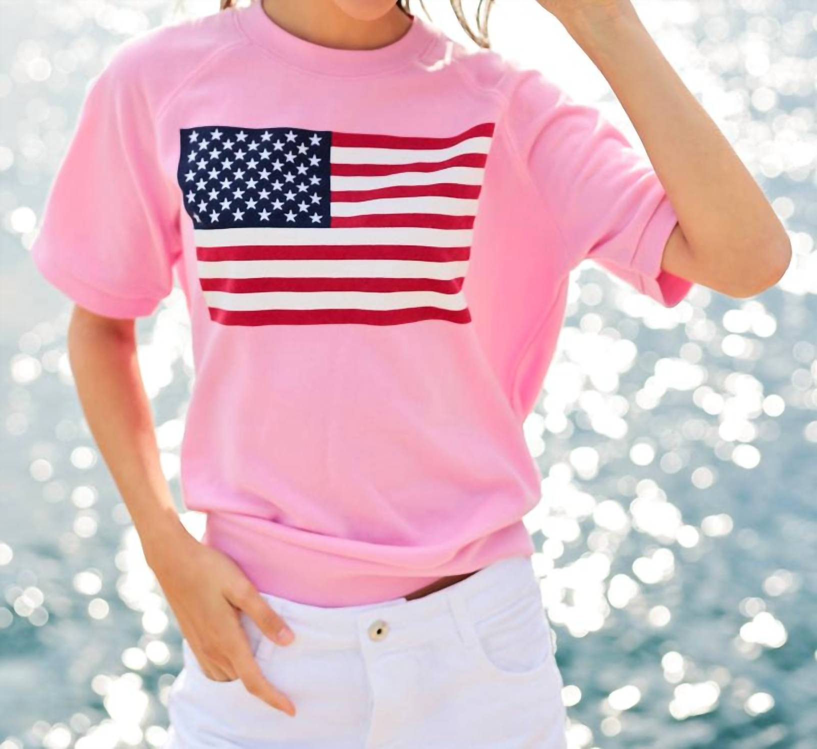 The short sleeve tee you'll want in every color. Unleash your patriotic spirit with the Shiraleah Flag Short Sleeve Sweatshirt, a staple for anyone embracing minimalist style with a touch of Americana. This women's top, in a delightful pink hue, features a graphic flag pattern that makes a bold statement. Crafted from a comfortable cotton blend, it is designed with a crewneck and short sleeves for a relaxed yet stylish fit. With its pull-on closure, care couldn't be easier—just machine wash and tumble dry.