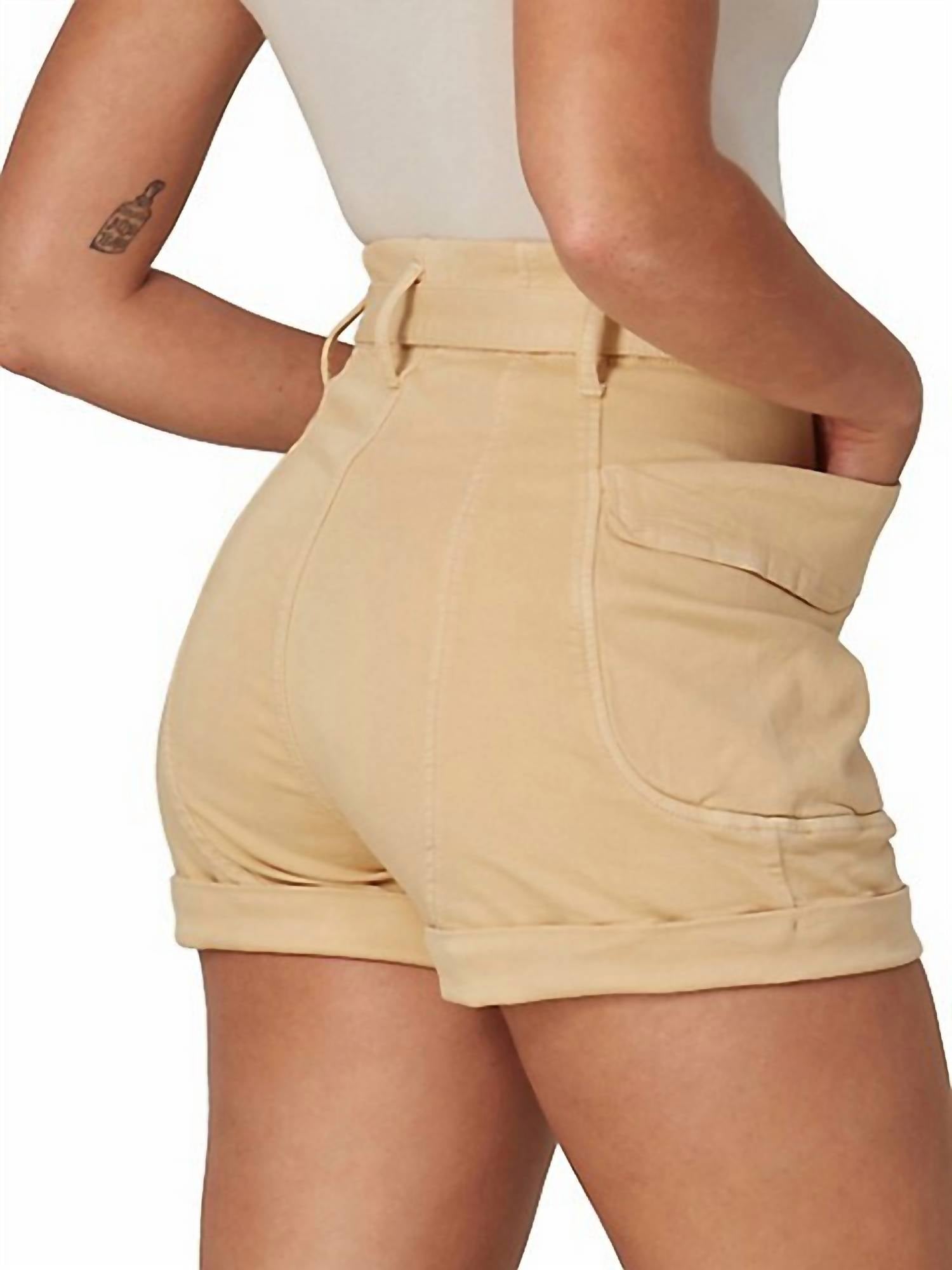 Not only cute but extremely comfortable. The jean shorts you will be reaching for all season long. Waist self-belt. Belt loops. Buttoned waist. Zip fly. Side slip pockets. Side cargo pockets. Folded cuffs. High rise. Regular fit. Inseam, about 3.5". Model shown is 5'9" wearing Size 26. Machine wash. 86% Cotton, 8% Polyester, 4% Viscose, 2% Spandex.