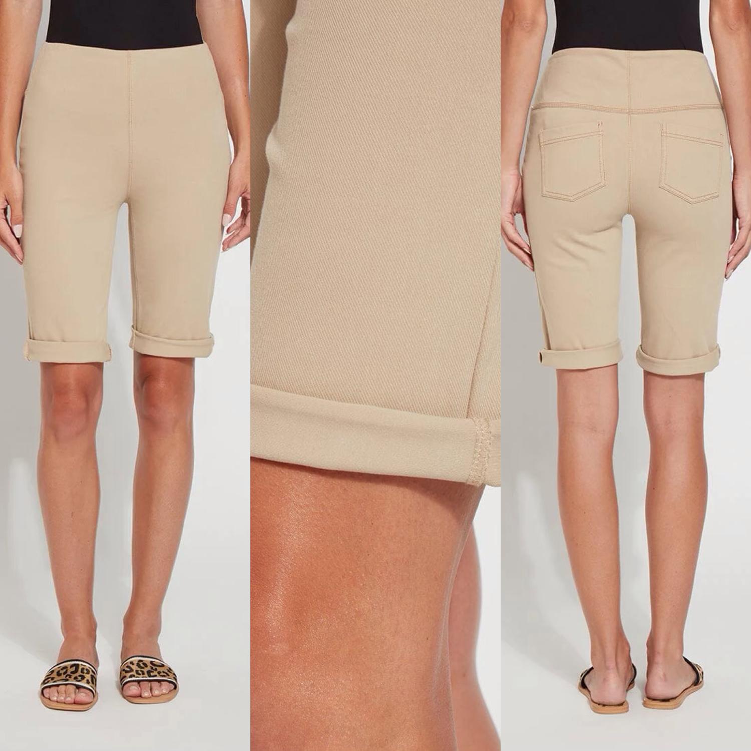 Embrace the perfect blend of comfort and style with these fashionable women's Bermuda shorts, expertly designed to offer a flattering fit and versatile wear. stretch denim pull on biker short, smooth and concealed waistband, detailed stitching, back pockets , can be cuffed