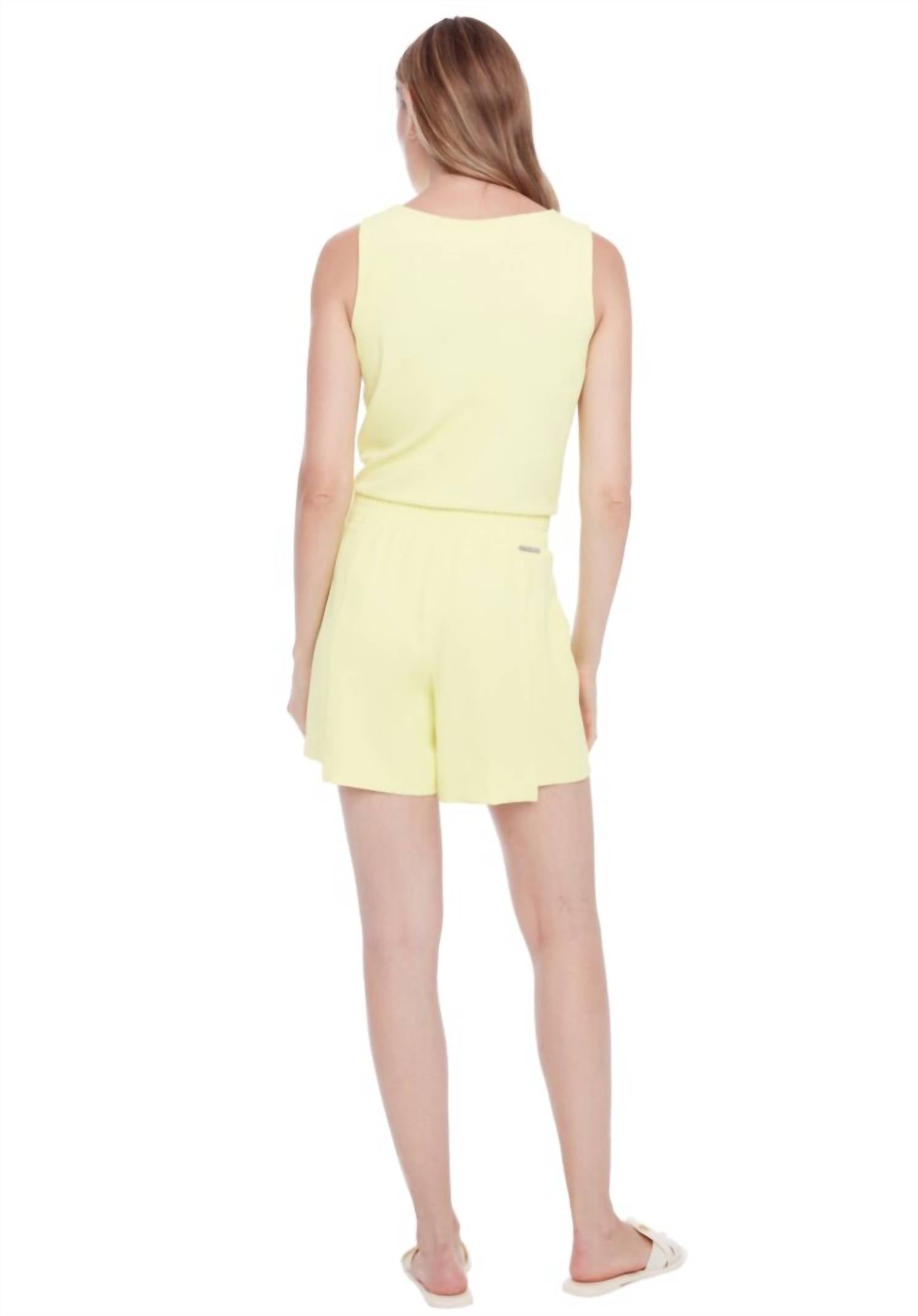 Extra wide pleats. Pull-on elastic waistband. Angled side pockets. Inseam: 6”. Made in Canada. Style #: 246003. 97% Polyester / 3% Elastane. Turn inside out, machine wash cold, gentle cycle, do not bleach, lay flat to dry, iron low on reverse if needed.
