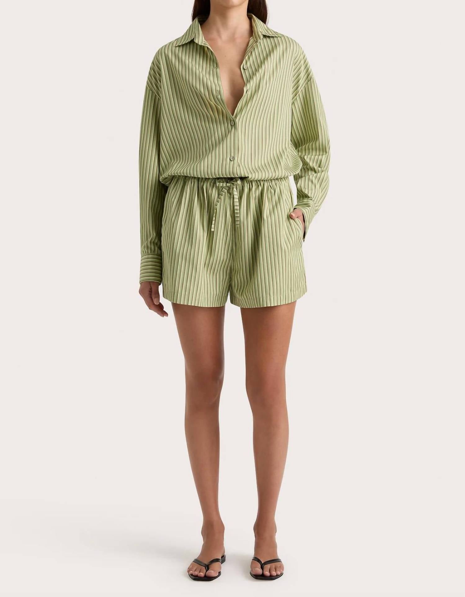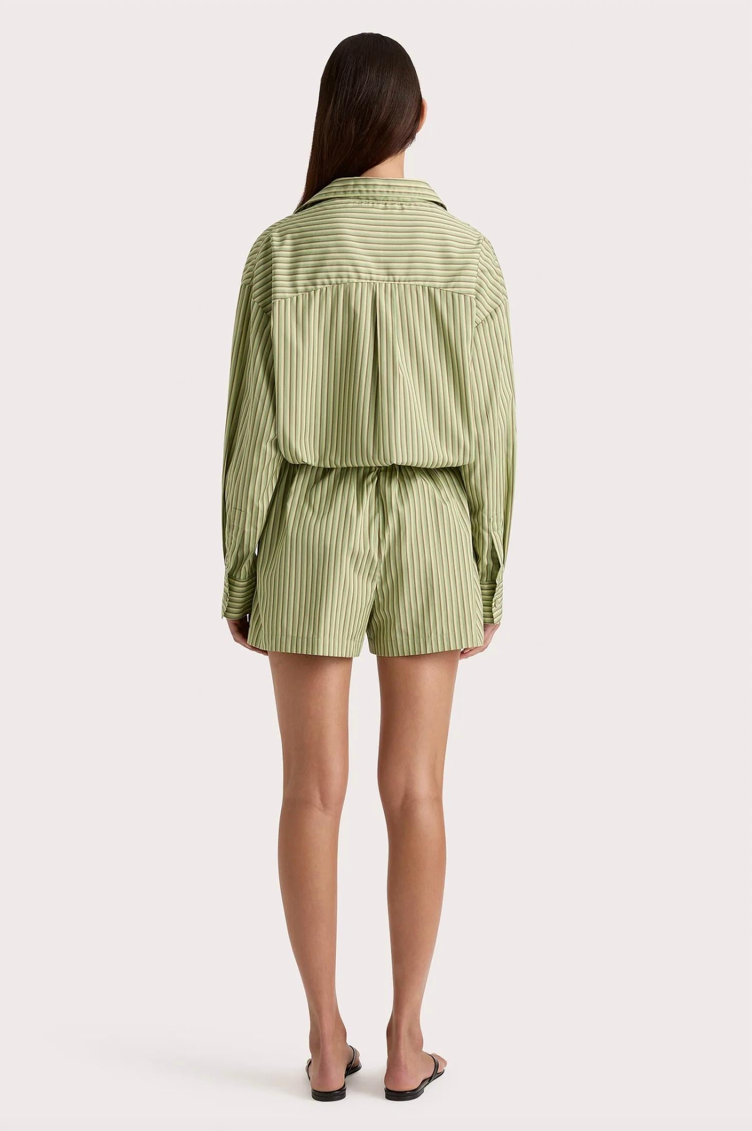 Introducing the Freja Shorts by FAITHFULL THE BRAND, designed for effortless casual wear. These relaxed shorts are crafted from yarn-dyed green stripe organic cotton, boasting a mid-rise fit. The elasticated waist with a drawstring ensures a comfortable, customizable fit, making them versatile for everyday outings. Care for them with a gentle hand wash in cold water to maintain their vibrant colors and structure.