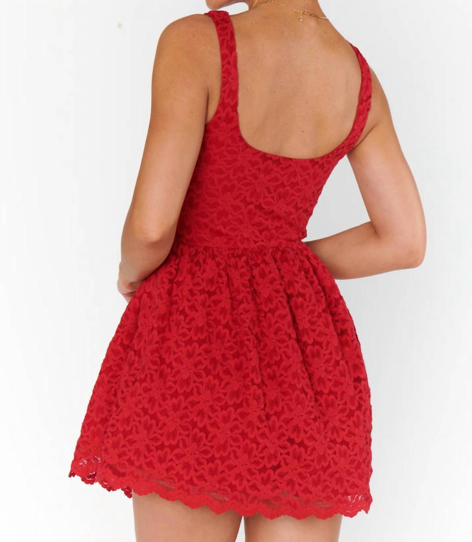 The go-anywhere and do-anything skort that you'll love to live in. Make a statement on the dance floor with Show Me Your Mumu's Ricci Skort Dress in radiant red lace. This stunning piece features a flirty bustier bodice, flounce hem, and comfortable built-in shorts for easy movement. It is made from a cotton blend with a composition of 55% Cotton, 42% Nylon, and 3% Spandex; the lining is 100% Polyester. Closure: Side zipper. The dress measures 32 inches from shoulder to hem and is perfect for evening dates, cocktail parties, and special occasions. Model is wearing a size Small (5'8" height).
