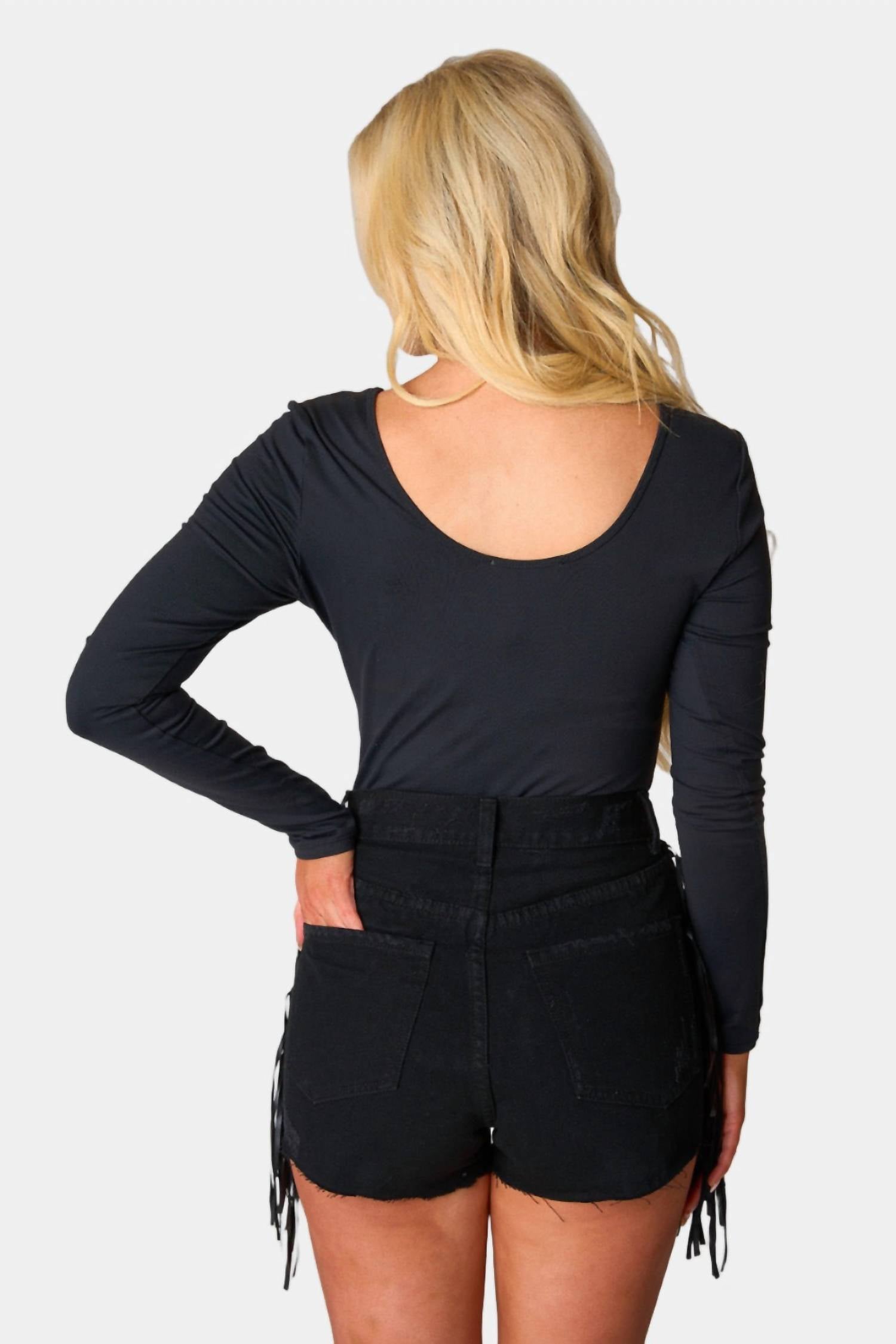 A preppy and feminine take on the classic bermuda short. Comfortable enough to lounge in and cute enough to wear out during your next warm weather outing. With black pleather fringe running down the hip seams.  2.5 Inseam. Fabric contains no stretch. Model is 5‘7", Bust: 32", Waist 18", Hips: 34", wearing size 25. Machine wash cold. 100% Cotton.