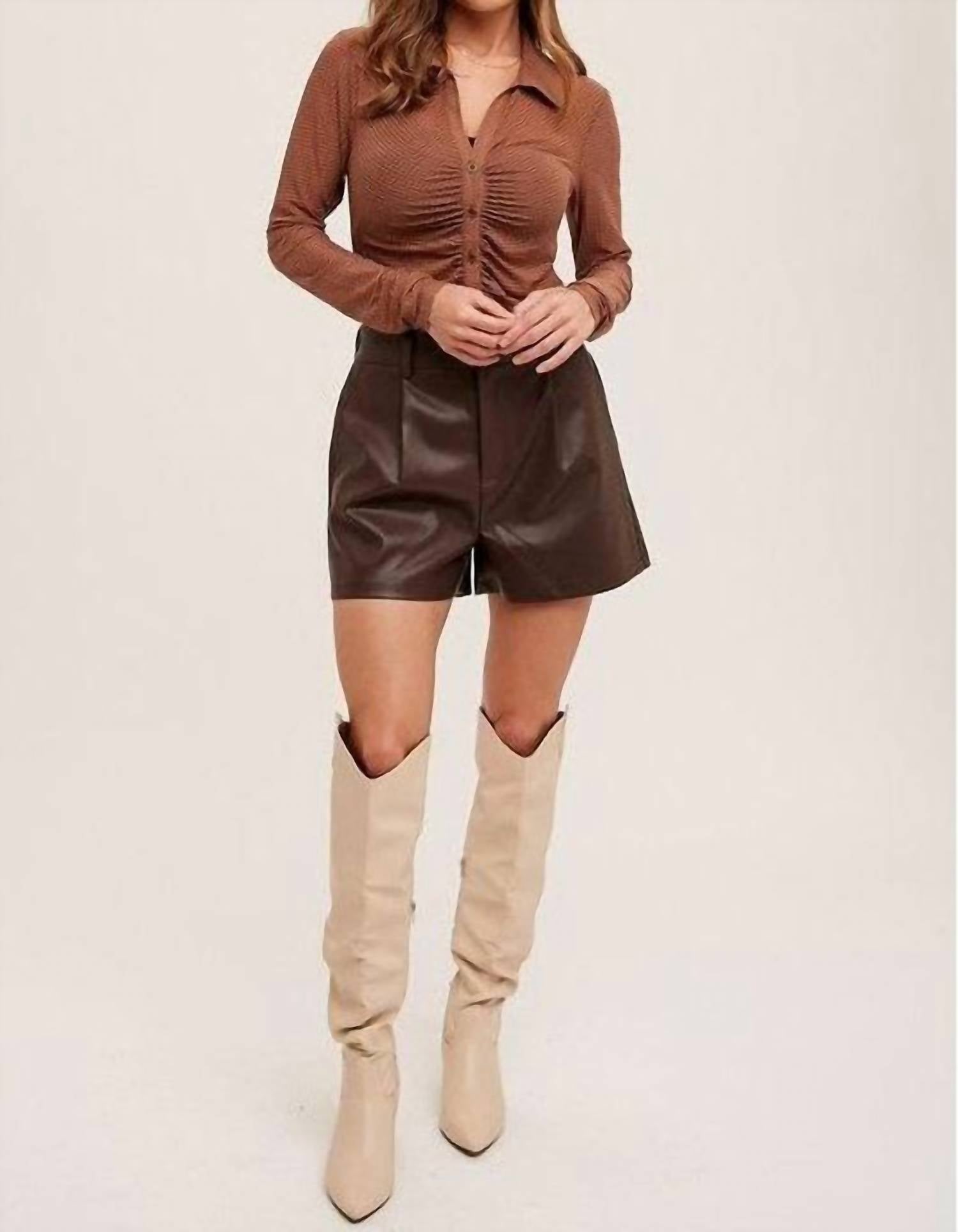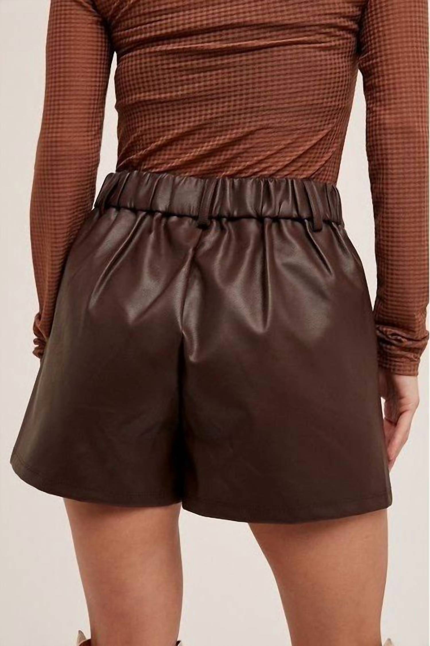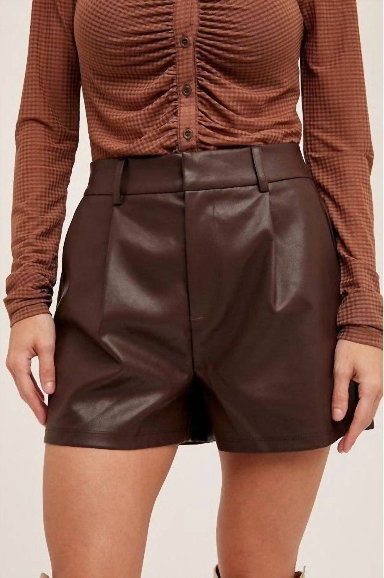 Tuck your favorite tee into these high-waist shorts for a more casual-cool feel. Elevate your style with Hem & Thread's Faux Leather Pleated Shorts in a chic brown hue. Crafted from high-quality faux leather, these high-waisted shorts offer an edgy pleated design perfect for versatile styling. Featuring practical pockets, the shorts present a sleek silhouette with no closure for easy wear. Ideal for any occasion to embrace your playful side in effortless fashion.