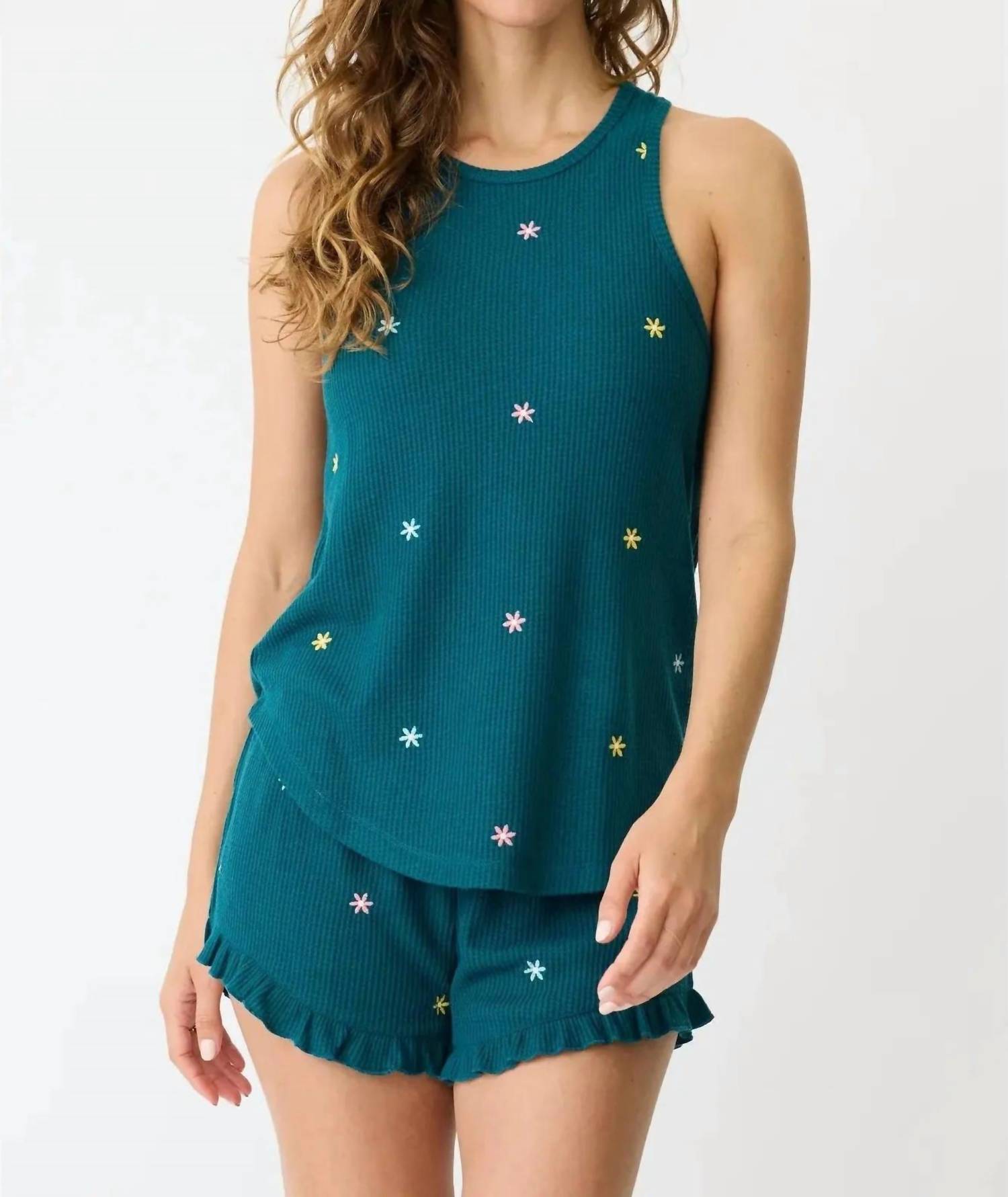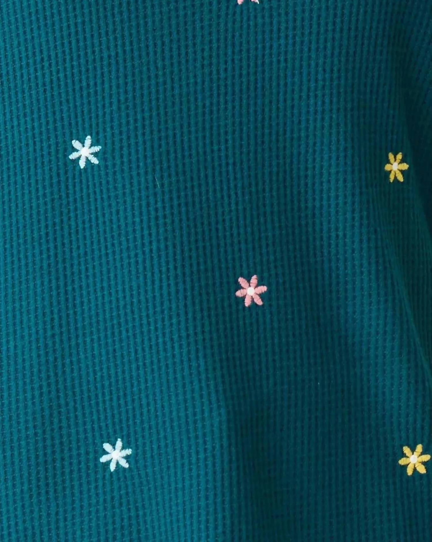 High-waist is here to stay and we especially love this style short. Introducing the Take It Easy Shorts by PJ Salvage, crafted for leisurely style in a stunning teal hue. These high-waist women's shorts feature an exclusive embroidered floral pattern that complements their brushed waffle thermal texture. Made from a blend of 65% Polyester and 35% Rayon, they promise both comfort and fashion. Designed with a convenient pull-on closure, they are perfect for easy wear and relaxed lounging. Model is 5'9.5" and is wearing a size Small.