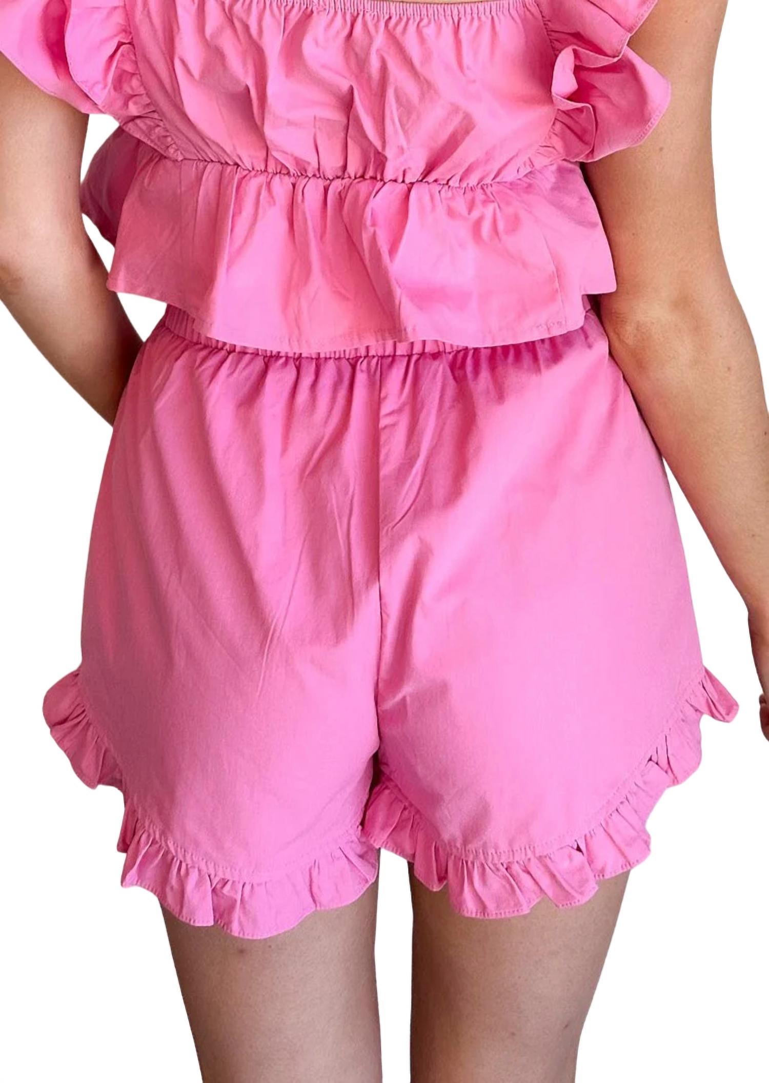 Elastic waistband. Pull on short. Ruffle hem. 100% Cotton. Hand wash cold. Height: 5’7”, Hips: 35”, Bust:34”, Waist: 25”. Model is wearing size Small.