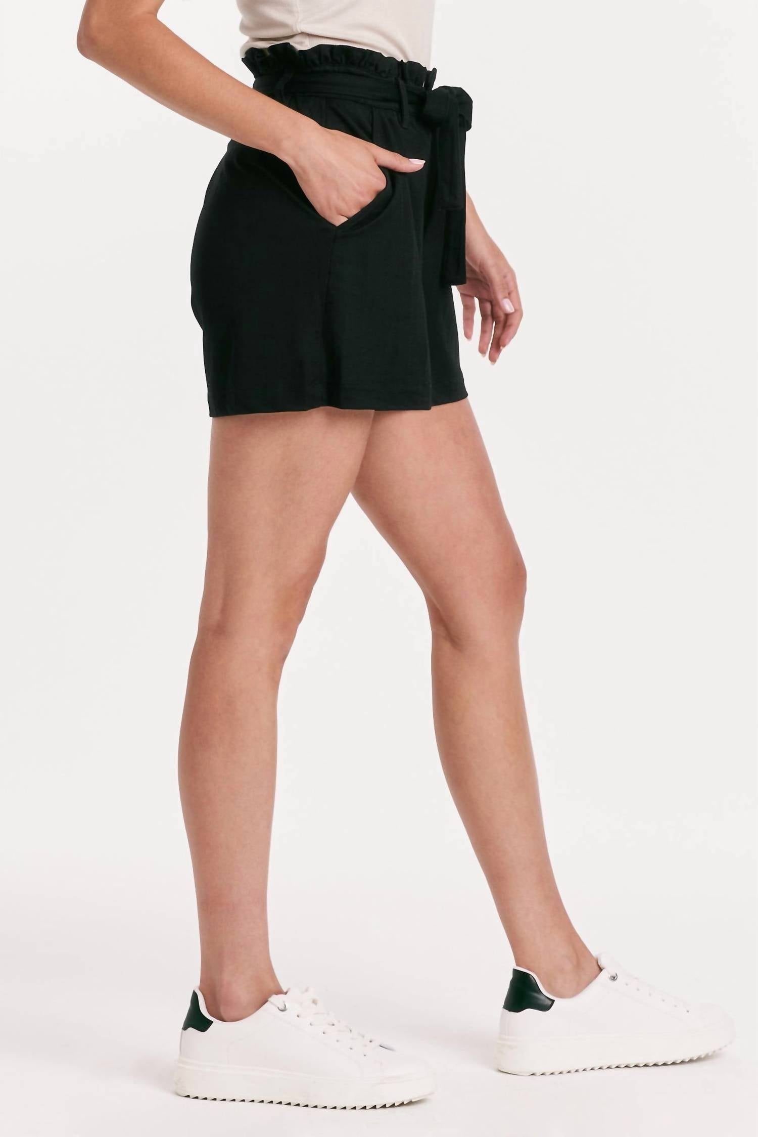 Relaxed paperbag shorts featuring a wide leg opening, side pockets, and a self-belt tie in a solid color woven relaxed fit. 13.50" Font rise (including waistband), 28.50" Leg opening, 3" Inseam (Size Small). 52% Rayon, 48% Nylon.