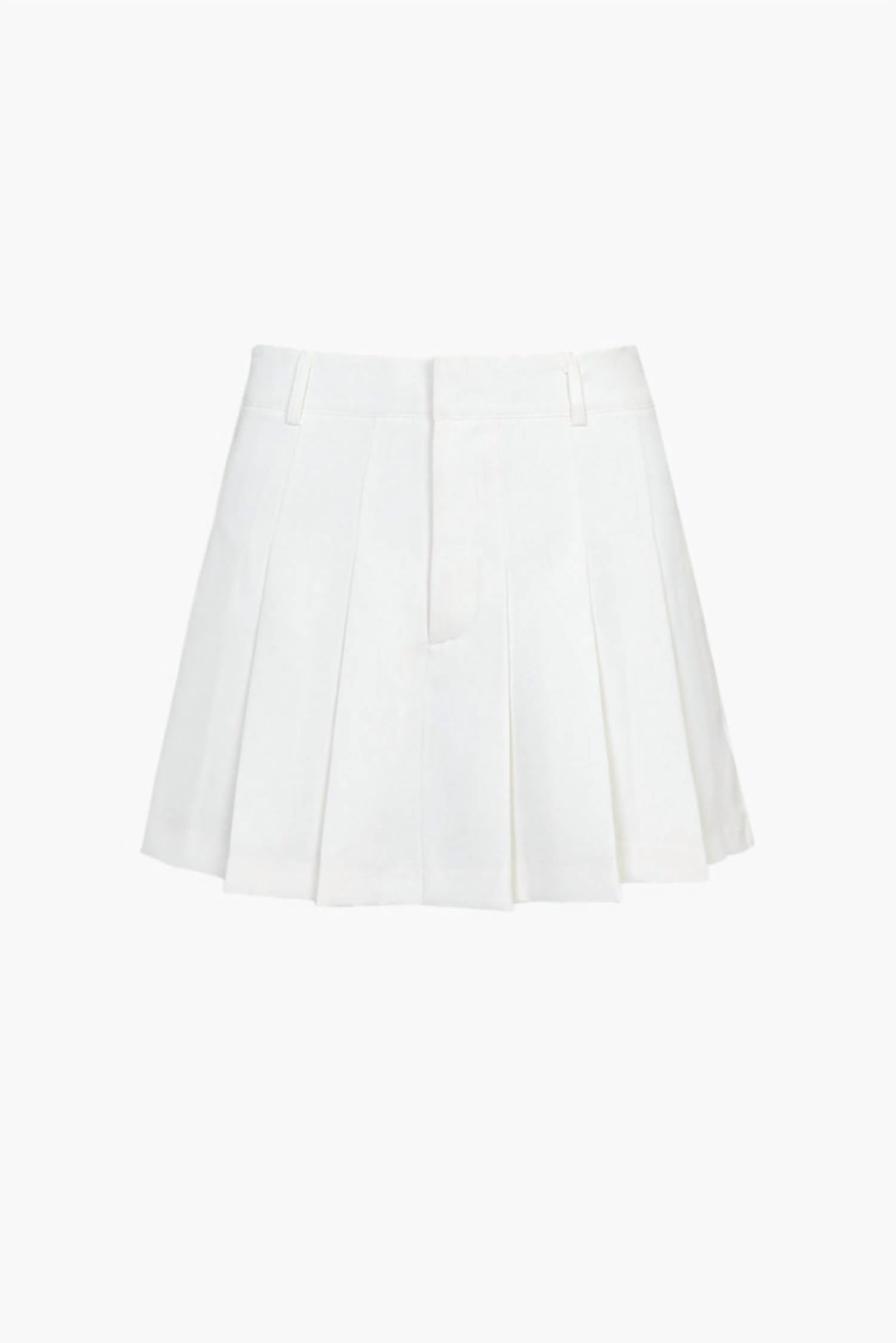 A skirt that you can do just about anything in? We love a good skort, especially this one! The Augusta Tennis Skort by Adelyn Rae is a chic addition to your wardrobe, offering the style of a skirt with the comfort of shorts. Crafted from 100% Polyester for the self and a polyester-spandex blend for the lining, this white skort features a distinctive pleated design with functional belt loops. With a button closure and a solid pattern, it's perfect for preppy or playful looks. Care: Hand wash only. Dimensions include a 2.75-inch inseam, an 11.5-inch front rise, and a waist measurement of 13.625 inches. Model is wearing a size S.