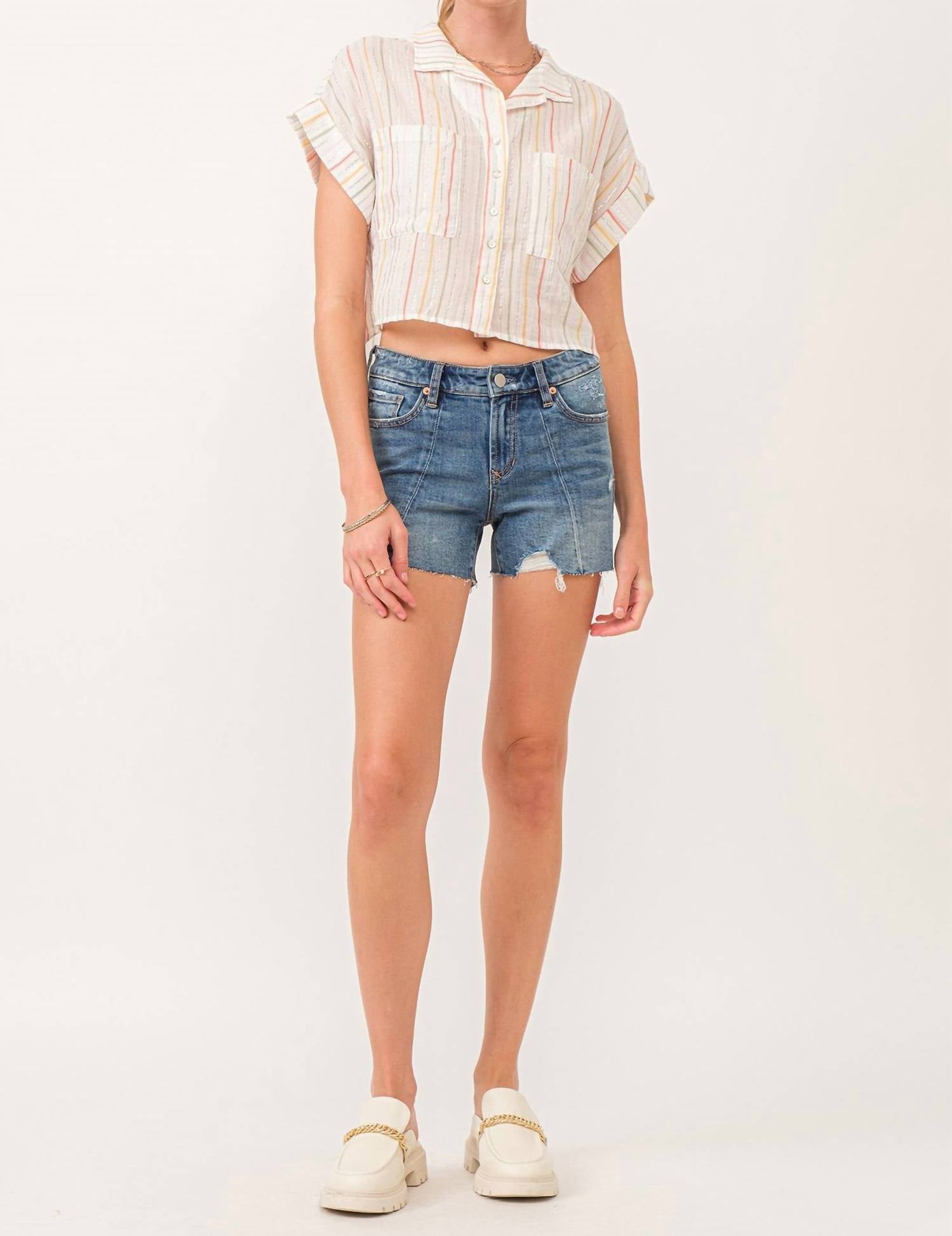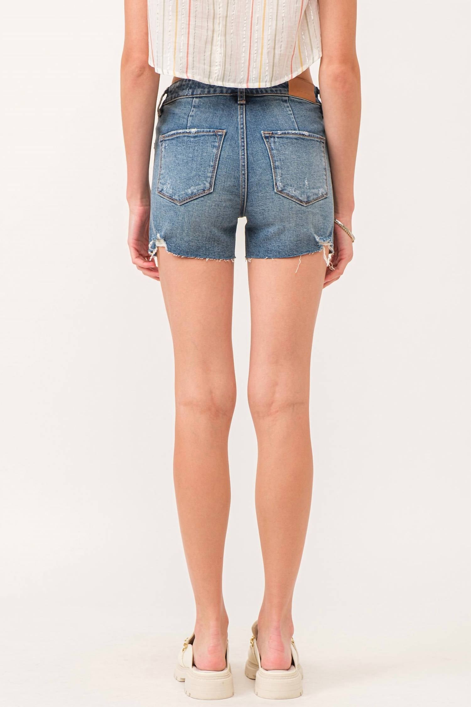 Jean shorts so versatile, you can literally wear them with anything. Mid-rise fit and trendy frayed hem. Made from a comfortable blend of 98% Cotton and 2% Spandex. Shorts in the shade Reach ensure both style and comfort. Include a convenient button closure and practical pockets. Care for them is a breeze with machine washing recommended. With a front rise of 9 1/4", a back rise of 14 3/4", a leg opening of 21 3/4", and an inseam of 3.5". Chic and functional.