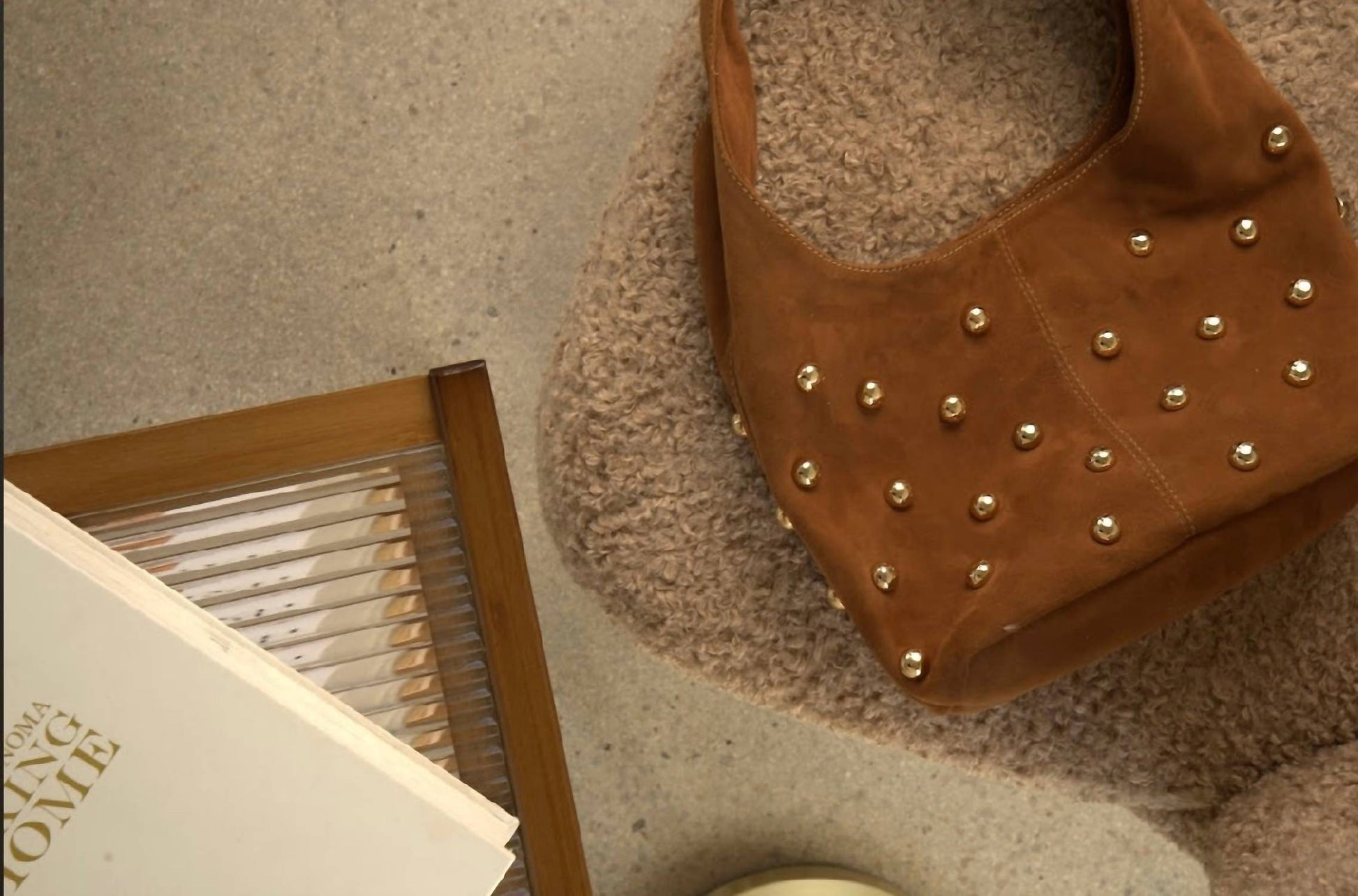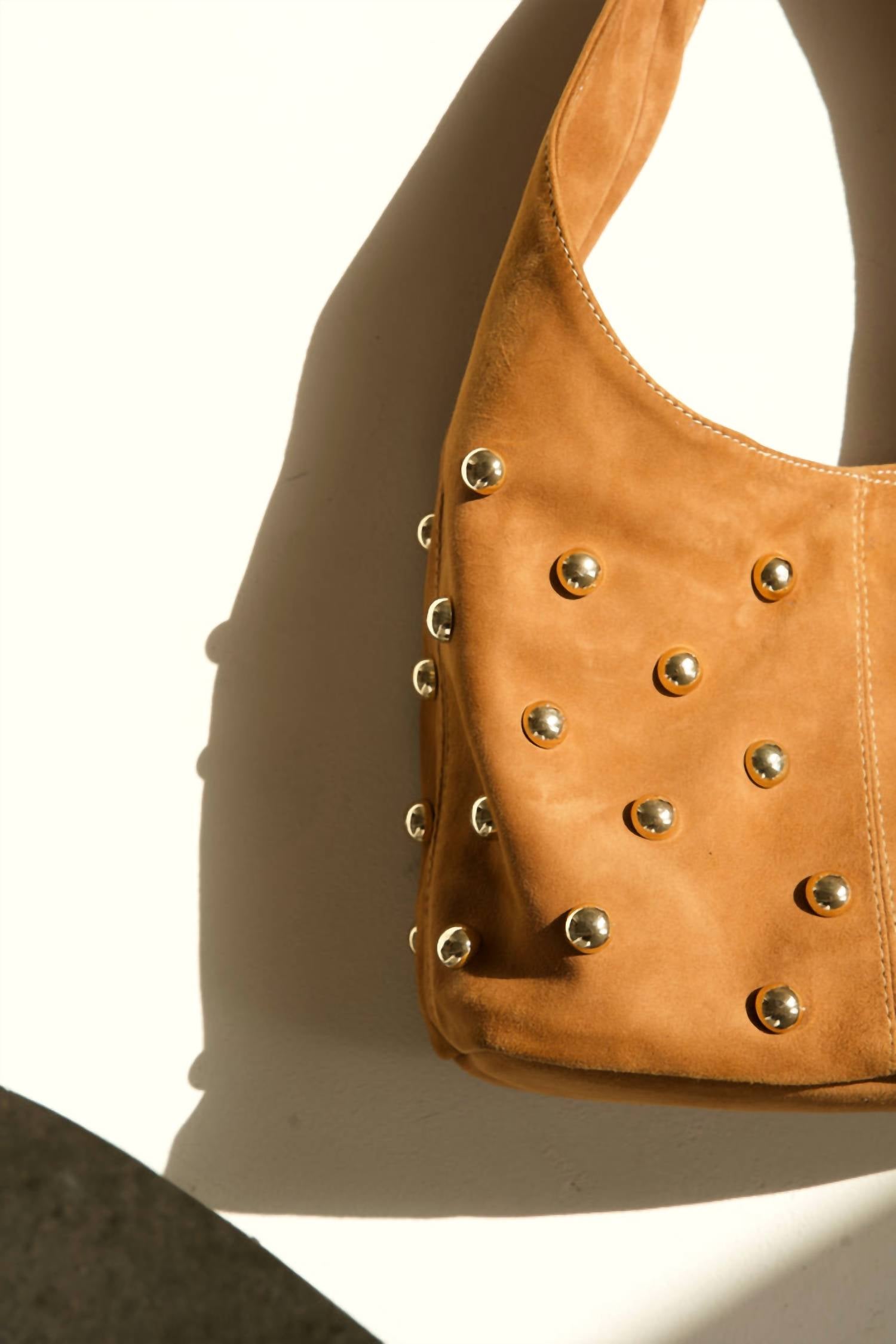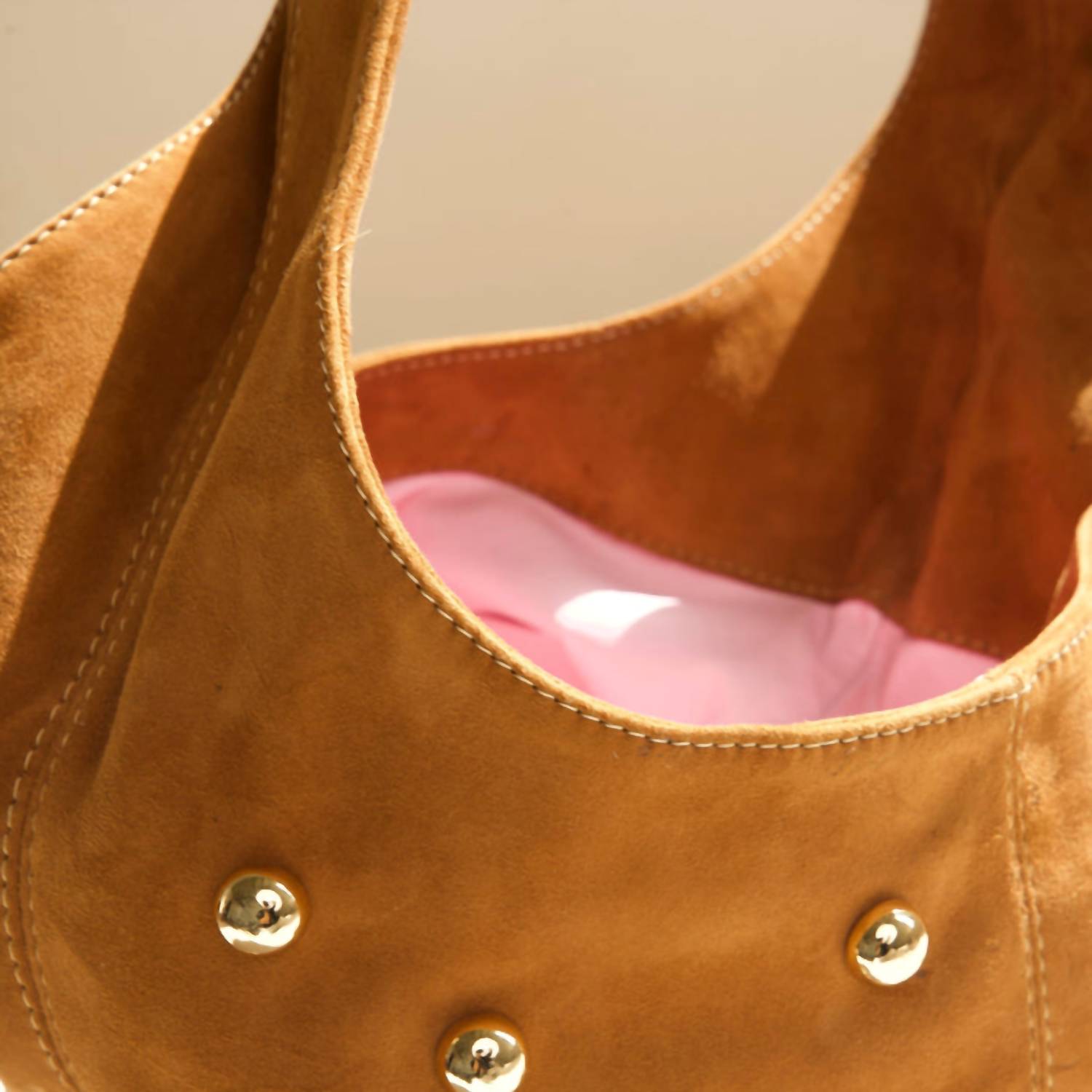 Introducing the Electra Shoulder Bag by Vicson, a statement piece in tan that merges edgy elegance with practical design. This bag is expertly crafted from premium leather and adorned with studs, offering a daring yet sophisticated aesthetic. Made in Brazil, it features a luxurious leather lining in signature baby pink, measuring 12.6" in width and 15.75" in height for ample storage space. Embrace versatility and style as the bag comfortably rests over your shoulder.