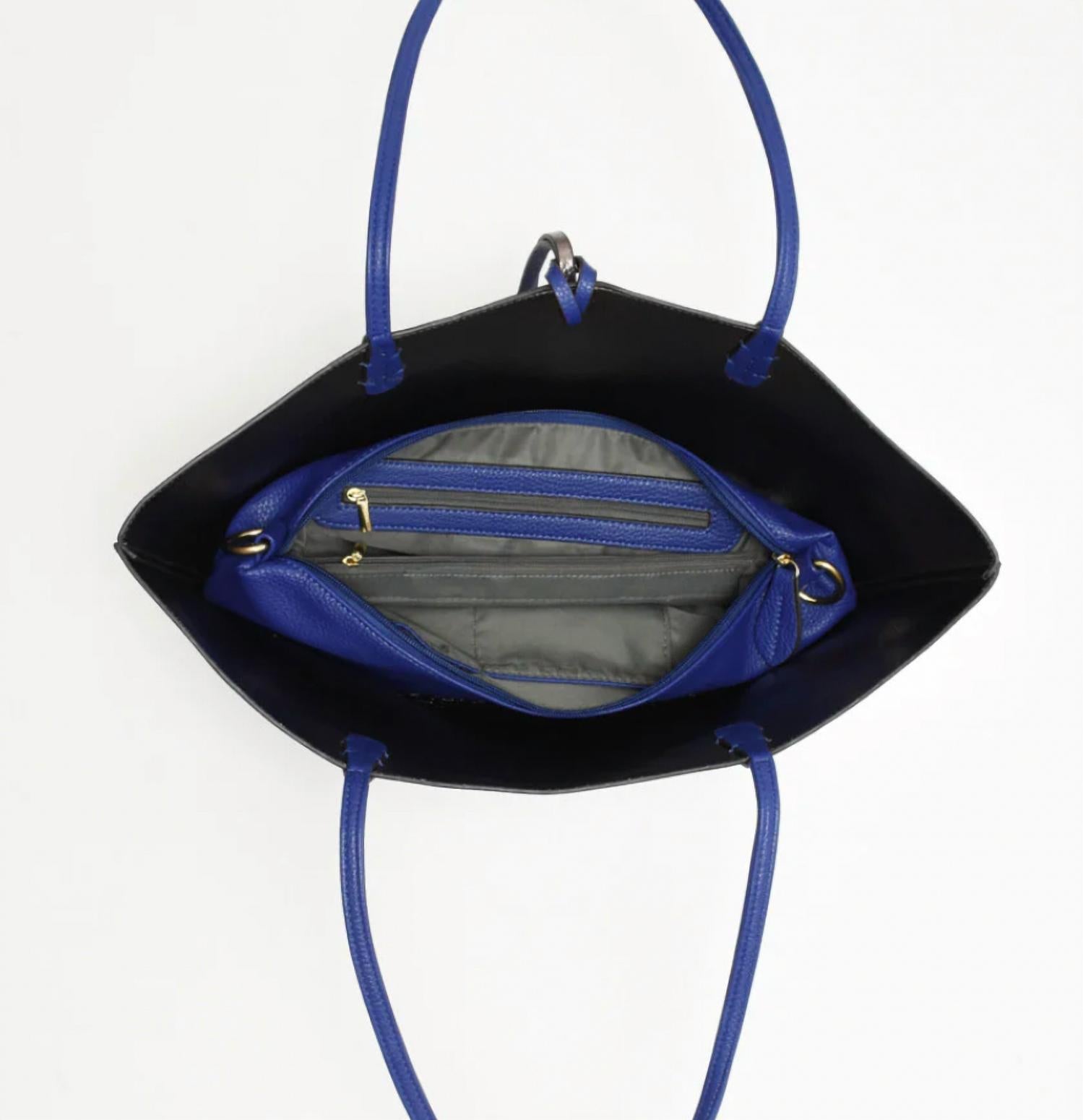 Introducing the Women's Departure Reversible Tote With Crossbody Pouch Bag by REMI/REID, a versatile addition to any accessory collection. Crafted from imported vegan leather, this tote in royal blue and anthracite features bronze hardware and a reversible design, offering style versatility. It includes a removable security pouch with a crossbody strap for added convenience. Dimensions are 11" in height, 16.5" in width, 4.5" in depth, with a 10" strap drop, making it both stylish and functional.