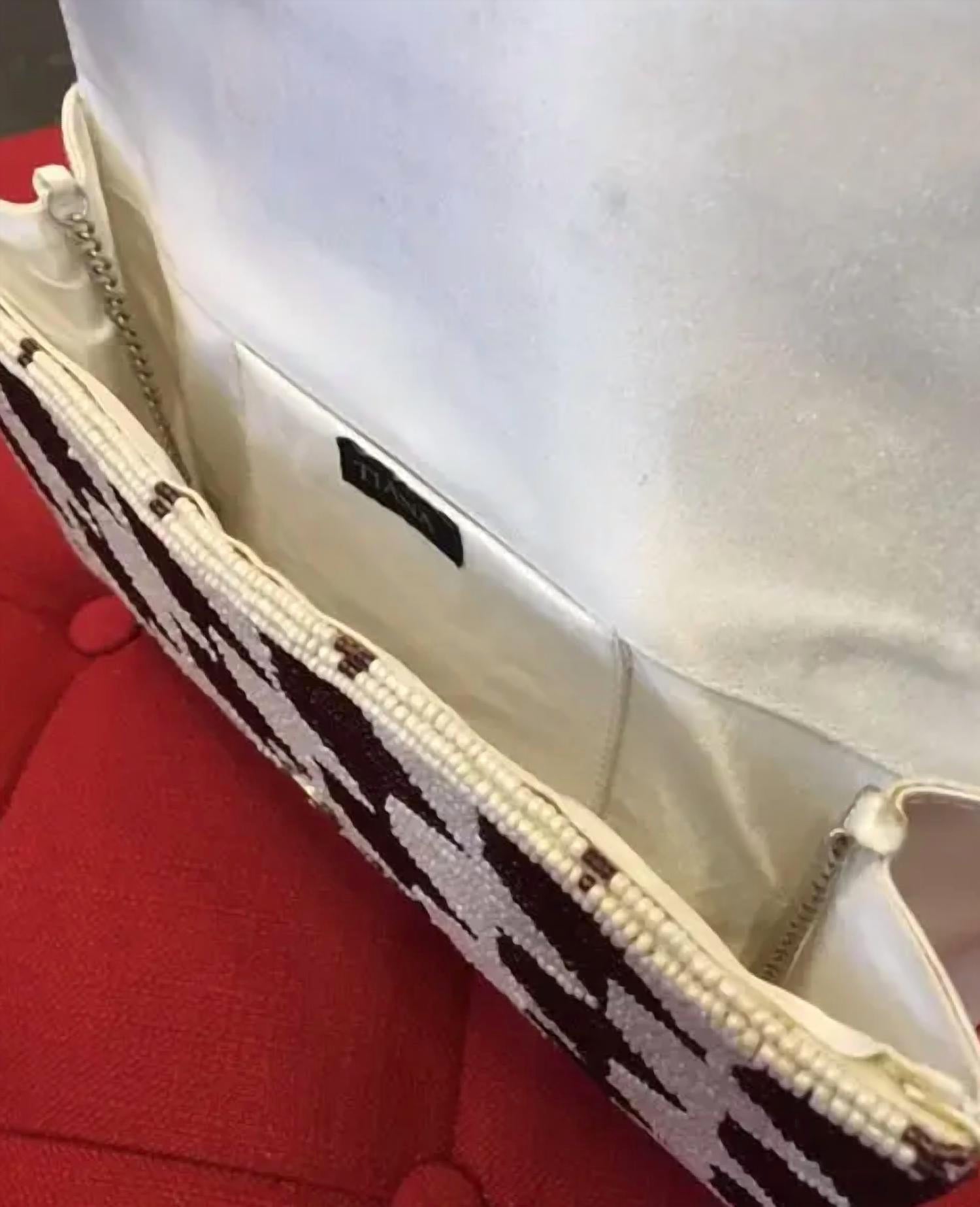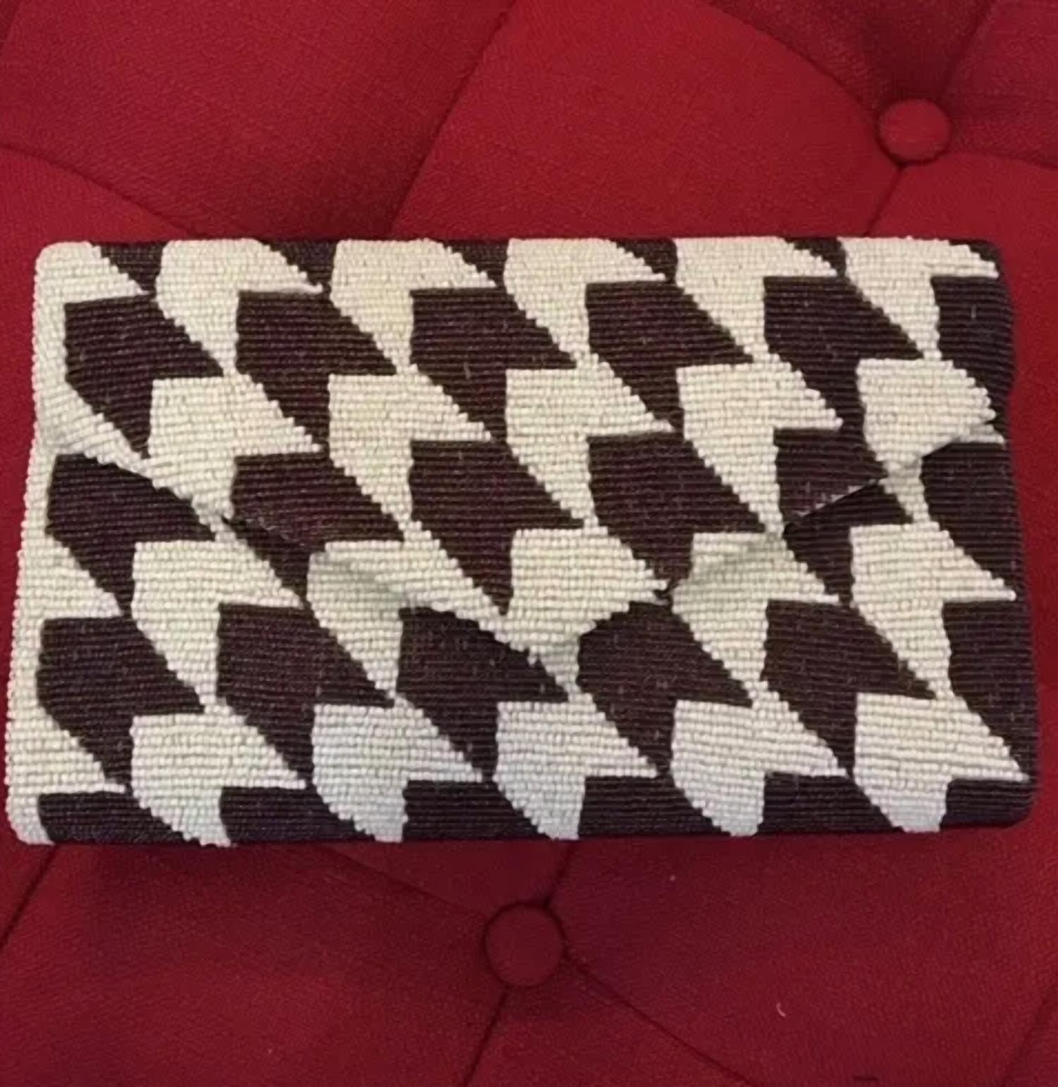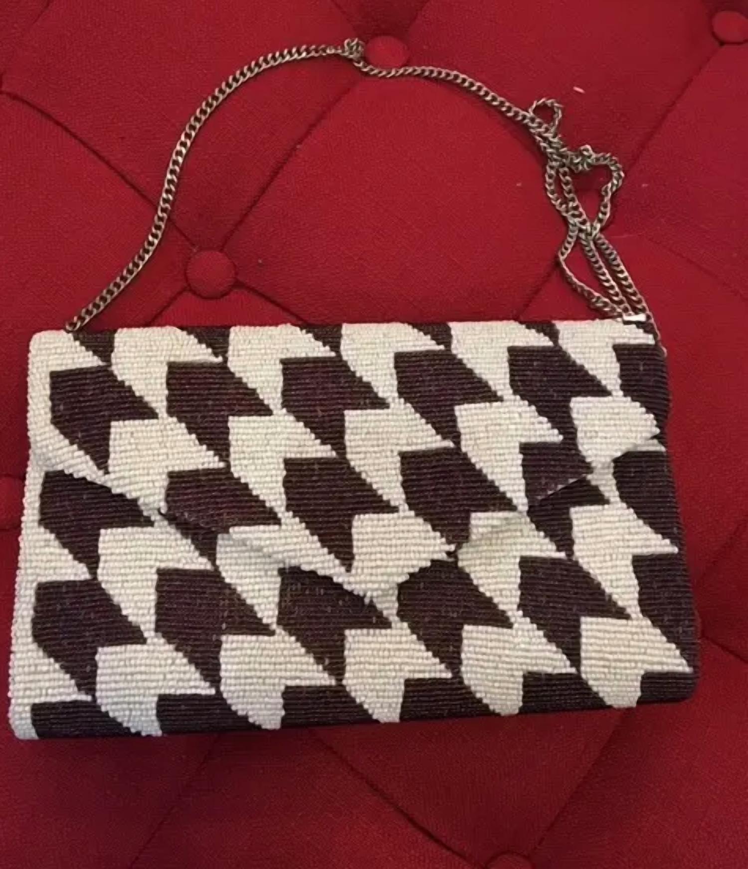 Cute enough to dress up or wear with jeans. Beaded handbag in ivory/aubergine large houndstooth pattern. Includes silver strap or carry it as a clutch. Size: 10″ by 6 1/2″.