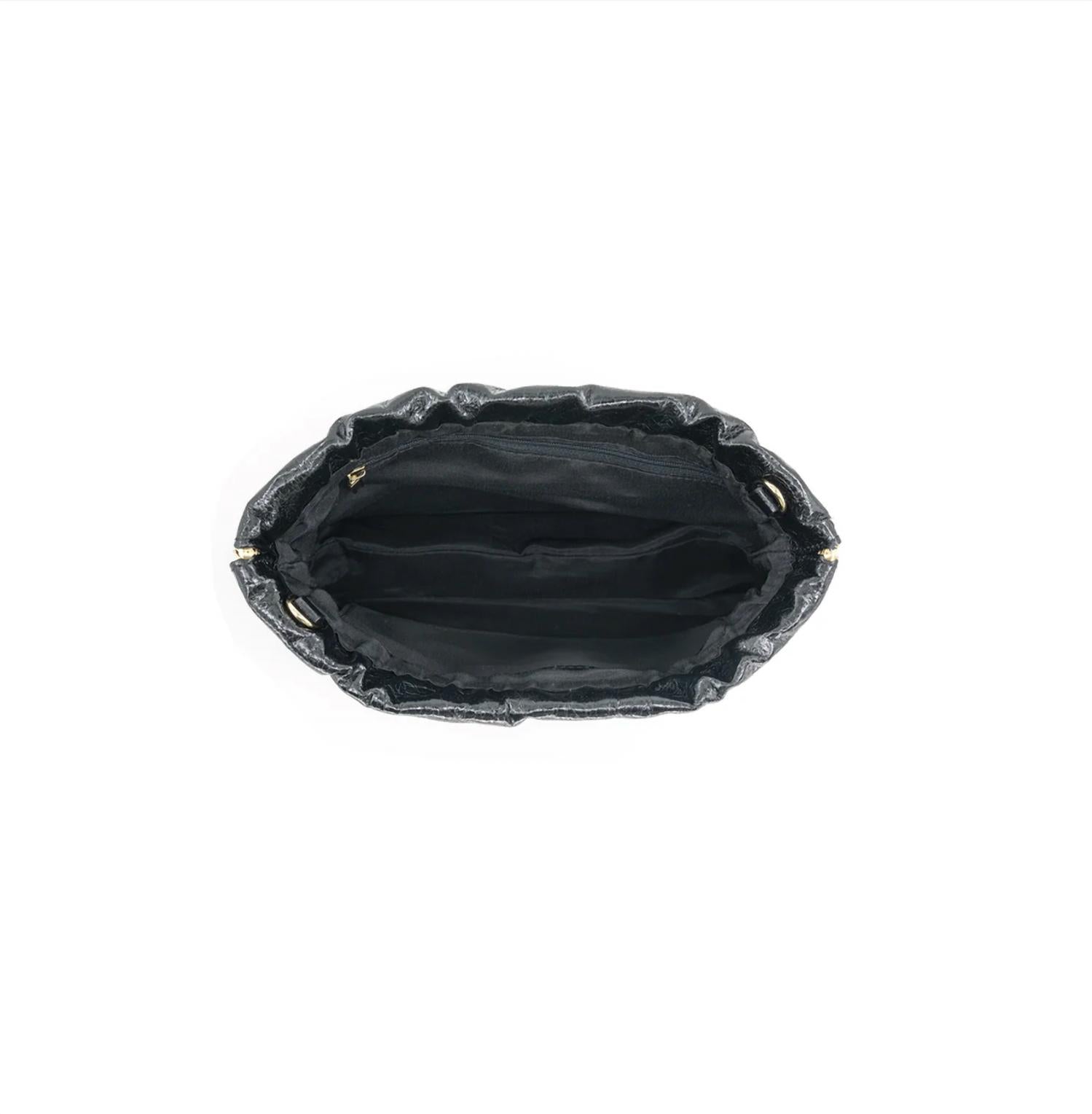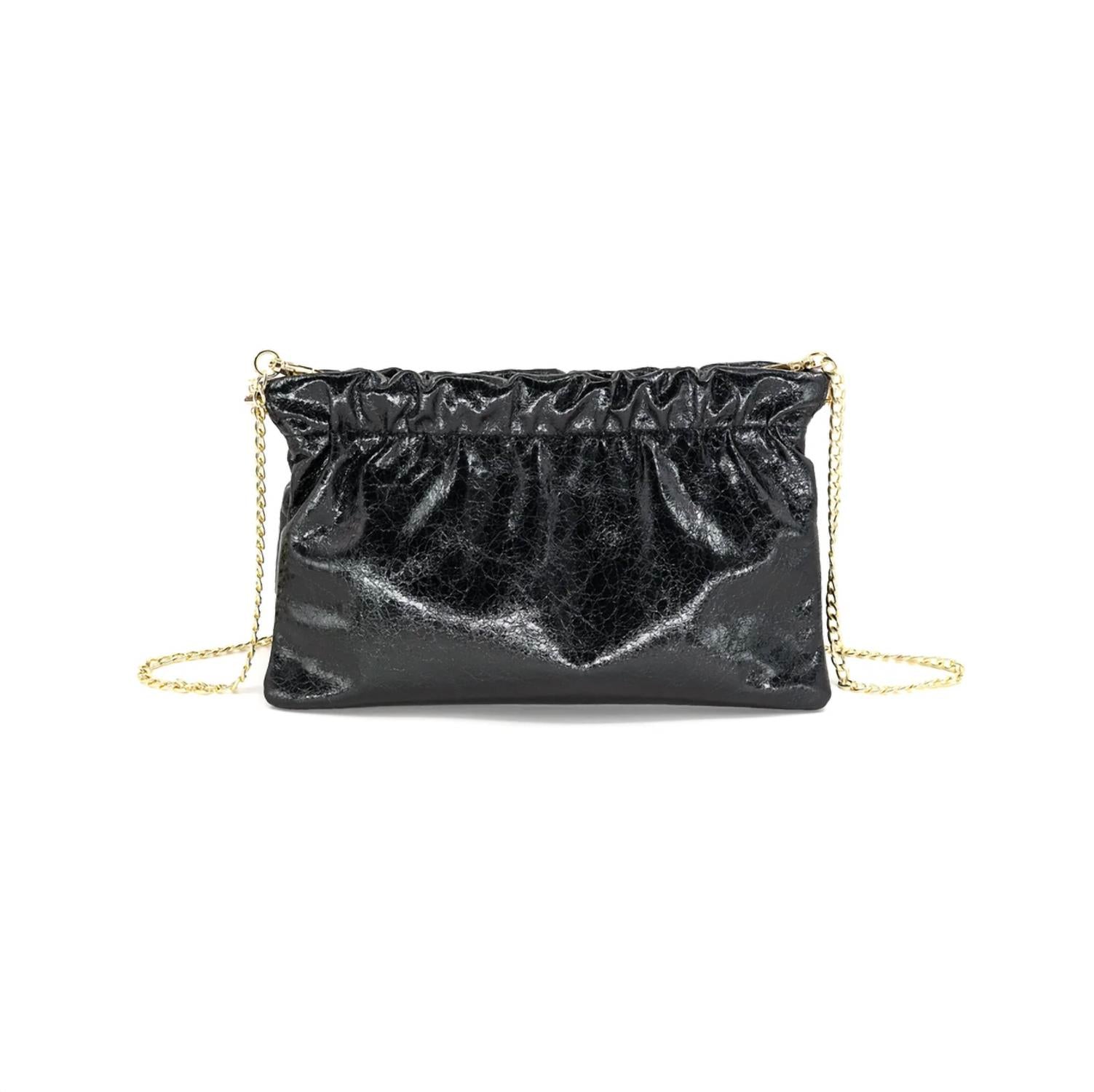 Introducing the Loren Classic Gathered Clutch by BC Handbags, an elegant accessory in timeless black. Crafted from premium faux leather, this versatile clutch includes a chain strap for convenient wear as a shoulder bag or crossbody. Measuring 12 x 7.5 x 1 inches, it offers just the right amount of space for essentials during a night out. Embrace understated luxury with this chic, adaptable piece.