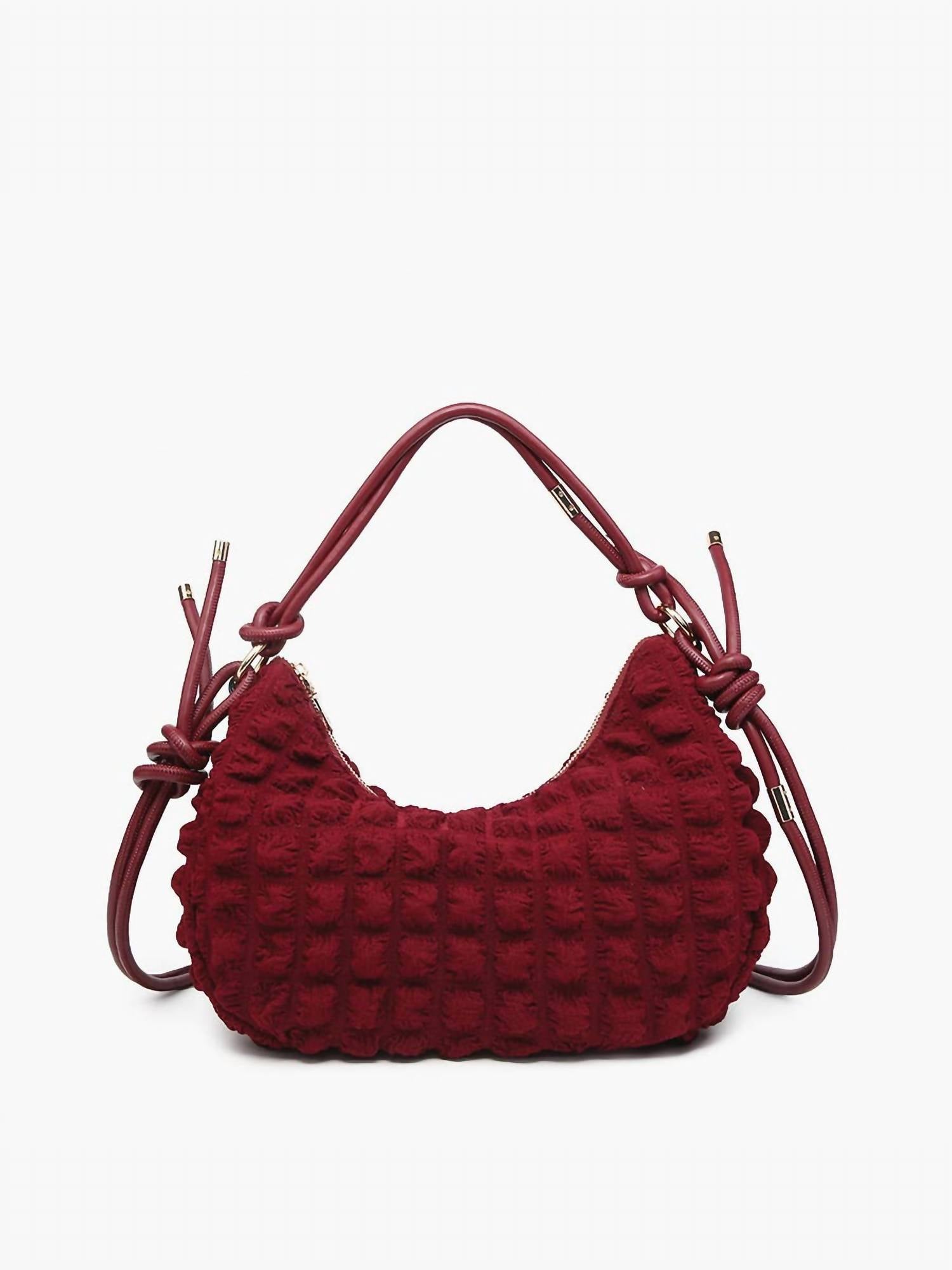 Experience fashion and function with the Women's Nelly Quilted Puffy Shoulder Crossbody Bag by Jen & Co., a chic statement piece in striking wine. Crafted with a soft quilted design, this bag features a unique knotted crossbody strap and handle with a metal accent, offering both style and comfort. The top zip closure ensures your essentials stay secure without compromising on 'wow' factor. With dimensions of 13 inches in length, 9 inches in height, and 5 inches in depth, it offers ample space for everyday necessities.