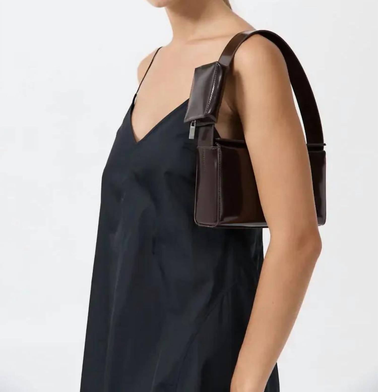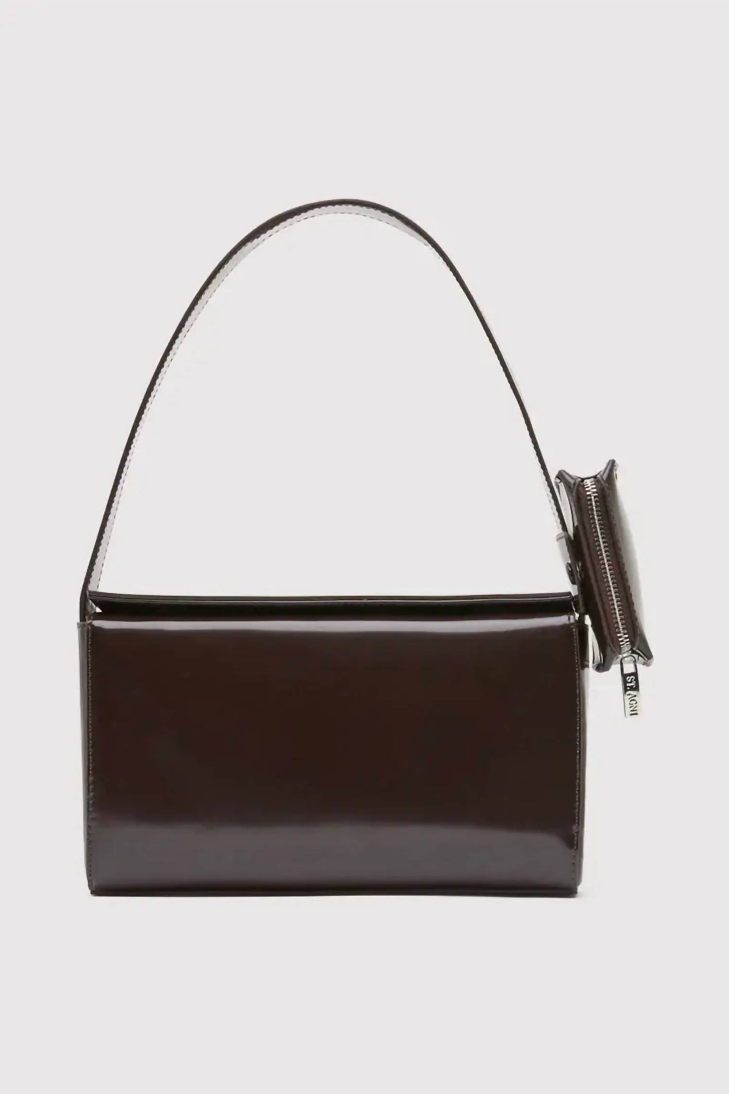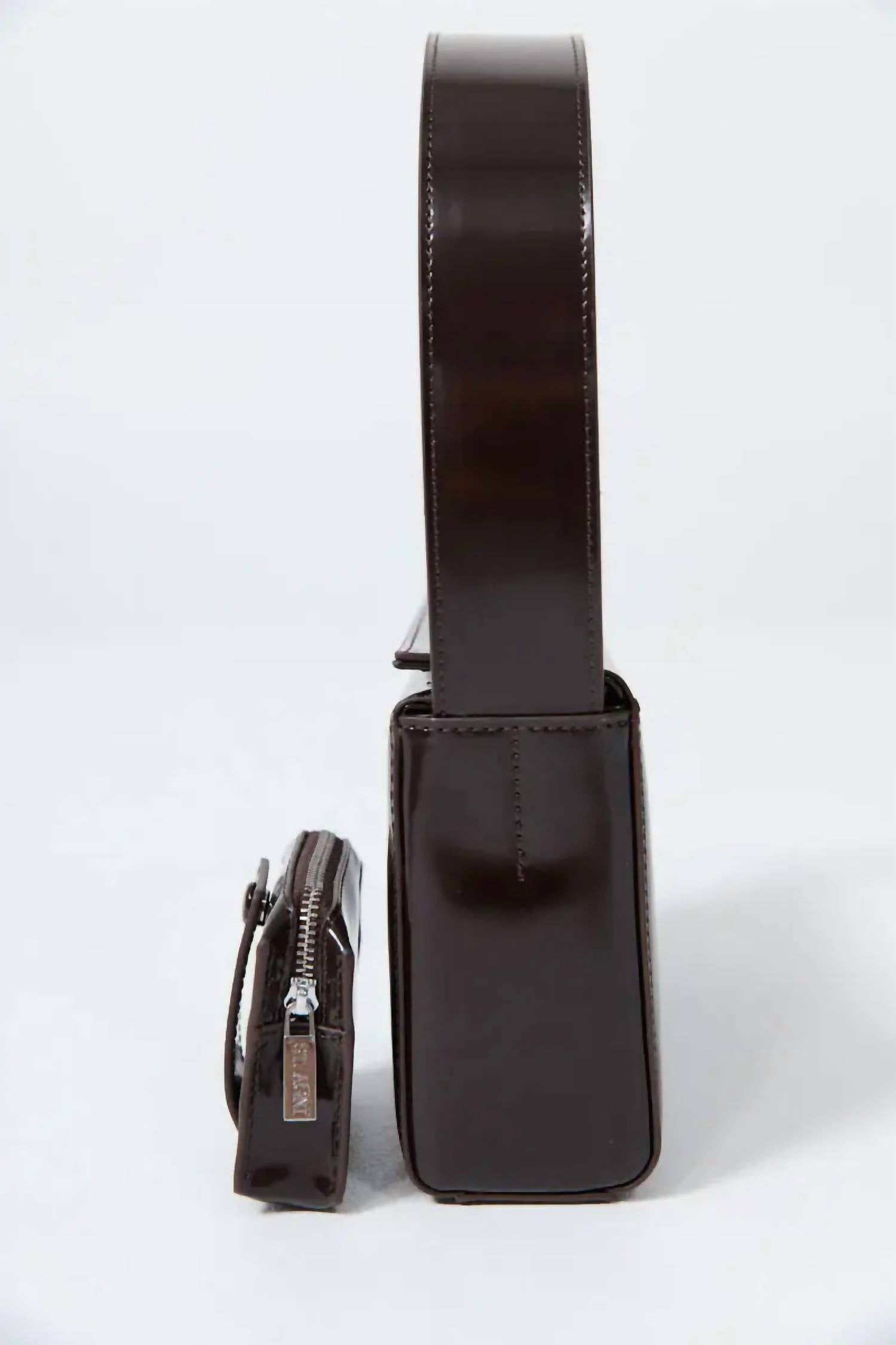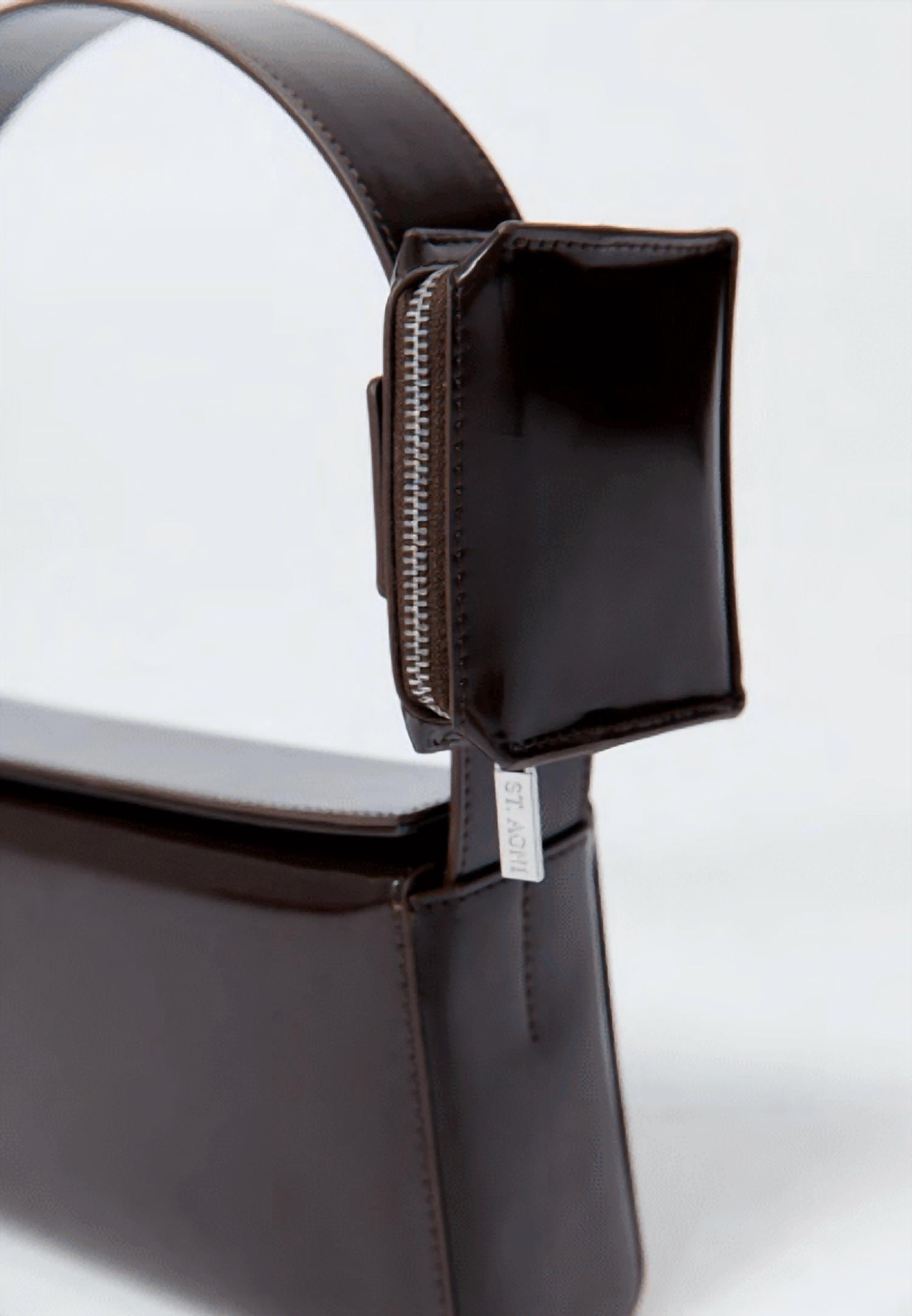 Introducing the Women's Petit Pouch Bag by St. Agni, a sculptural mini shoulder bag in an elegant coffee shade. Crafted from 100% Bovine Leather with a semi-sheen finish, this compact bag includes a detachable zipper pouch and a top fold magnetic closure for effortless functionality. Lined in 100% cotton, it is responsibly made in China and carries the Leather Working Group (LWG) Certification. Care includes treating with a natural leather protector, conditioning regularly, and avoiding water exposure and direct sunlight.