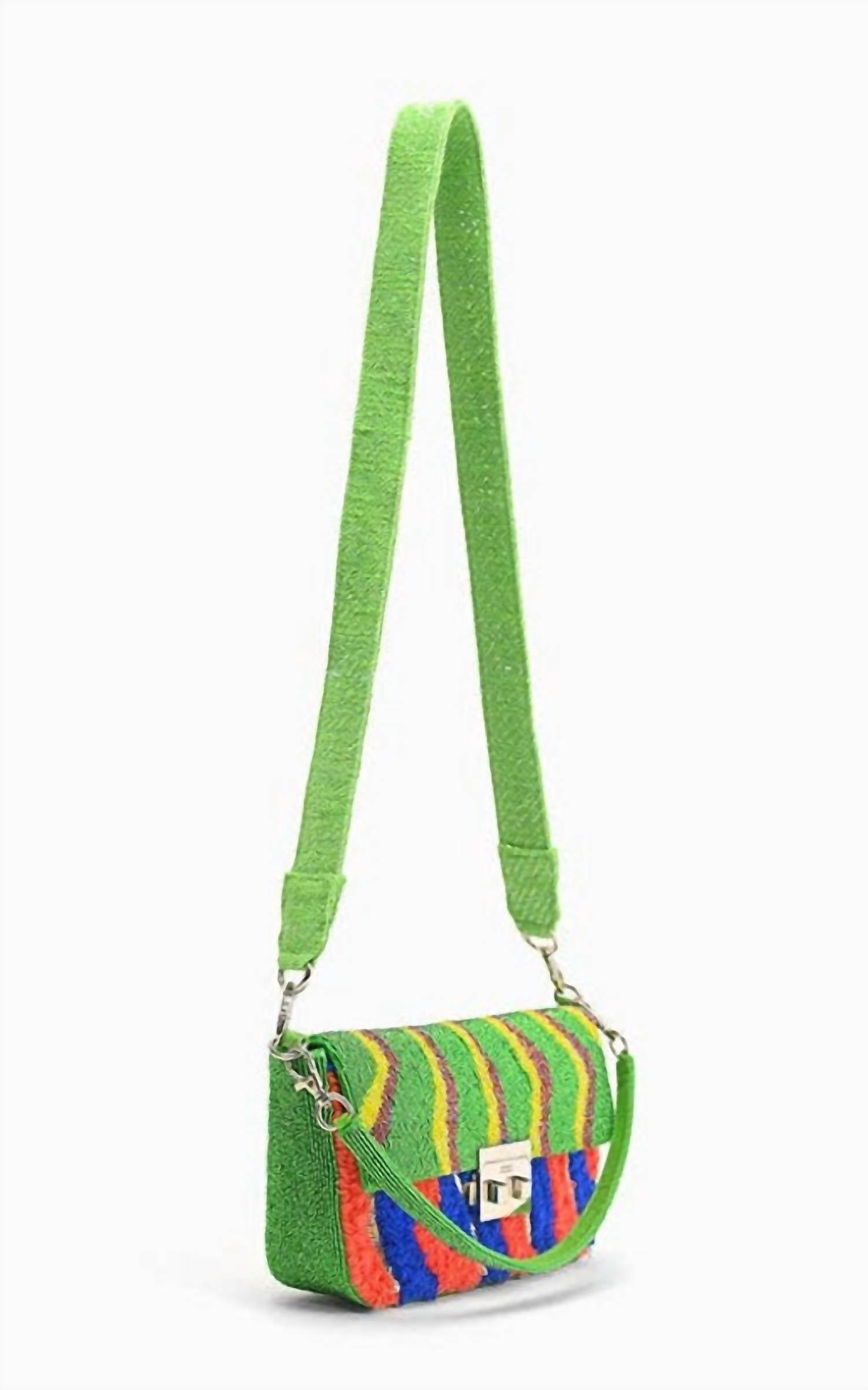 This bag features a stylish dual-handle design, including a top beaded handle and a detachable shoulder strap, ensuring versatility and comfort. The padlock mini clasp closure provides secure storage, complemented by the lined interiors and a zip pocket. With beautiful embellishments and embroidery adorning the front, this bag measures 10" x 5" x 2", complete with a 40" x 1.25" size belt.