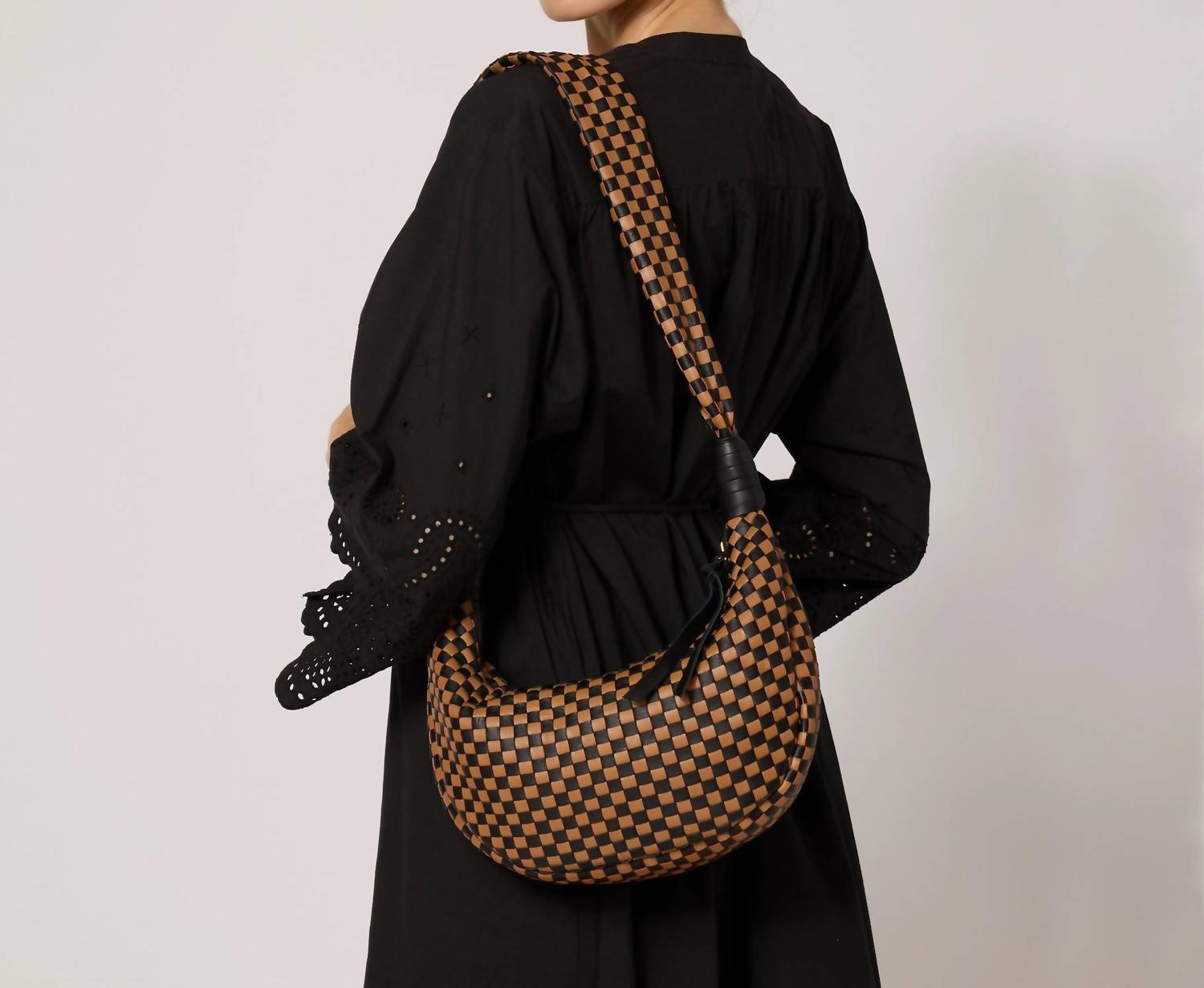 Discover the Dylan Woven Handbag by Cleobella, a stunning piece in Brown Multi, skillfully handwoven from lamb leather. This shoulder bag is ethically made in Bali, featuring an interior zippered pocket and a practical crossbody strap for versatile use. Dimensions are thoughtfully designed with a height of 7 inches and a width of 12.25 inches. Elevate any outfit with this artisanal blend of functionality and timeless style.