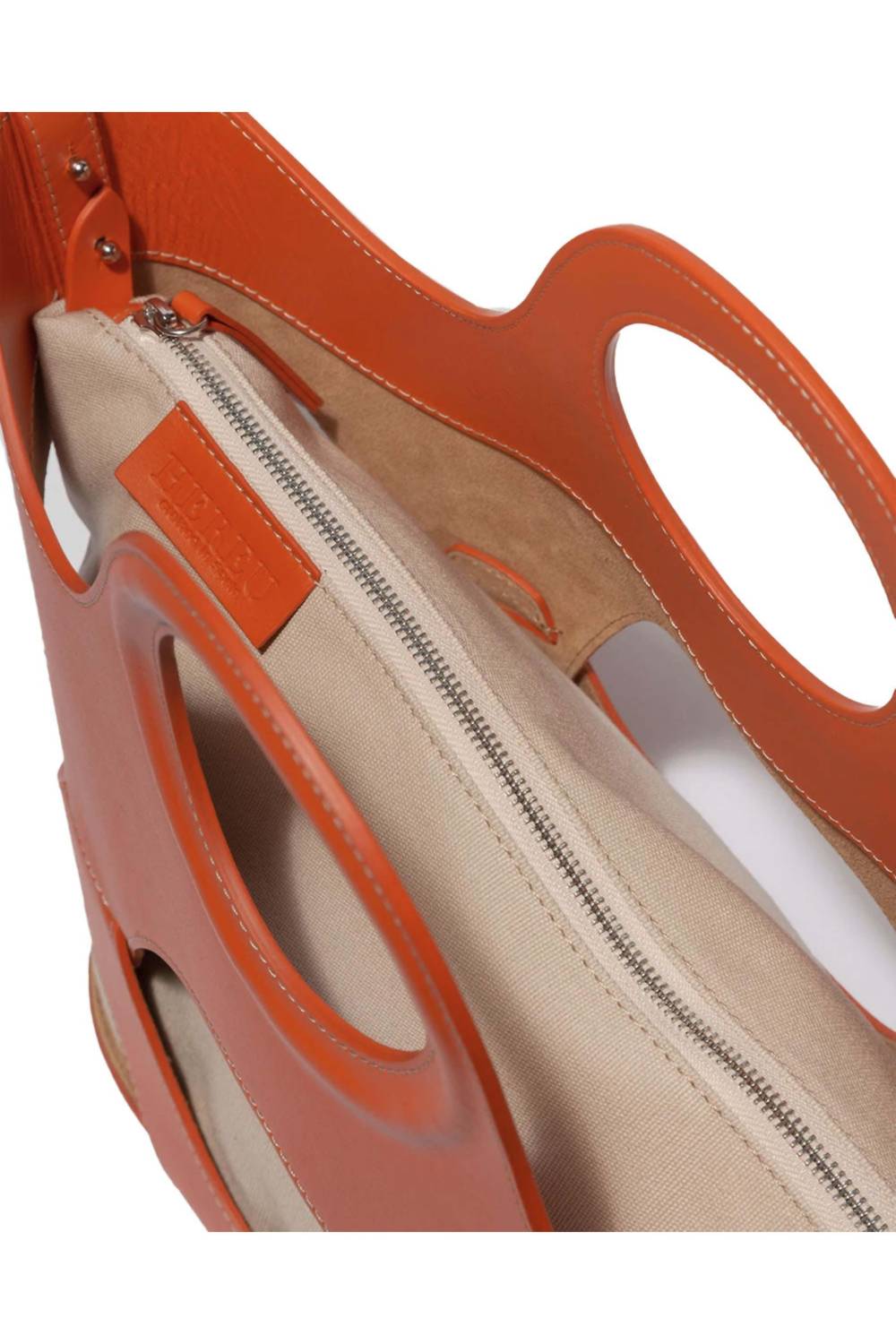 Elevate your accessory game with the Women's Hereu Onada Tote Bag, showcasing a striking orange and canvas design. Crafted from smooth calf leather with a distinctive basket silhouette and circular cut-out handles, this bag is a testament to Spanish craftsmanship. It features a removable shoulder strap, measuring 113 cm, and comes with a detachable organic canvas zipped pouch. Approximate dimensions are 46 x 26 x 18 cm with a handle drop of 13 cm, ensuring ample space for all your essentials.