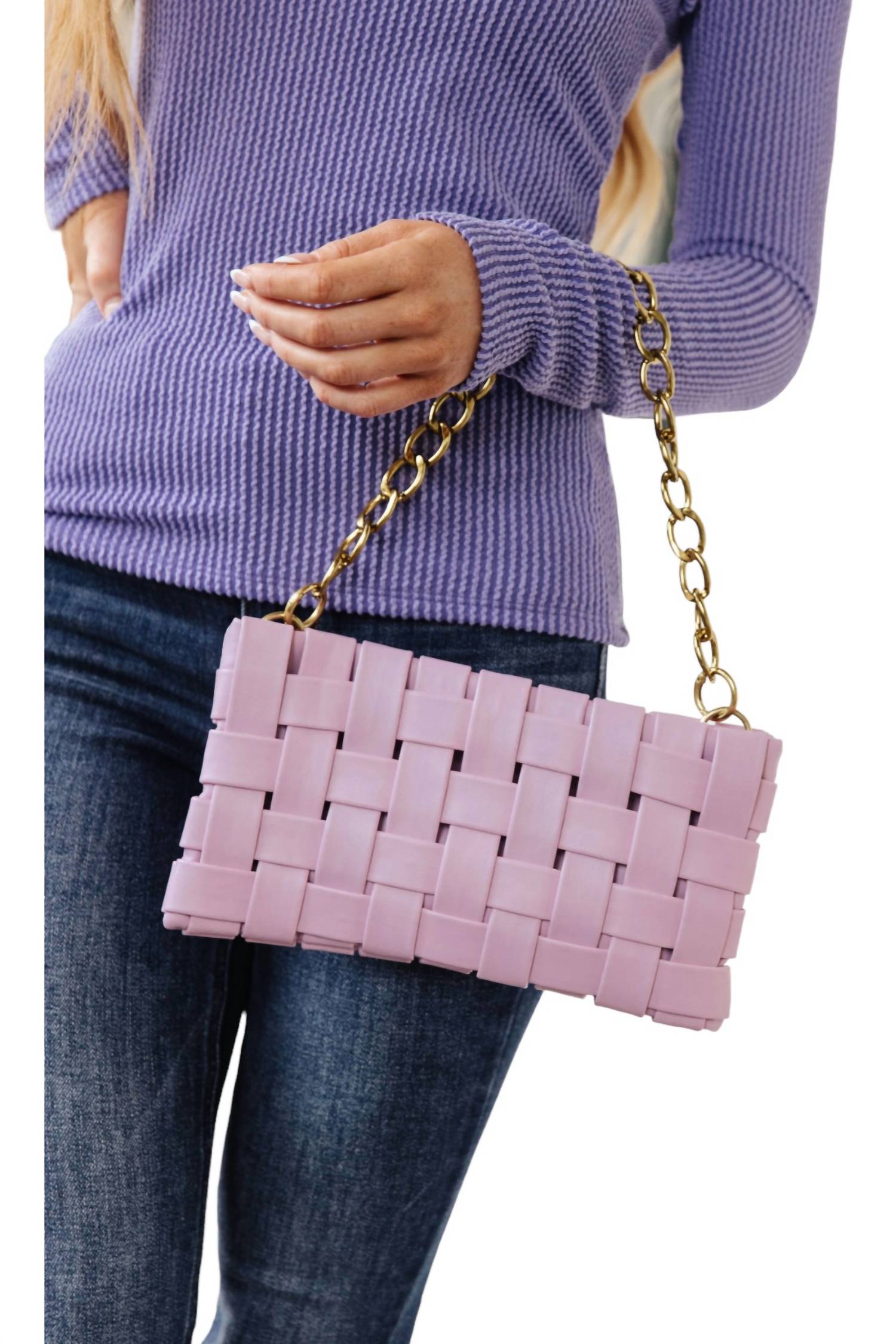 Sophisticated lilac hue. Timeless elegance with modern versatility. Crafted from luxurious basket weave faux leather that exudes classic charm. Equipped with two chic strap options. Brushed gold hand bag strap. Adjustable faux shoulder strap. Features a secure zipper closure. Inside pocket. Measuring 11" by 6". Combines both style and practicality.