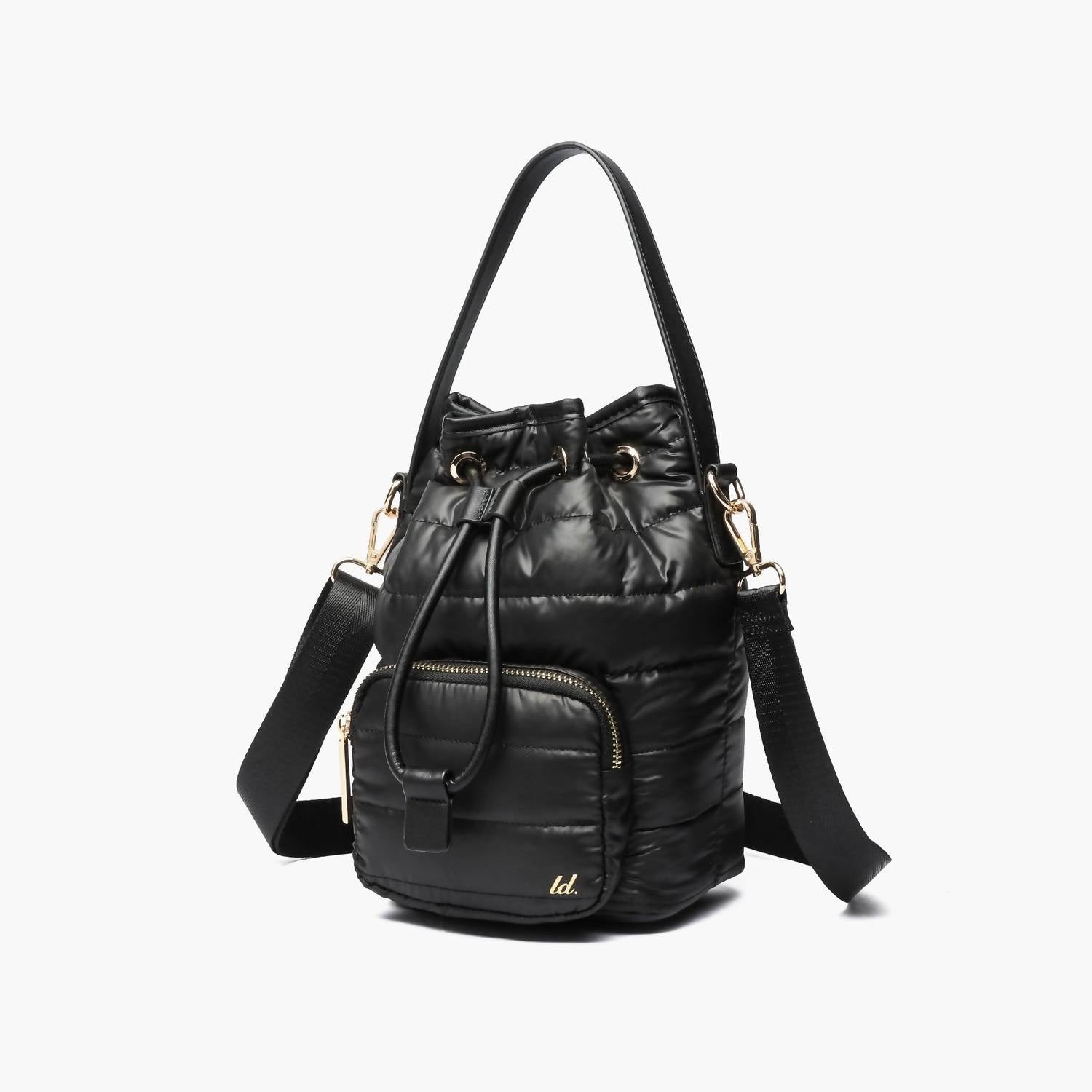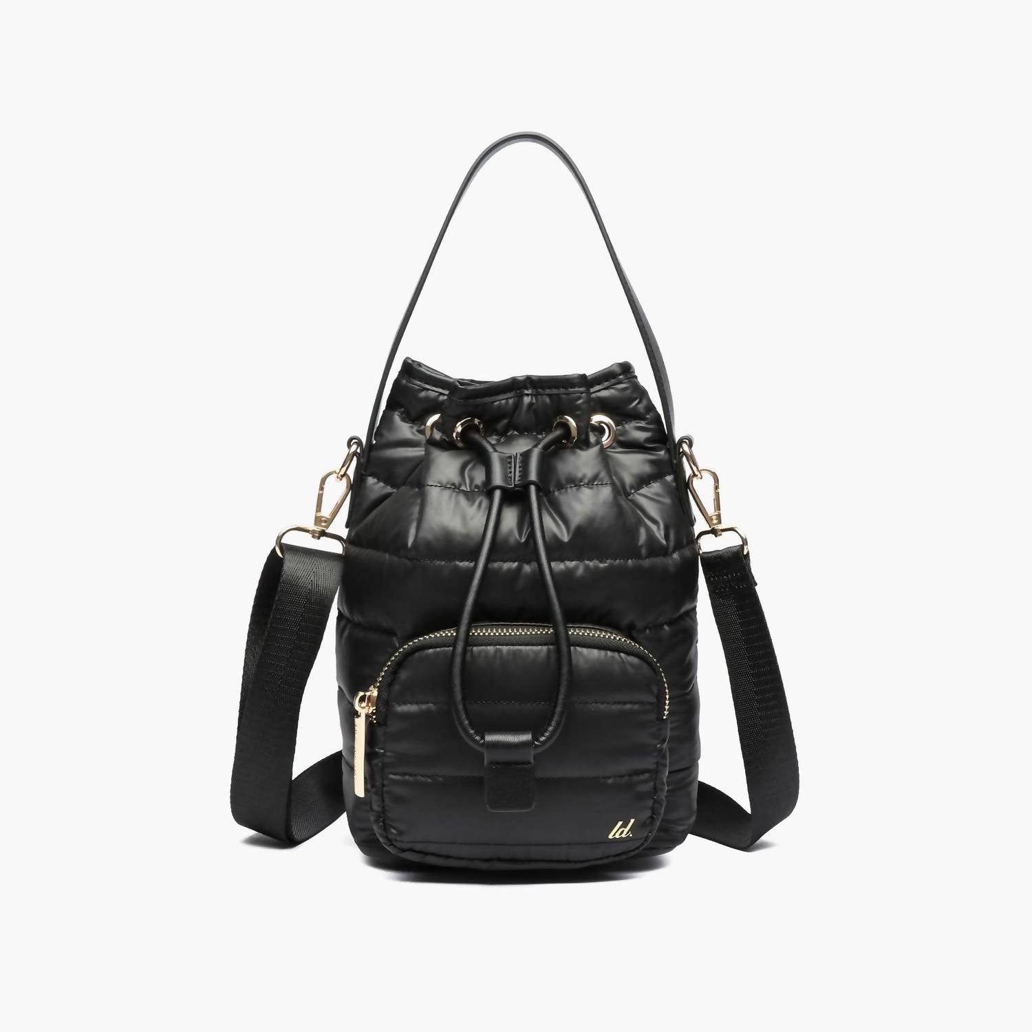Introducing the Women's Lucky Quilted Puffer Bucket Crossbody Bag by Like Dreams in classic black, perfect for the chilly Fall and Winter season. Crafted from quilted nylon plush, this bag features a front drawstring closure with an additional magnetic snap for added security. Designed for convenience, it includes inner and outer zip pockets and a detachable crossbody strap for versatile wear. With dimensions of 6.5" width, 9" height, and 6" depth and weighing only 9.6 oz, it is a stylish and practical accessory for everyday use.