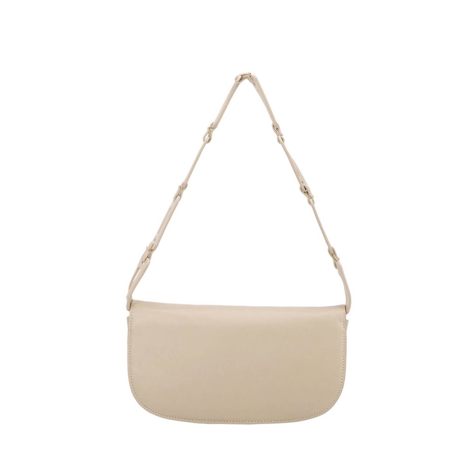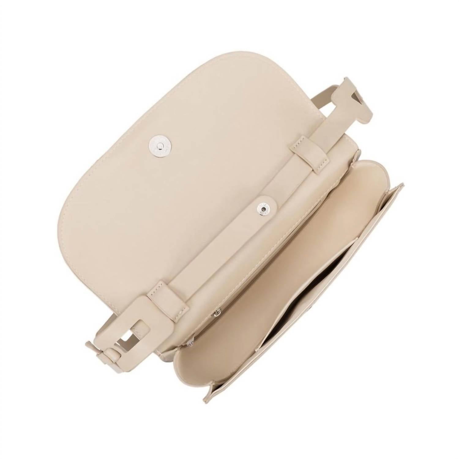 Discover the Women's Inez Recycled Vegan Shoulder Bag by Melie Bianco in an elegant Bone hue. Crafted from premium recycled vegan leather, this exquisite piece showcases a captivating scallop strap and a sleek crossbody option with lengths between 27.5" to 36.5" for versatile styling. Dimensions: 19.5"L x 2"W x 5"H; the bag features a magnetic snap closure and includes silver-tone hardware with interior zip and slip pockets that provide practical elegance. Designed to fit your essentials like an iPhone 11 Pro Max, it's both a stylish and eco-friendly choice for the conscious fashion enthusiast.