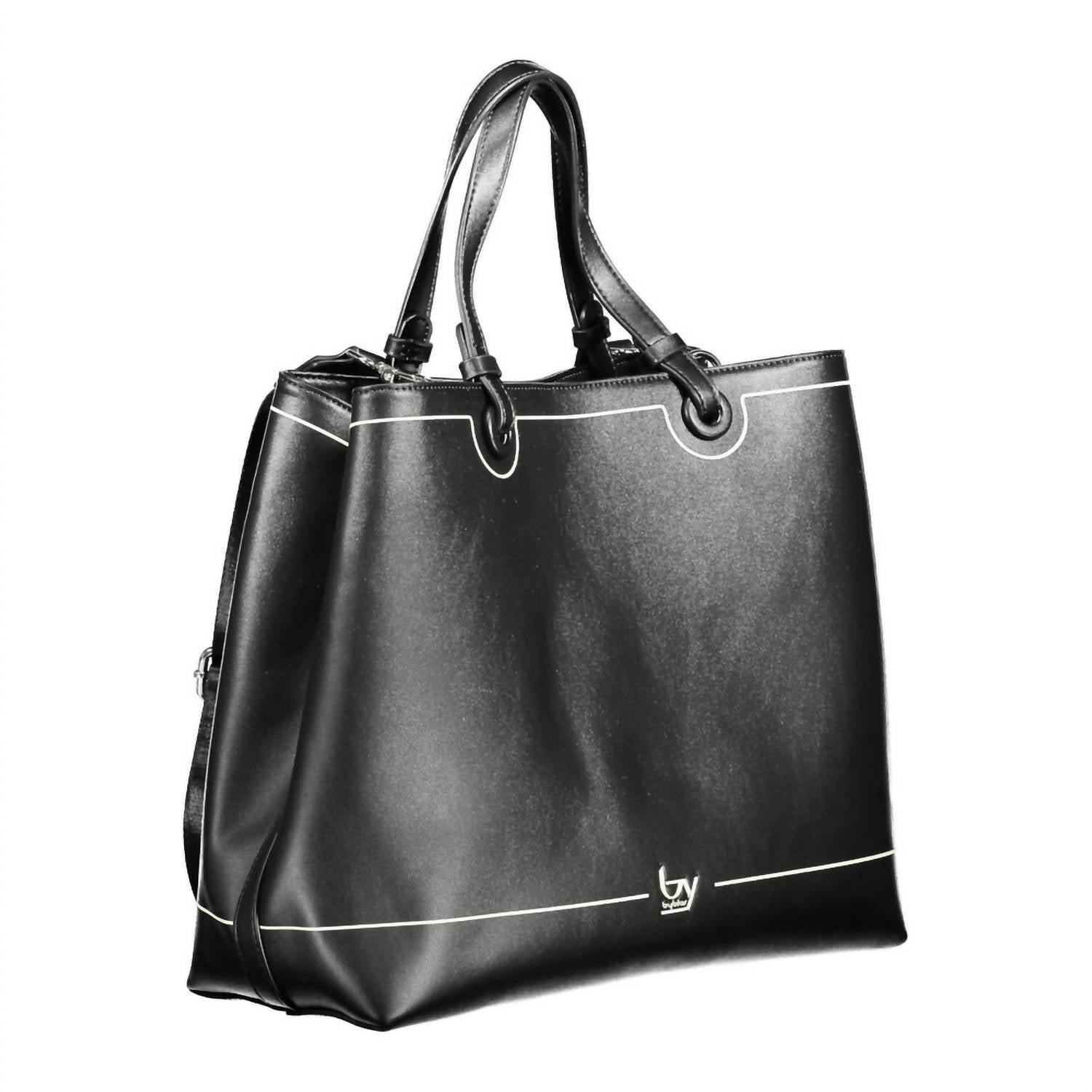 Introducing the Women's Polyethylene Handbag by Byblos, a striking black shoulder bag for every occasion. This bag features two handles, an adjustable and removable shoulder strap, and practical storage options with two compartments, a central pocket, and two internal pockets. Crafted from durable polyethylene, it is designed with contrasting details for added flair. Closure options include a zip and snap, complete with a signature logo.