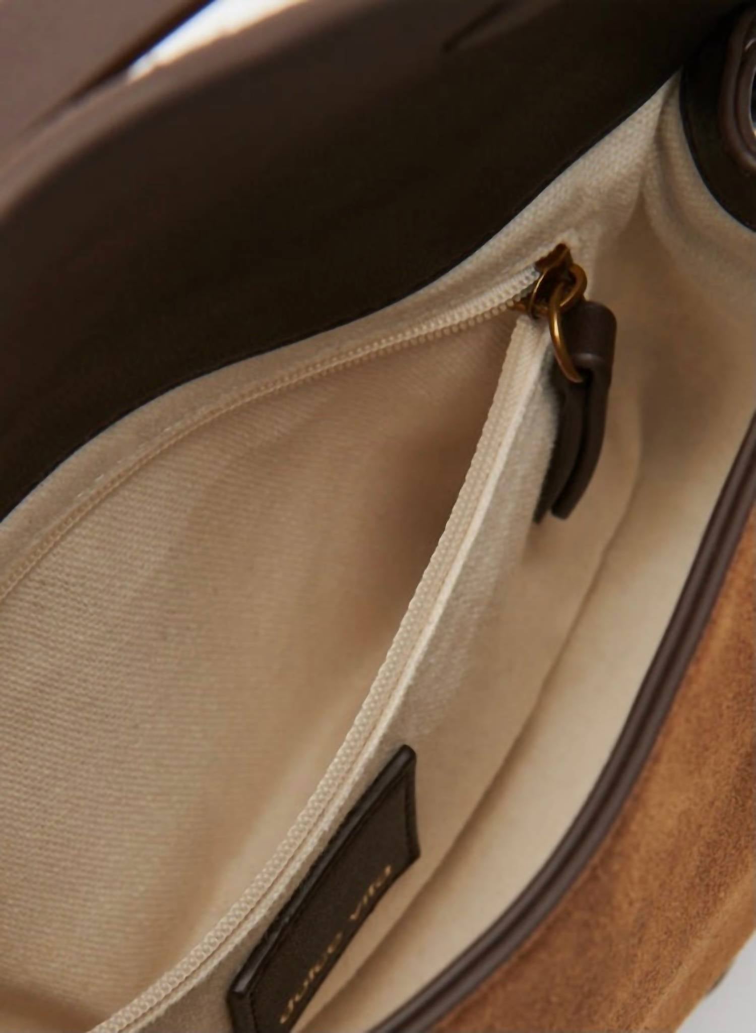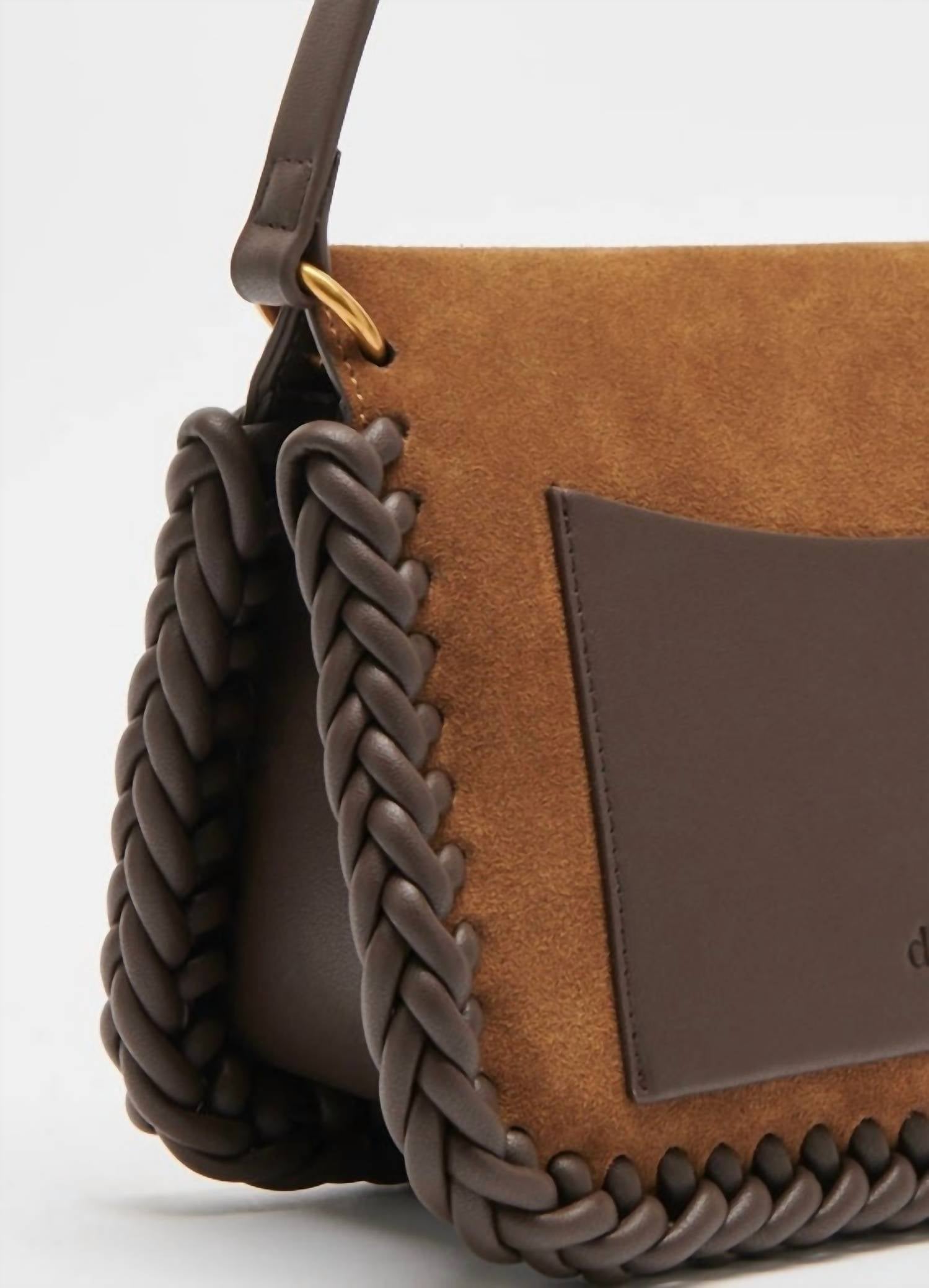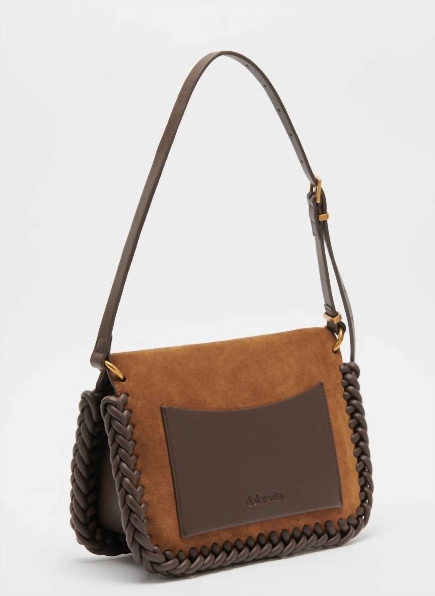Introducing the Harper Handbag by Dolce Vita, a perfect blend of classic elegance and laid-back style in Tobacco Suede. Crafted from genuine suede, this shoulder bag features a magnetic snap closure for easy access to your essentials. The bag's design includes a braided detail and adjustable strap for versatile carrying options, while its interior offers 1 slip pocket and 1 zipper pocket, with an additional exterior slip pocket for added convenience. Dimensions: 6.25" Height, 9.5" Width, 3.25" Depth.